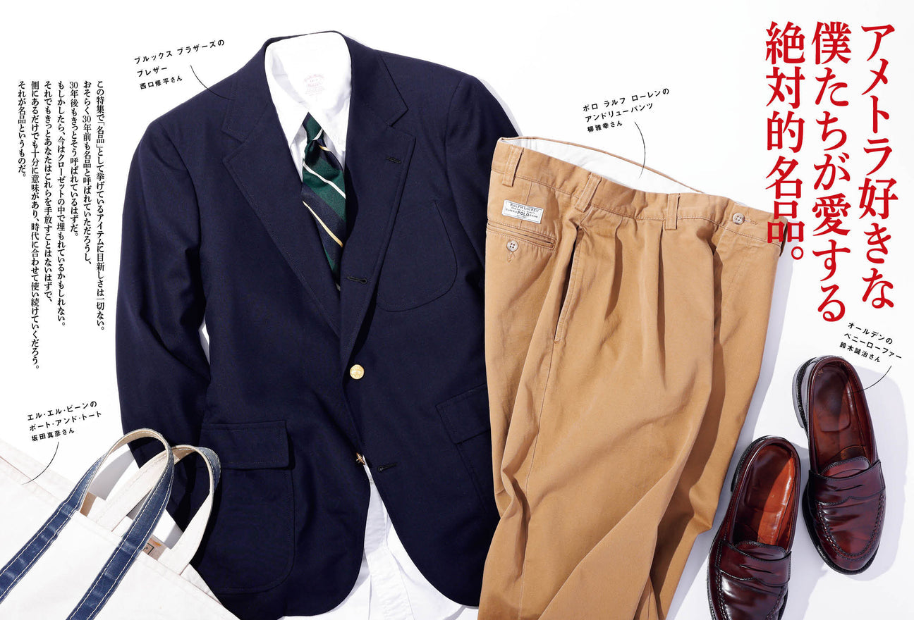 If you are an American traditional fan. you should know about the brands and their iconic items. In this month's issue. we will once again cover such classics and masterpieces. We have introduced American traditional masterpieces many times in this magazine. We will once again introduce items that have been loved by generations. Special feature "Absolute masterpieces loved by us American traditional fans." The first project is "AMETORA MASTERPIECE 20 masterpieces selected by traditional experts." We asked 20 traditional experts that we trust to tell us about the "masterpieces" of American traditional style. They told us about "absolute masterpieces" that will surely not change in the future. such as Brooks Brothers' BD shirts and Alden's penny loafers. And if there are masterpieces that will never change. there are also "hidden masterpieces" that have been born and could become masterpieces of the future. Our young editorial team investigated these and asked "Please tell us about the "hidden" masterpieces that you can buy now!" This issue also includes a special feature that delves deeply into American traditional fashion in 2024. such as the "American Traditional Brands 2024 Edition American Traditional Brand Encyclopedia." which covers well-established American traditional brands and Japanese brands that inherit their spirit. as well as an introduction to Brooks Brothers' new collection "JAPAN TRAD." and the label "PEG" by BEAMS PLUS and ENGINEERED GARMENTS. This is a must-have book for anyone aspiring to American traditional fashion. Please give it a read.