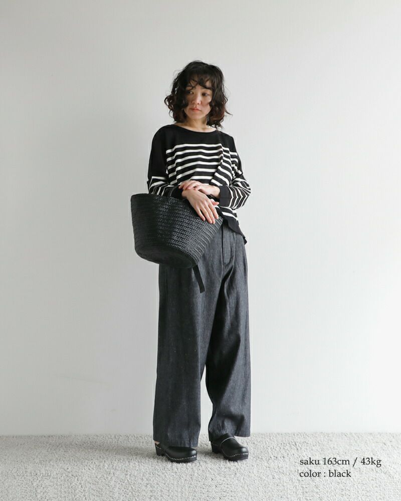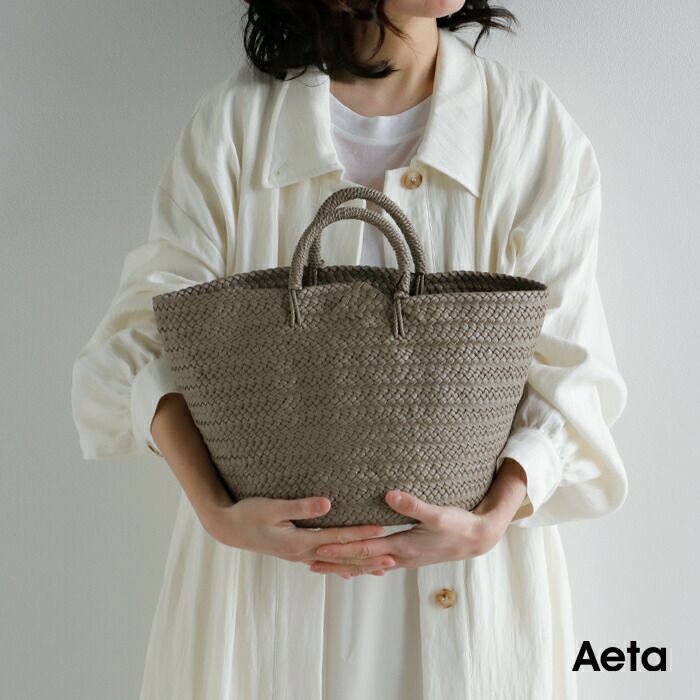 A long-selling basket bag for adults. Its simple design with no unnecessary details combines storage capacity with a sophisticated feel. Made from high-quality leather. it can be used in any season. and the more you use it. the more it will look its best. The leather is bonded together and woven. so it's beautiful even on the inside. The sturdy base allows it to stand on its own. and you can see inside. making it easy to use. The short handle is so cute!