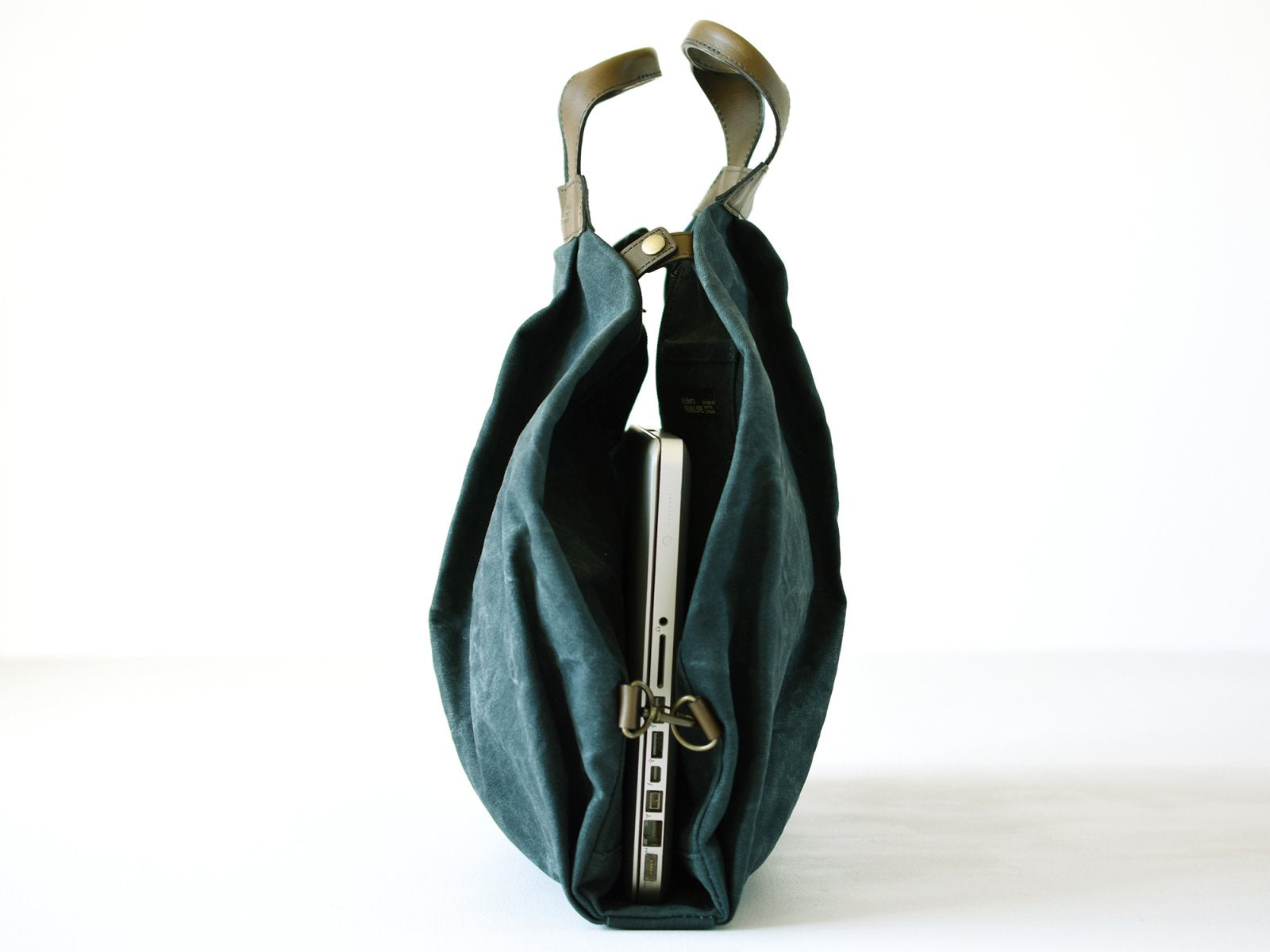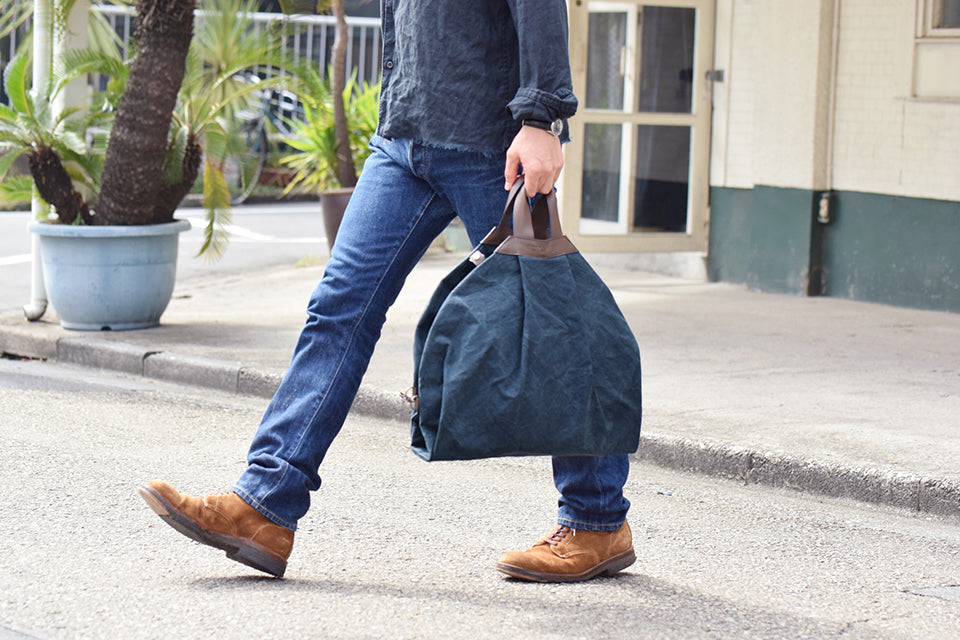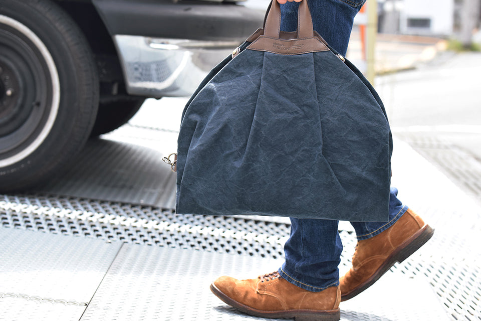 The tote made of No. 9 canvas looks like a garment bag at first glance. but it has a separate bottom with a switch in the center. The bag can be used according to your lifestyle by inserting documents. notebooks. etc. between the body parts by jointing the metal fittings for fixing. Each side has a patch pocket for easy access to small items such as cell phones and passcases. The unique form is named "Beetle" because of its beetle-like appearance.