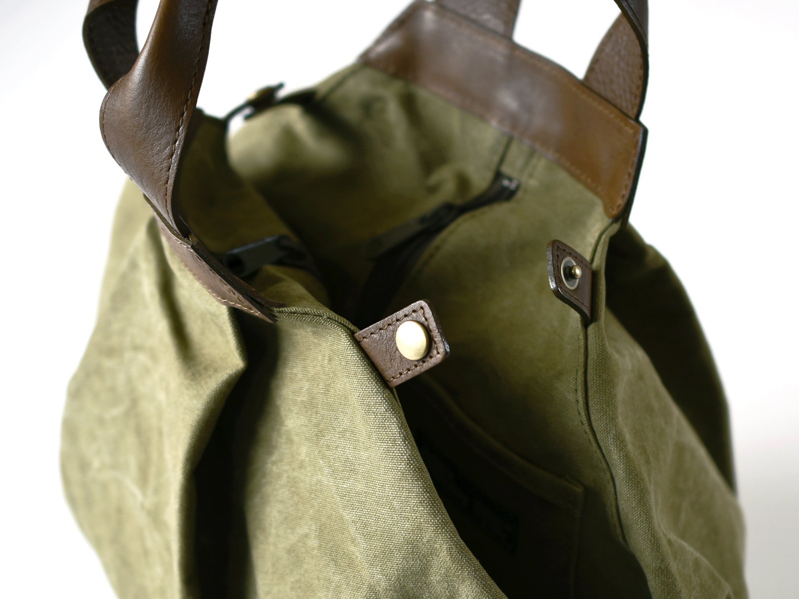 The tote made of No. 9 canvas looks like a garment bag at first glance. but it has a separate bottom with a switch in the center. The bag can be used according to your lifestyle by inserting documents. notebooks. etc. between the body parts by jointing the metal fittings for fixing. Each side has a patch pocket for easy access to small items such as cell phones and passcases. The unique form is named "Beetle" because of its beetle-like appearance.