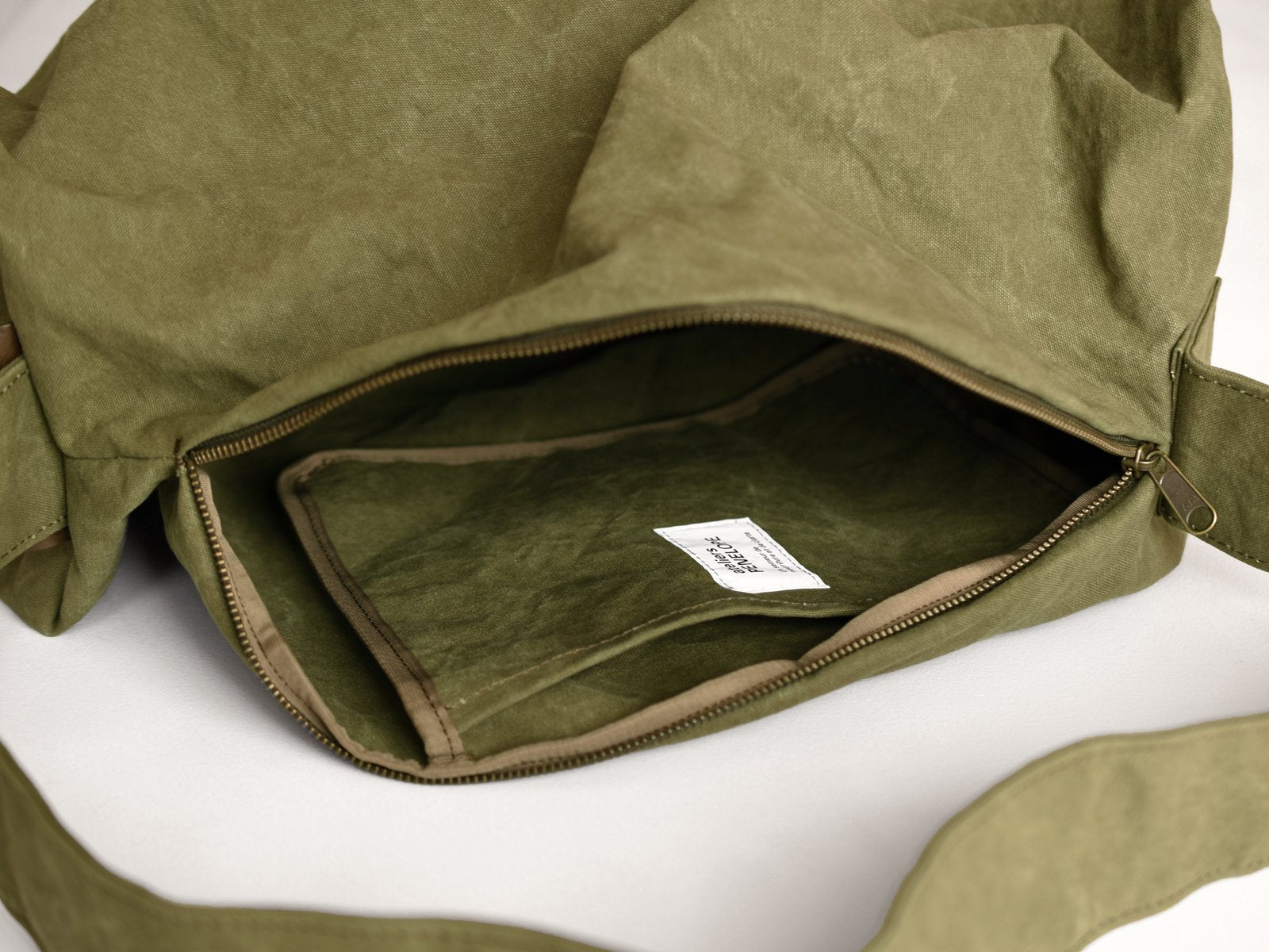 The mouth of the bag has a vertical zipper closure. and there is an inside pocket.