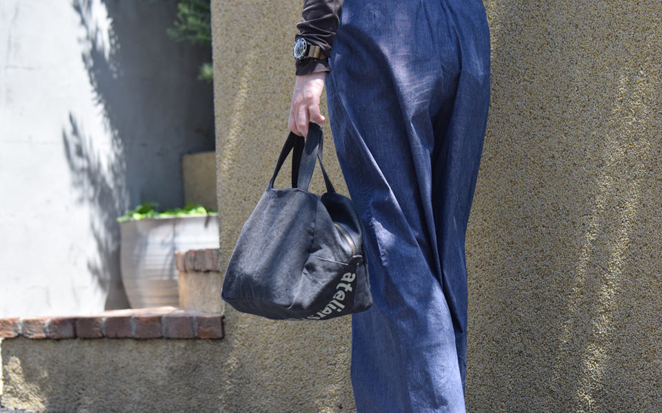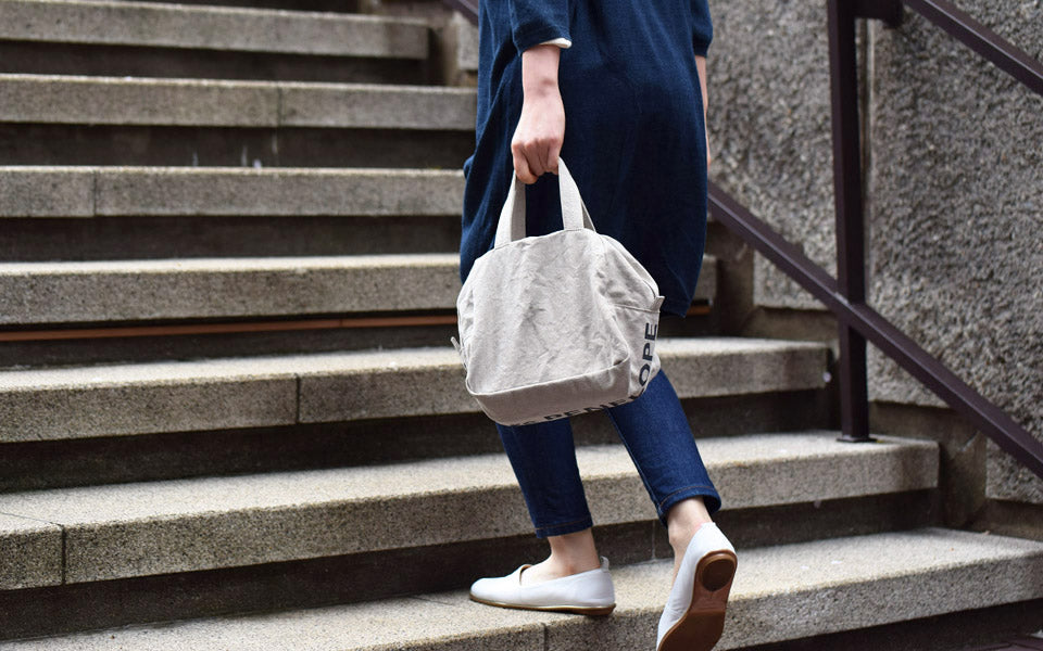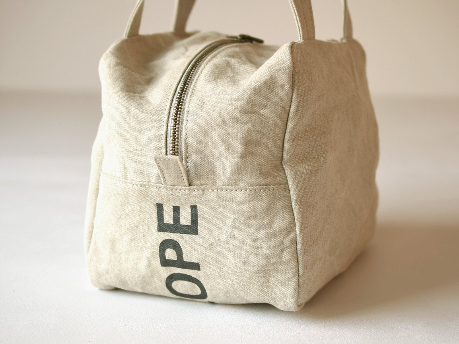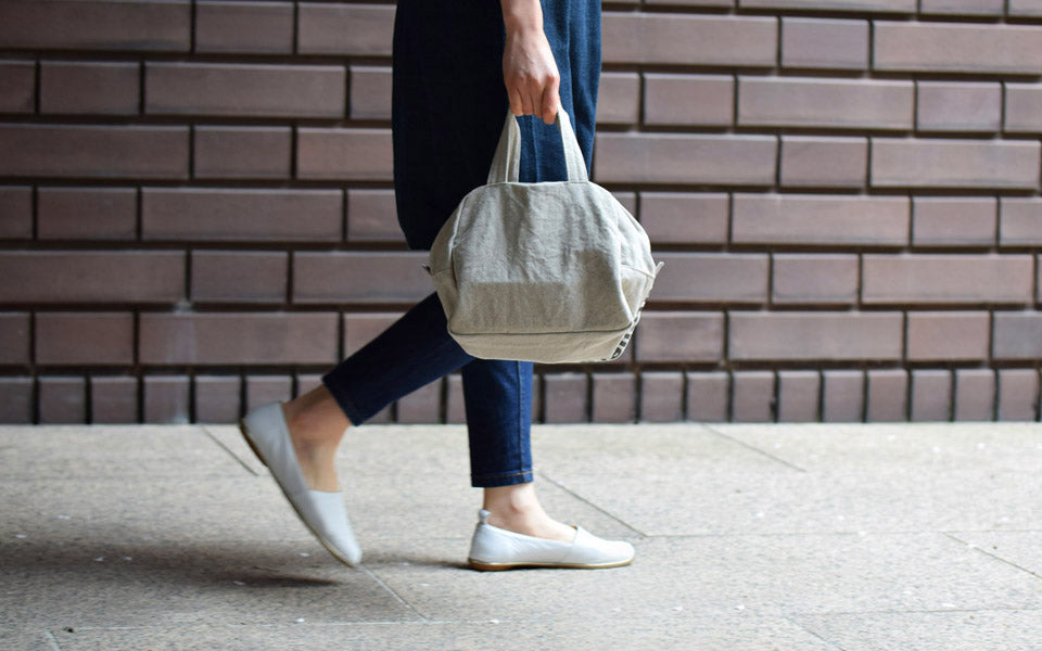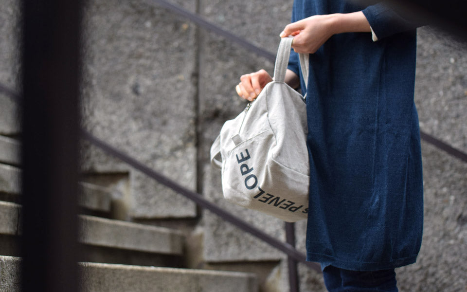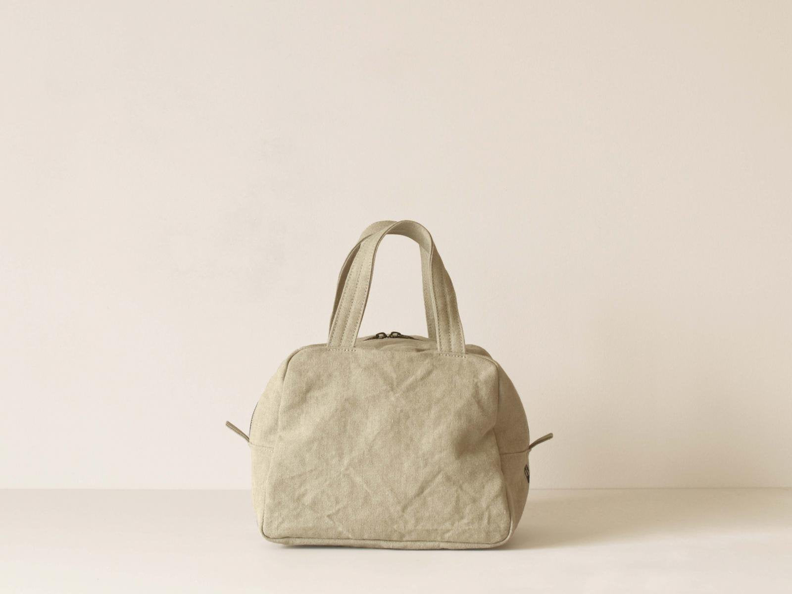 This Boston-shaped tote is made of linen No. 10 canvas. The small size with double slider closure makes it easy to carry and ideal for everyday use. One side of the interior is a pocket. The logo print on the bottom adds a playful touch.