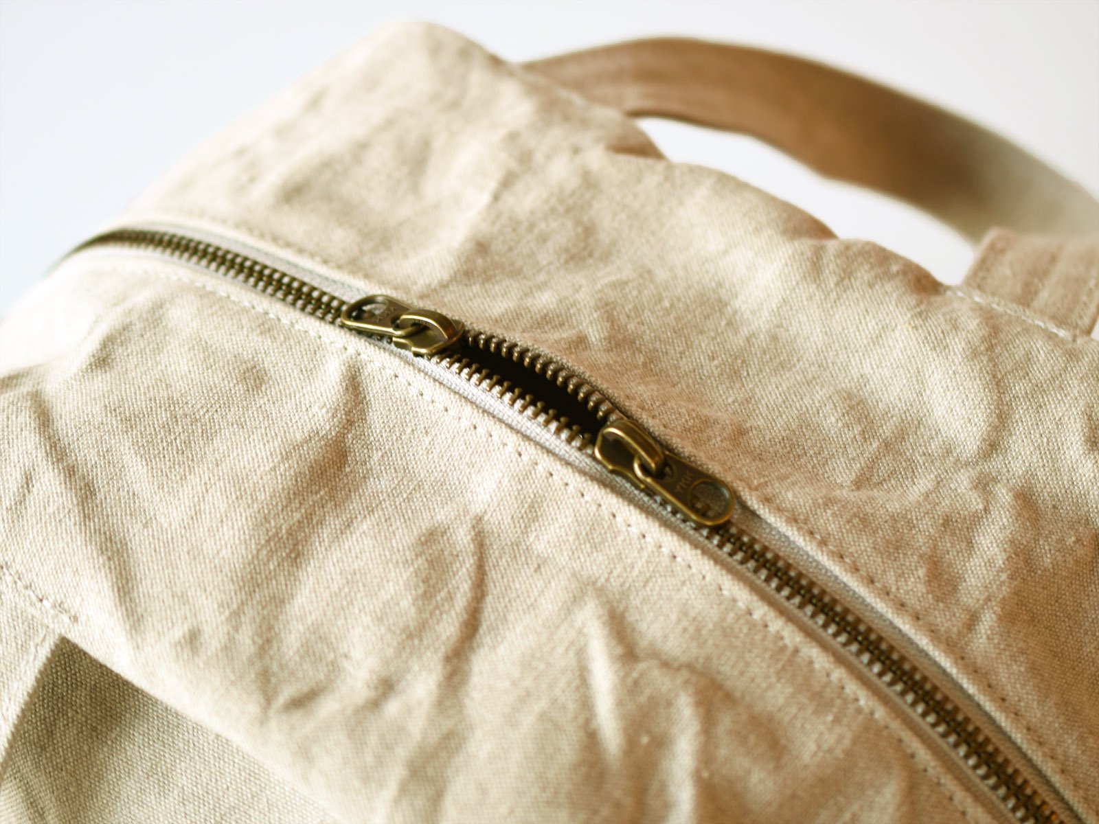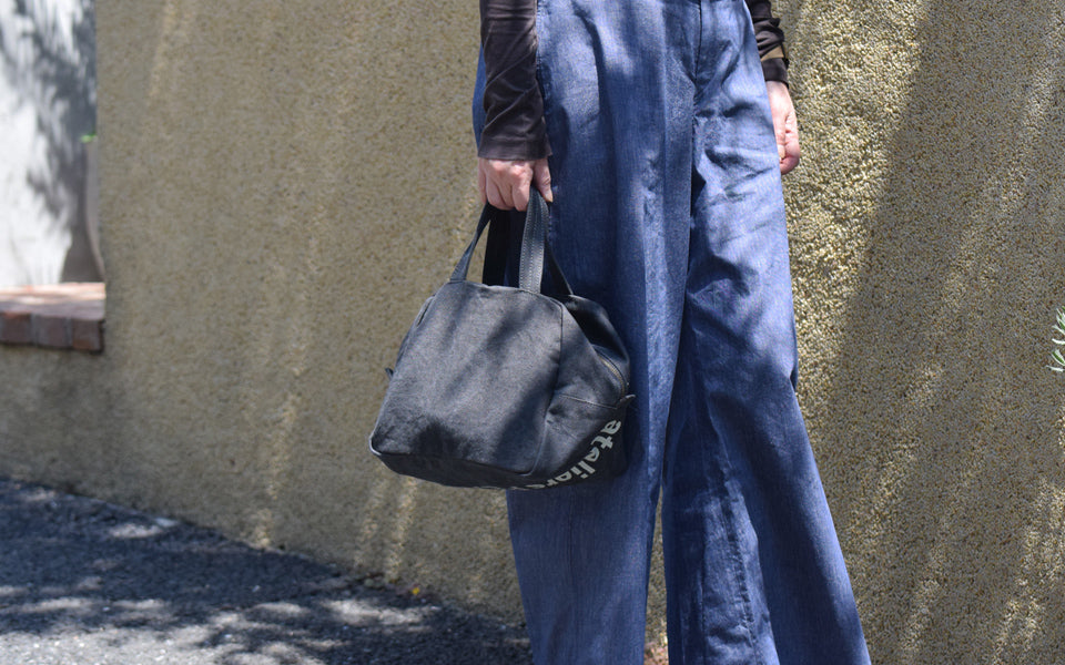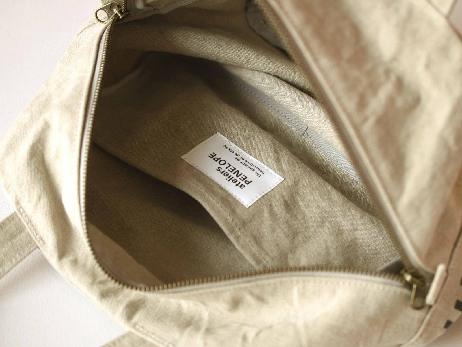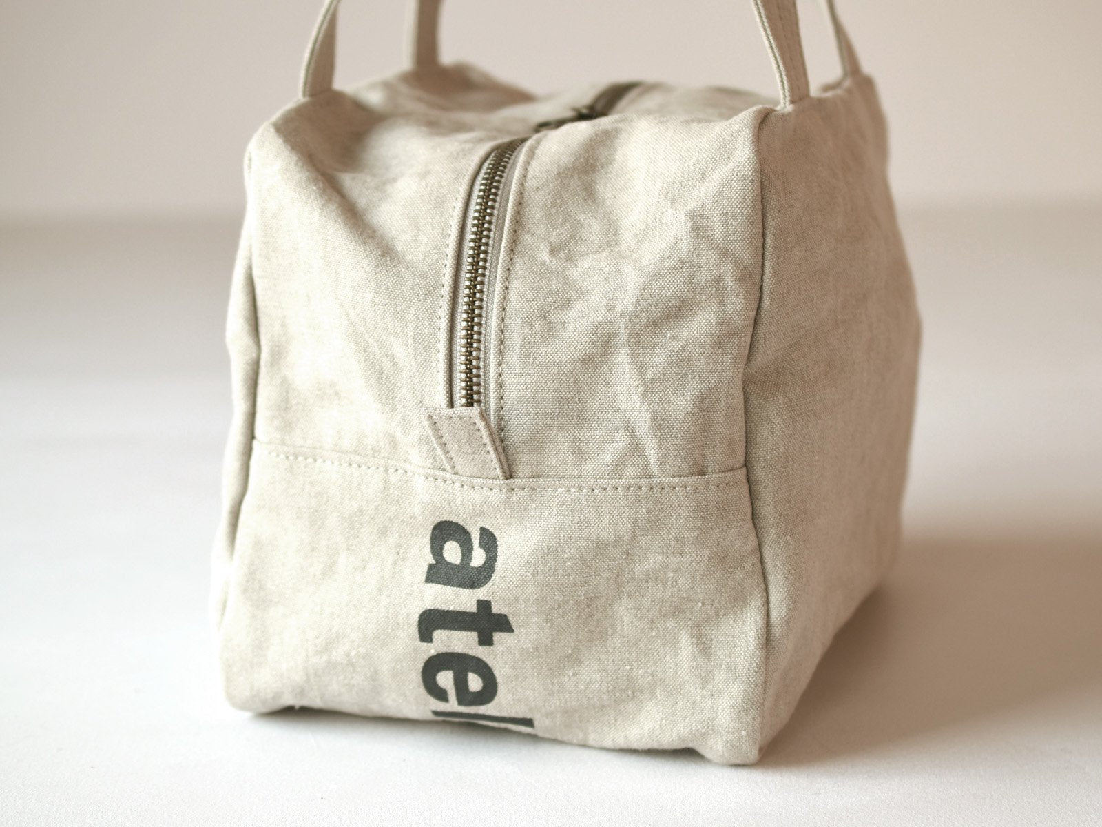 This Boston-shaped tote is made of linen No. 10 canvas. The small size with double slider closure makes it easy to carry and ideal for everyday use. One side of the interior is a pocket. The logo print on the bottom adds a playful touch.