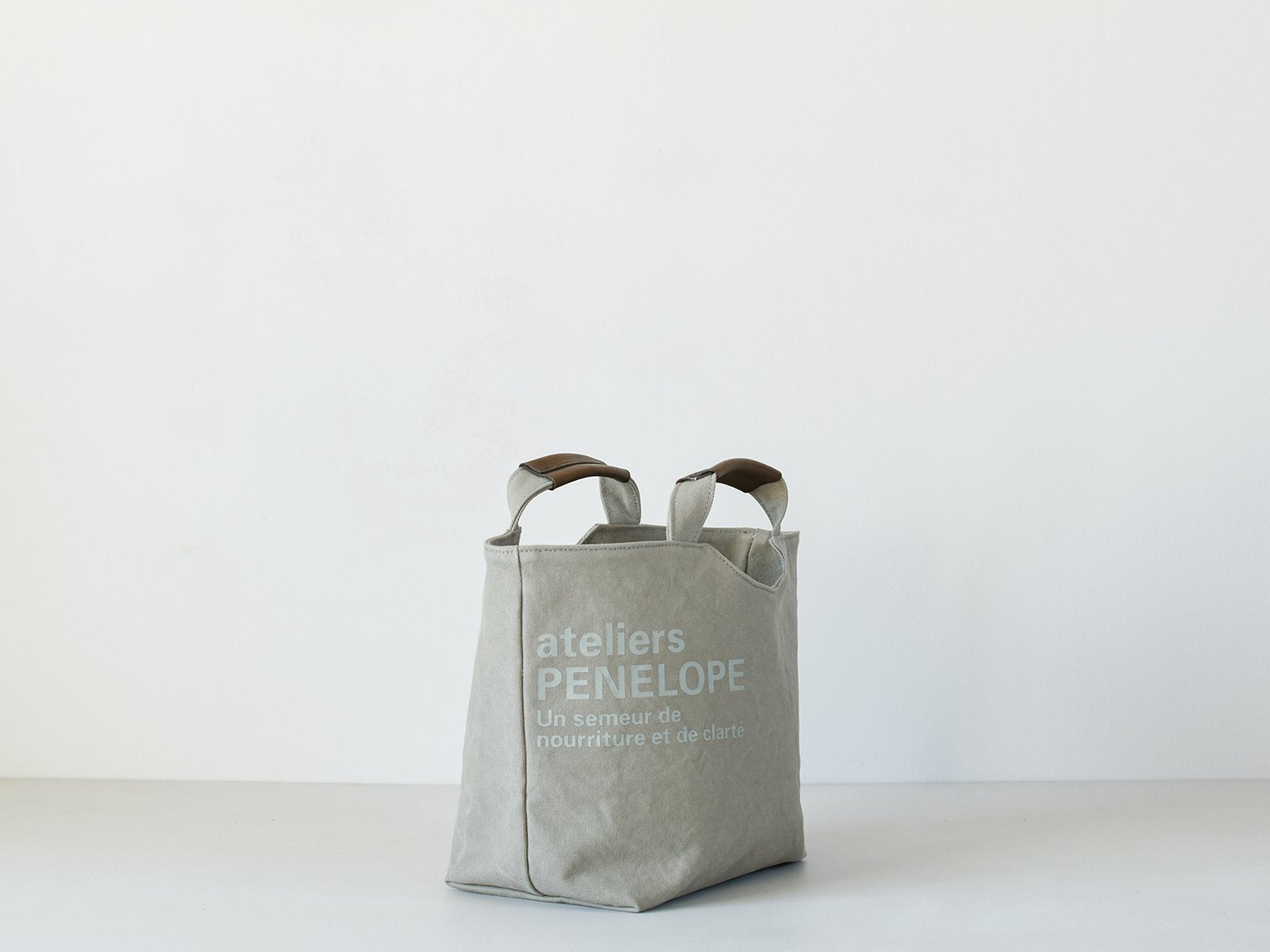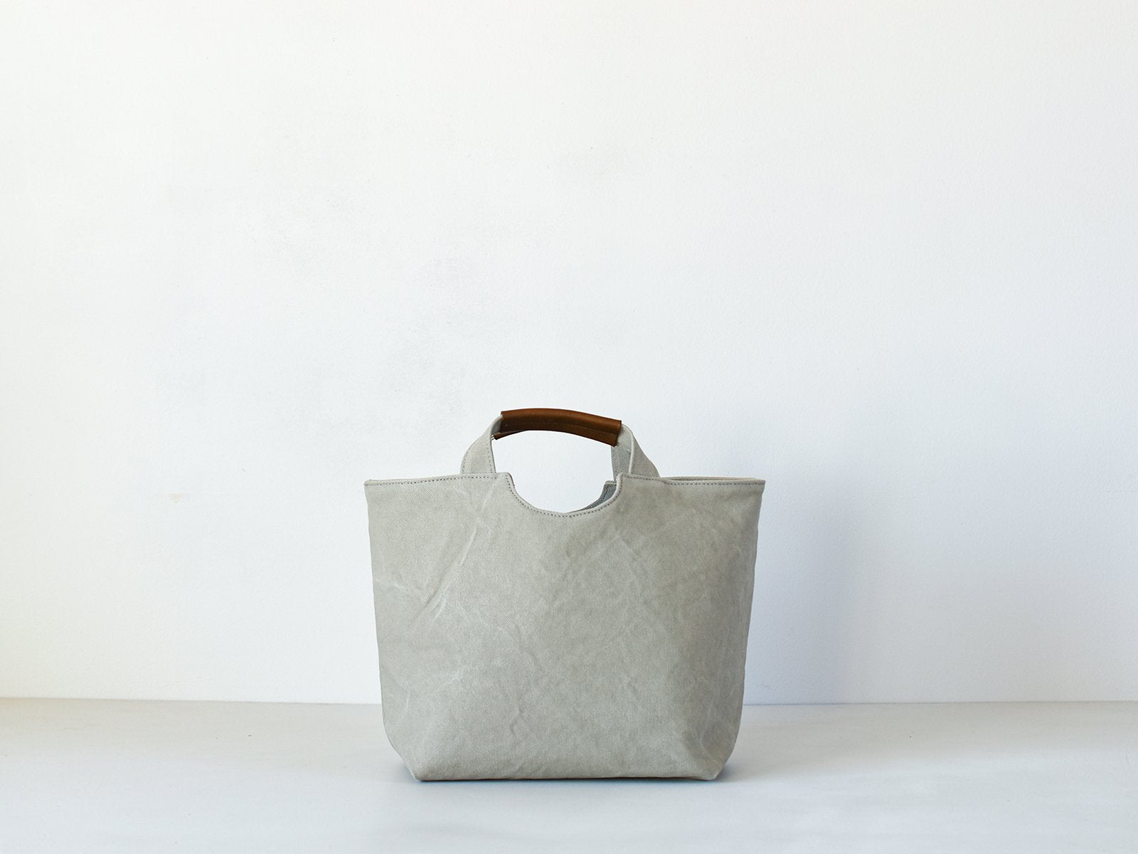 This large-capacity tote bag is made from bio-stone-washed No. 6 canvas. The half-moon-shaped handle attachment is designed to make it easy to put your hand through. and the handle is wrapped in cowhide leather. The logo print on the body adds an accent.