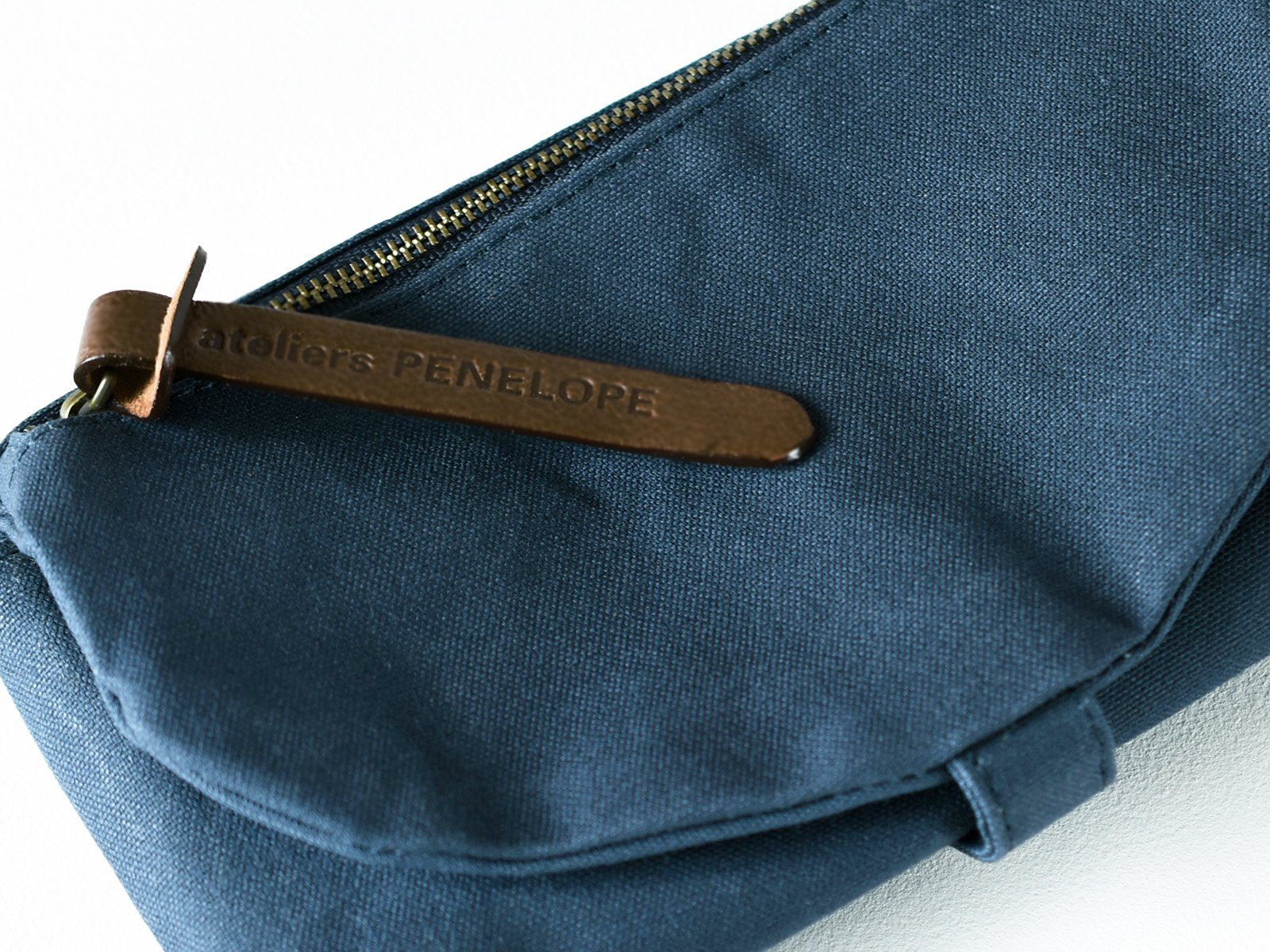 The thin pouch fits easily in the palm of your hand and can be stored in the zippered lid. The lid can be secured to the main body with a spring hook. There is a two-part pocket on the inside for cards. Use it for a bankbook. stationery. or whatever you like.