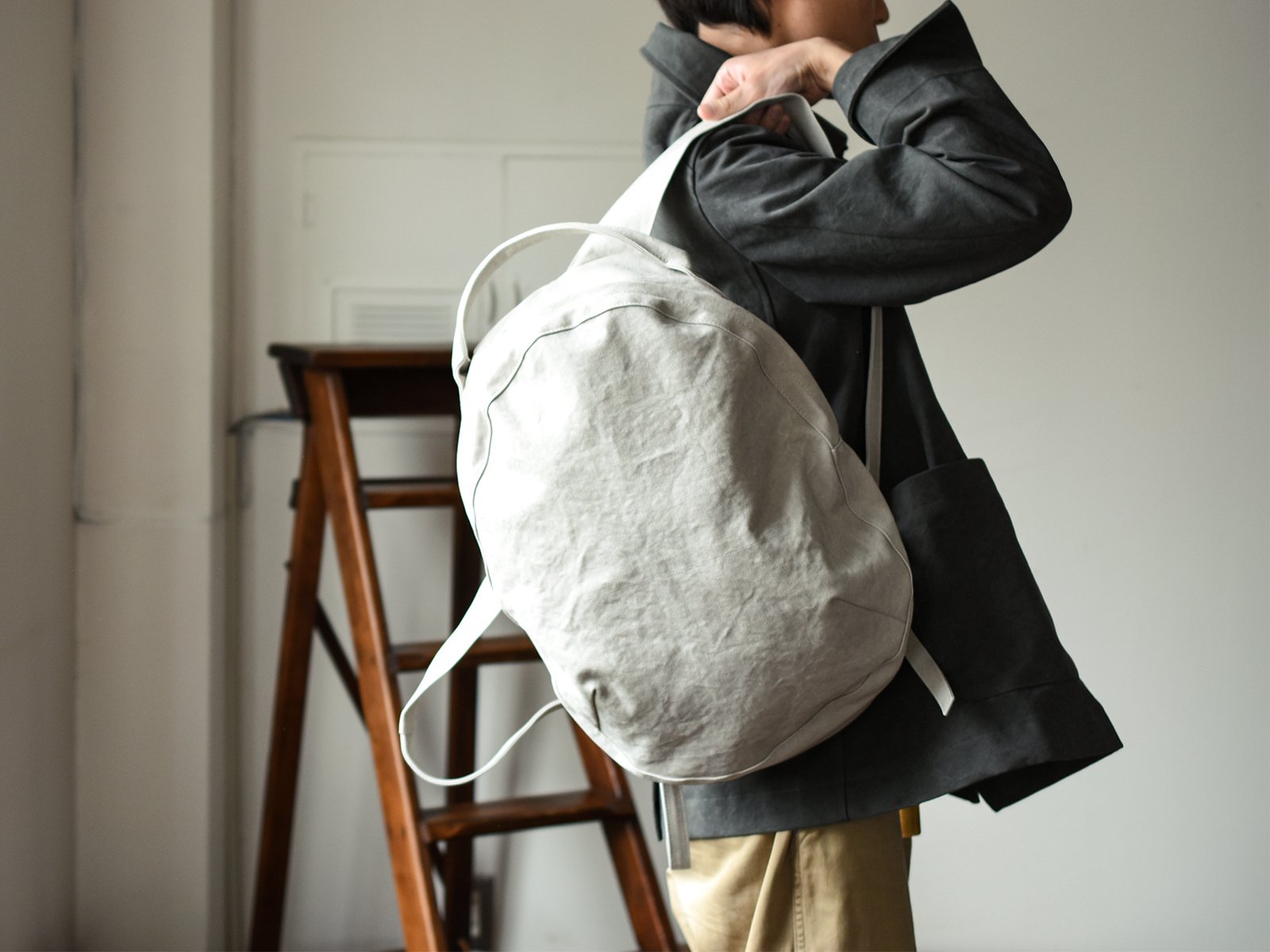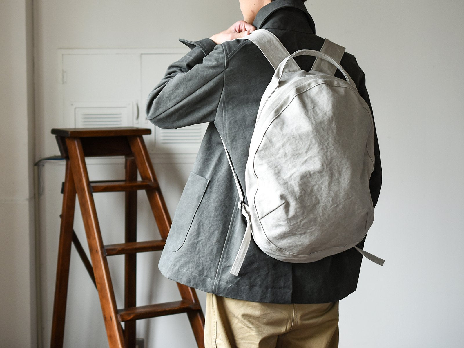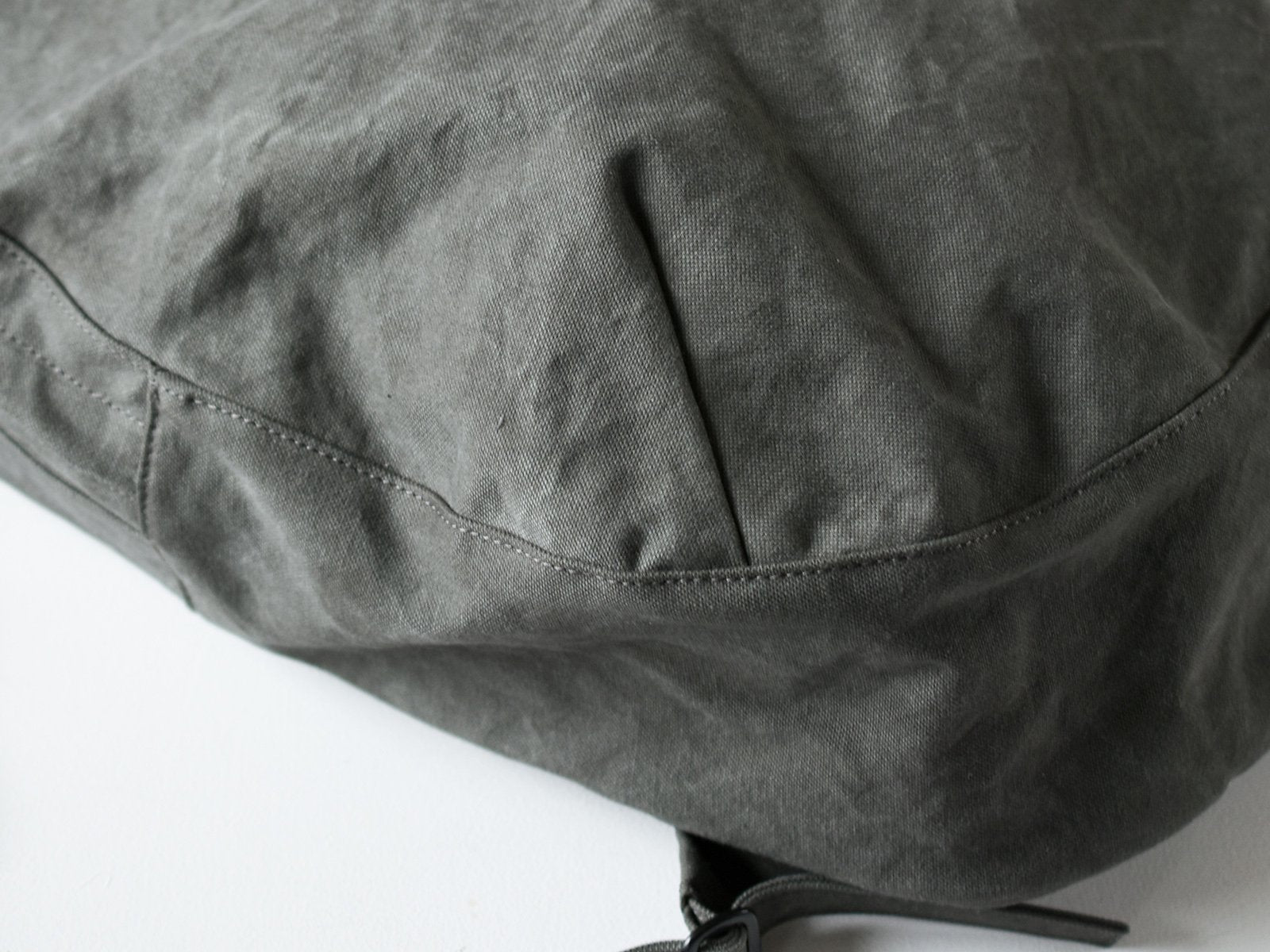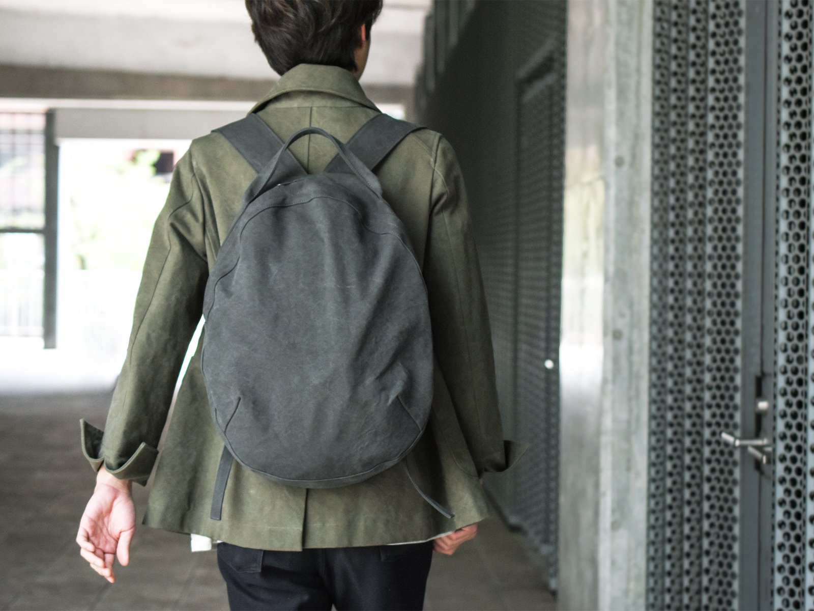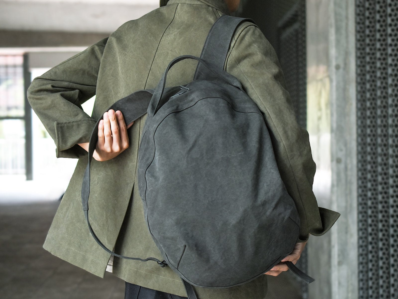 This daypack is made of original French military cotton material. inspired by the fabric of the French Army rider coats of the 1920s. It is named Cocoon because it looks like a rounded cocoon. The simple design has been stripped of all unnecessary elements. and details have been added with stitches and tucks to create a three-dimensional form that makes the most of the texture of the material.