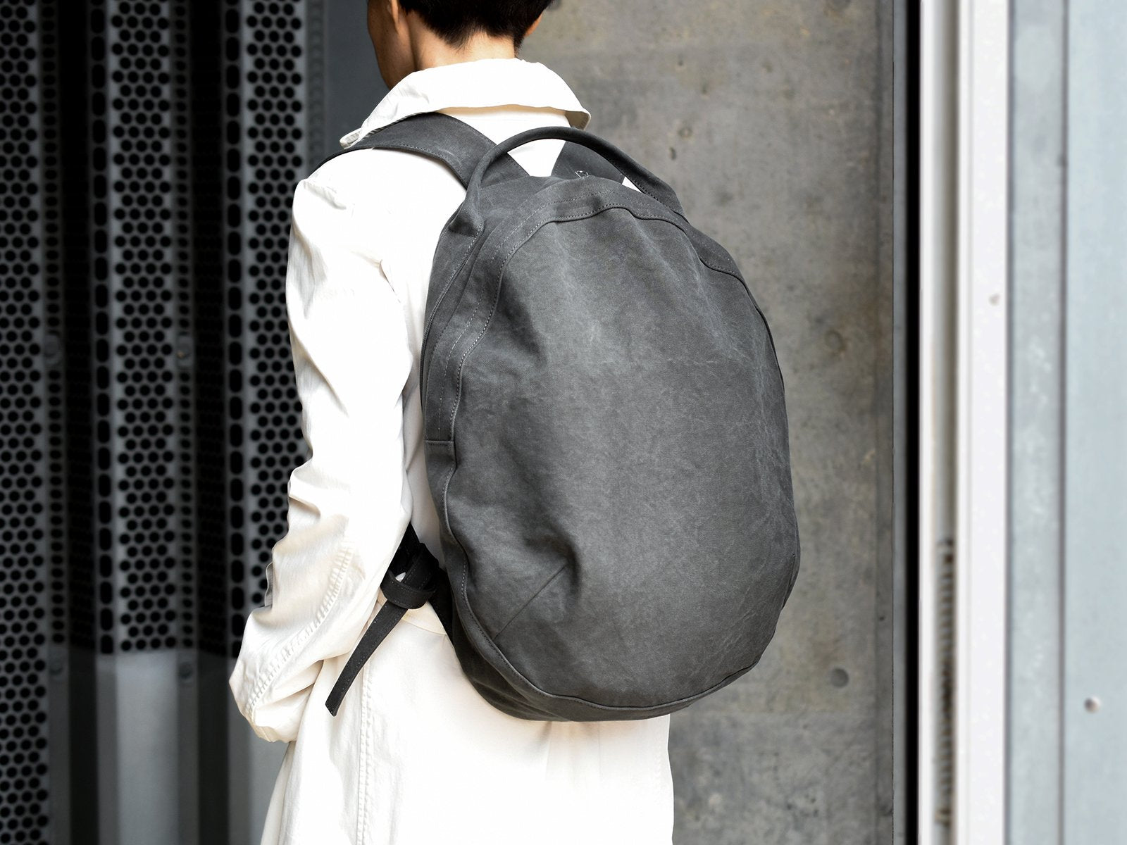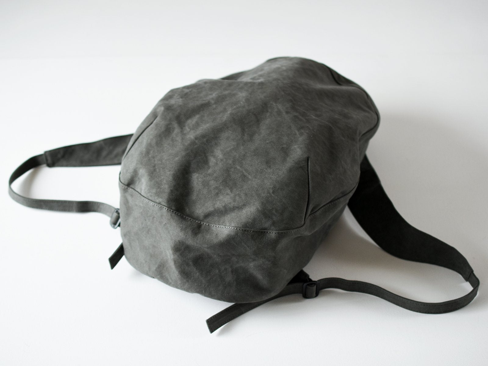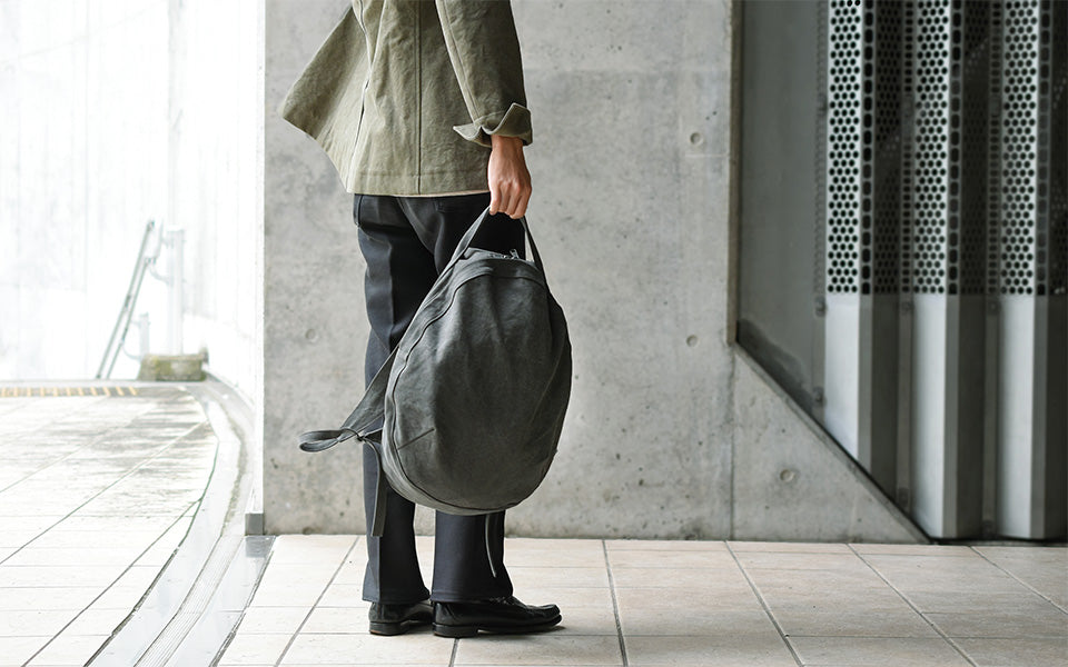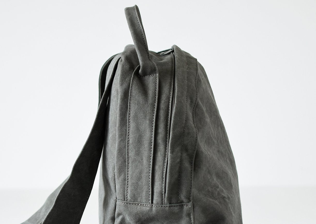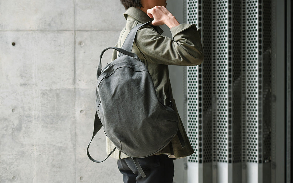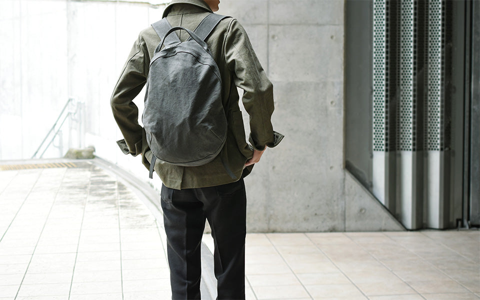 This daypack is made of original French military cotton material. inspired by the fabric of the French Army rider coats of the 1920s. It is named Cocoon because it looks like a rounded cocoon. The simple design has been stripped of all unnecessary elements. and details have been added with stitches and tucks to create a three-dimensional form that makes the most of the texture of the material.