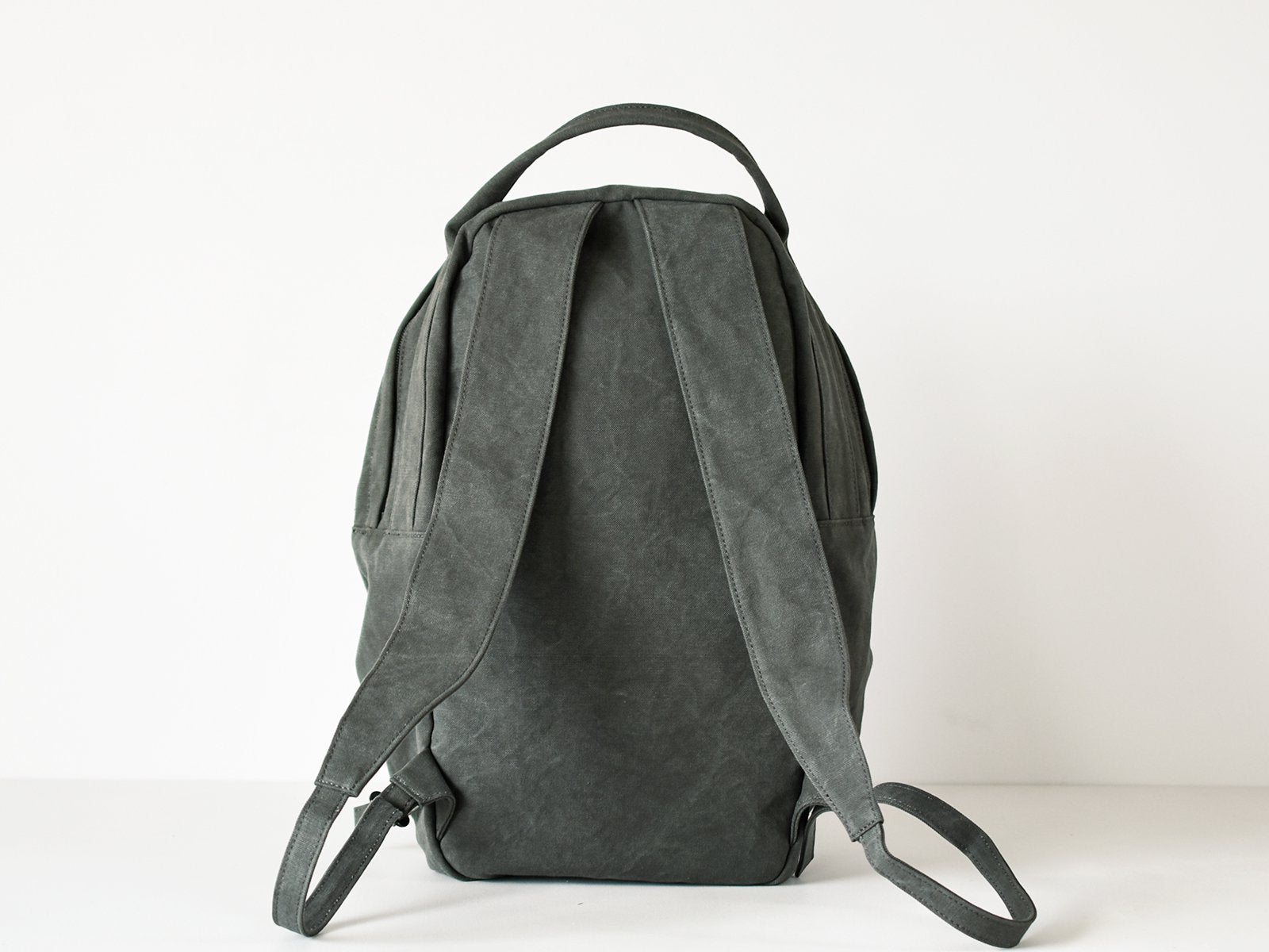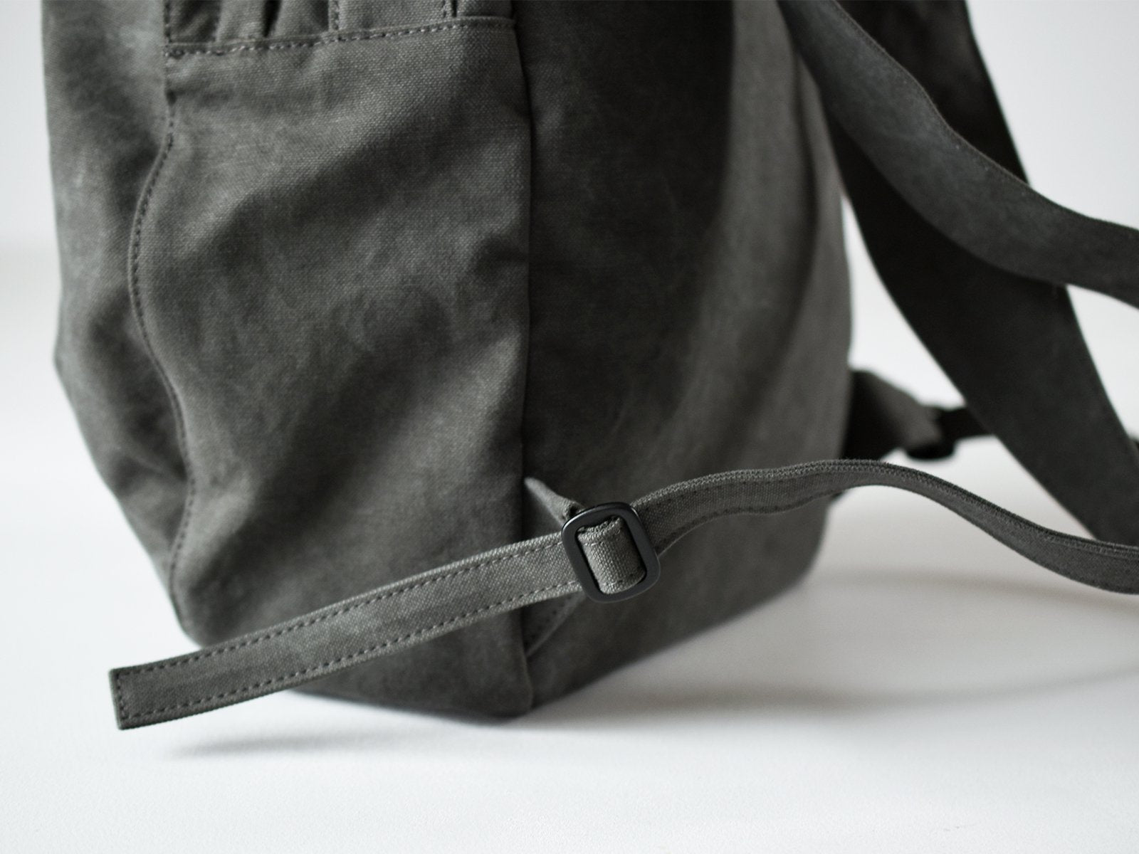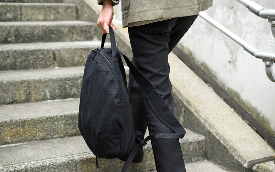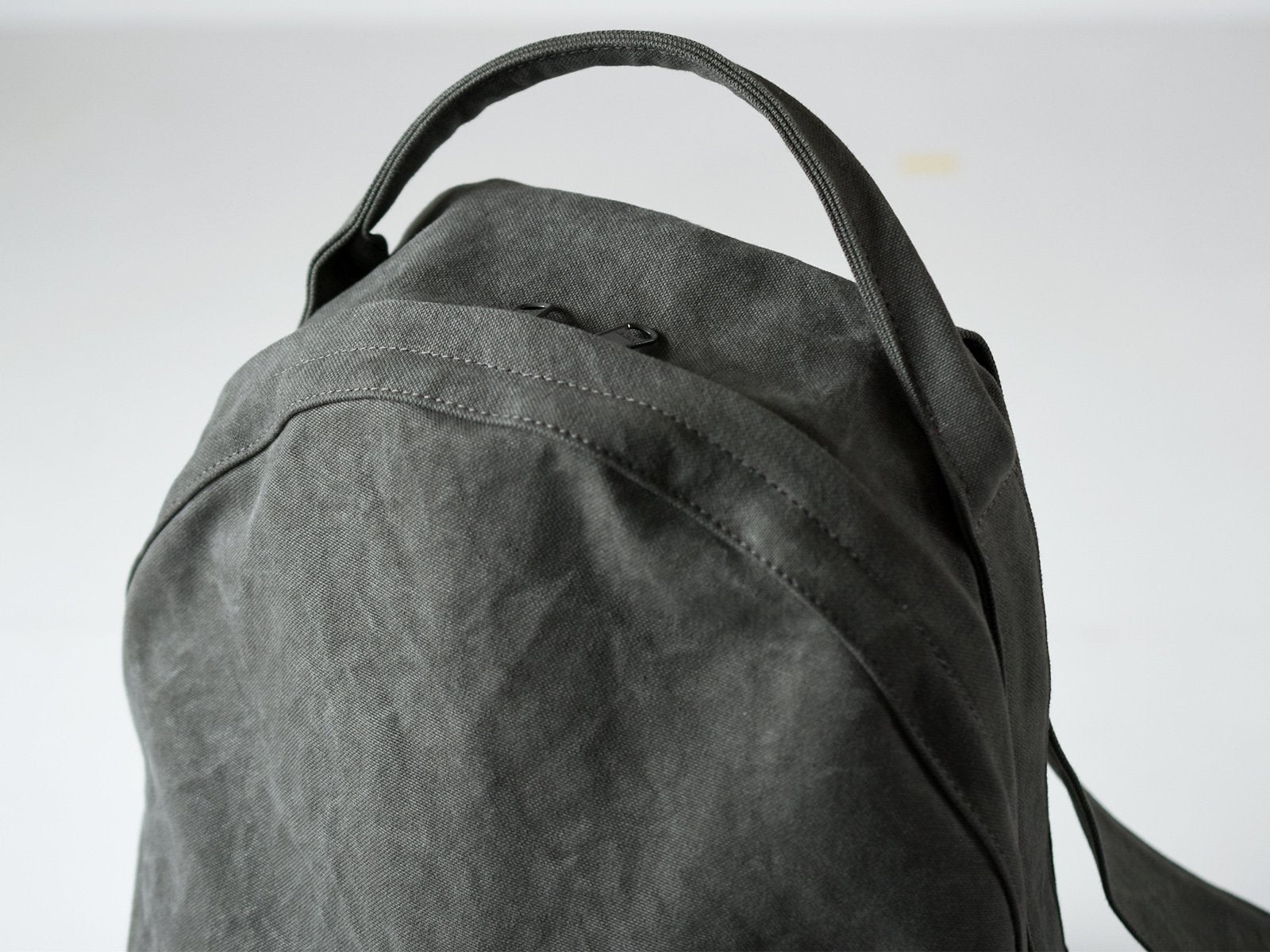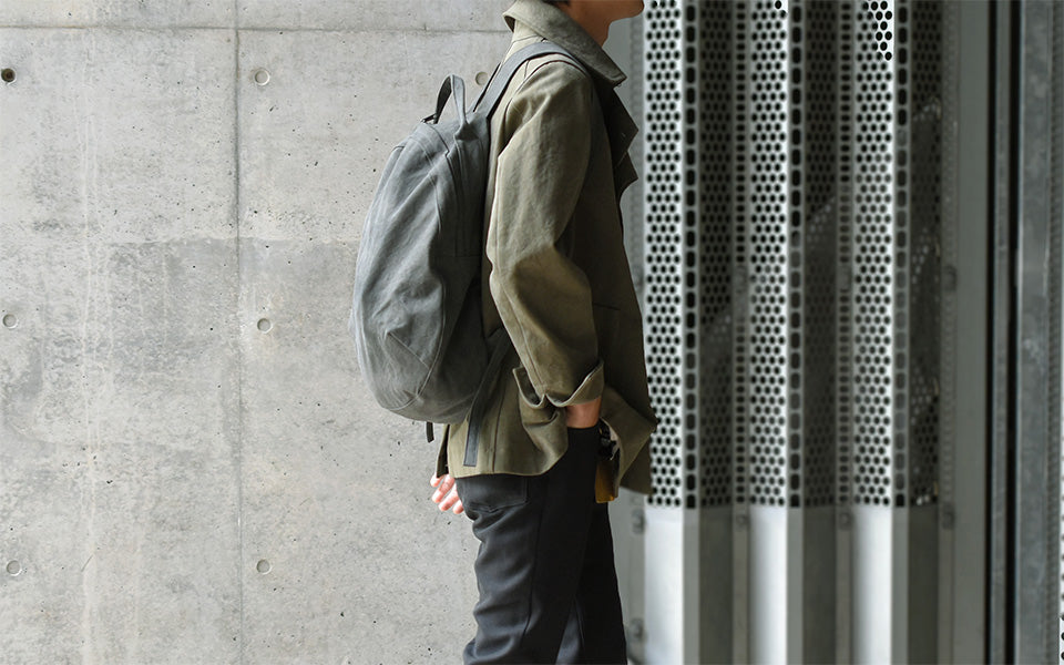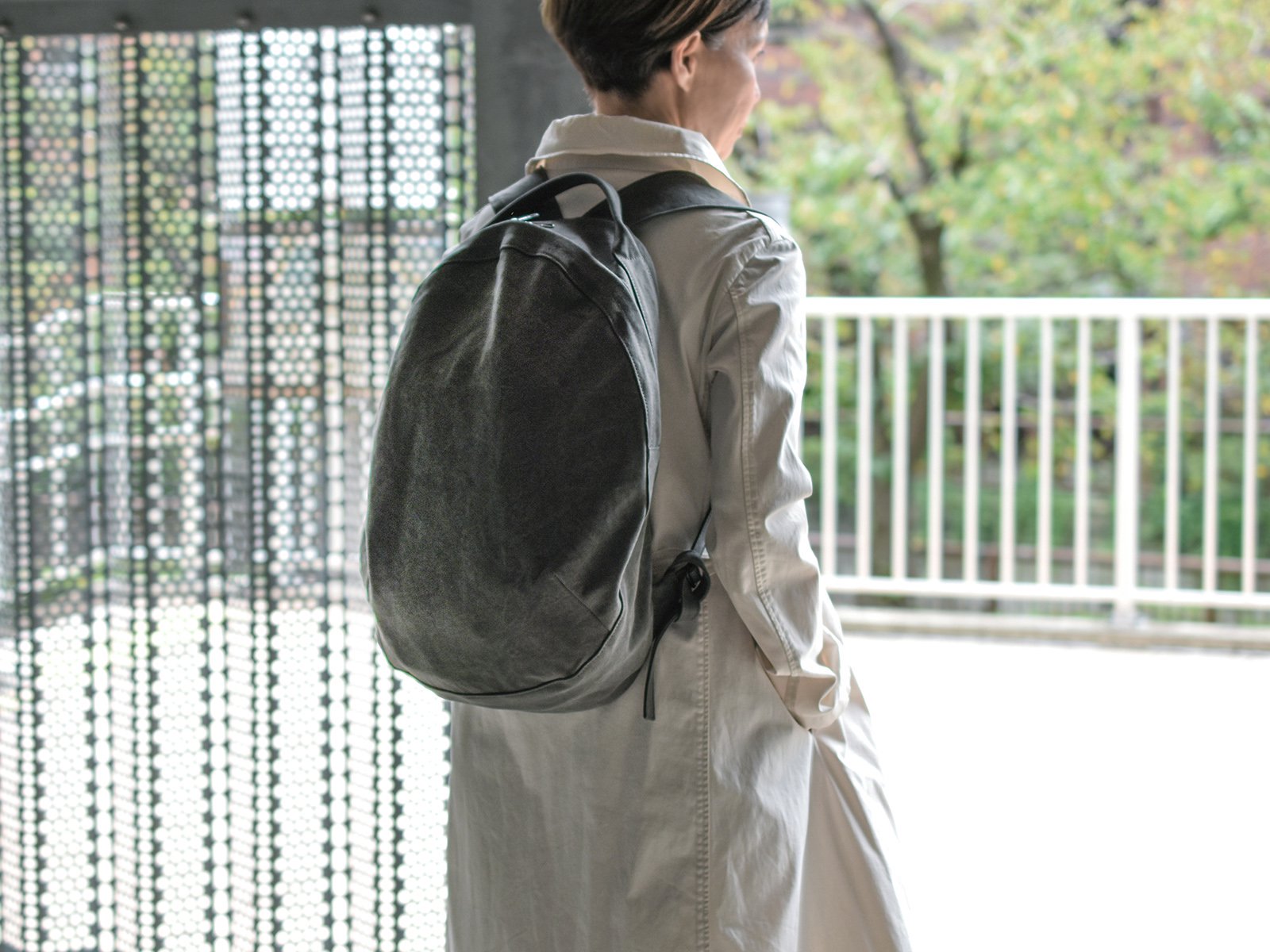 This daypack is made of original French military cotton material. inspired by the fabric of the French Army rider coats of the 1920s. It is named Cocoon because it looks like a rounded cocoon. The simple design has been stripped of all unnecessary elements. and details have been added with stitches and tucks to create a three-dimensional form that makes the most of the texture of the material.