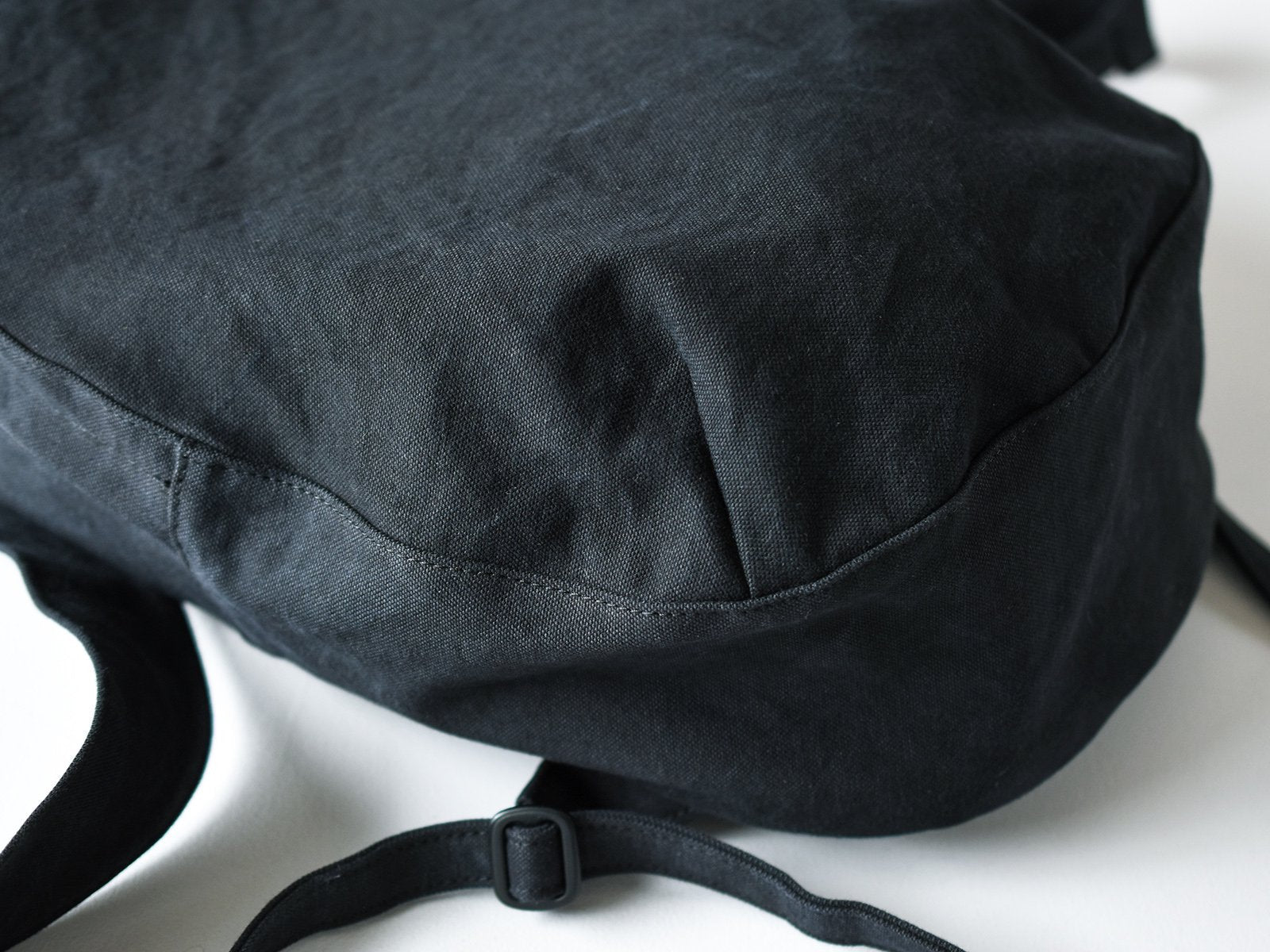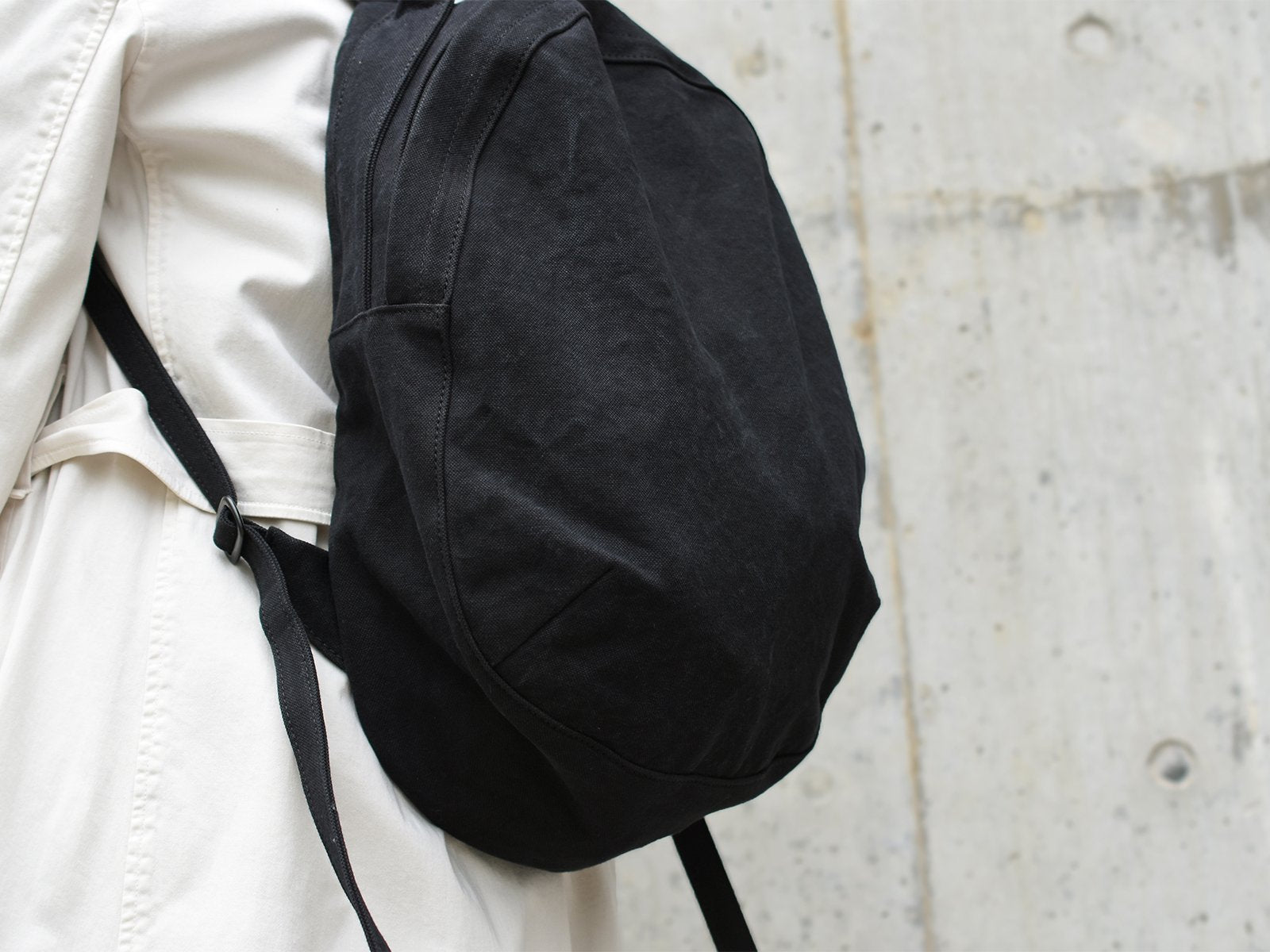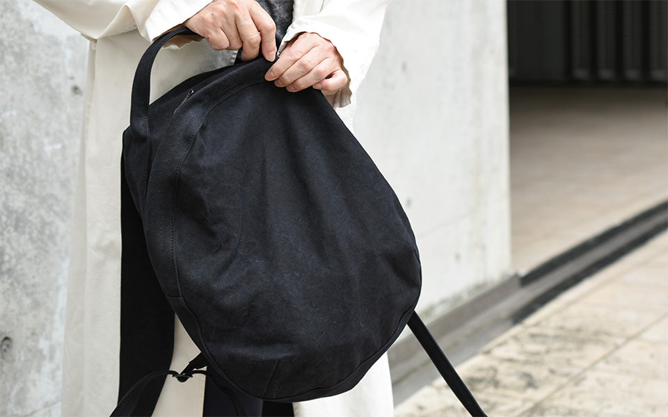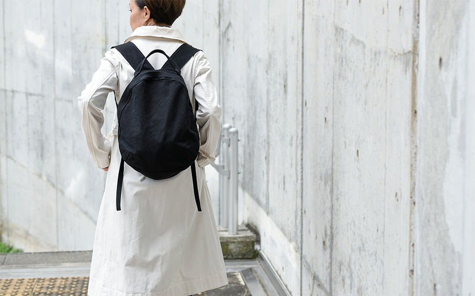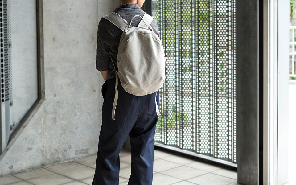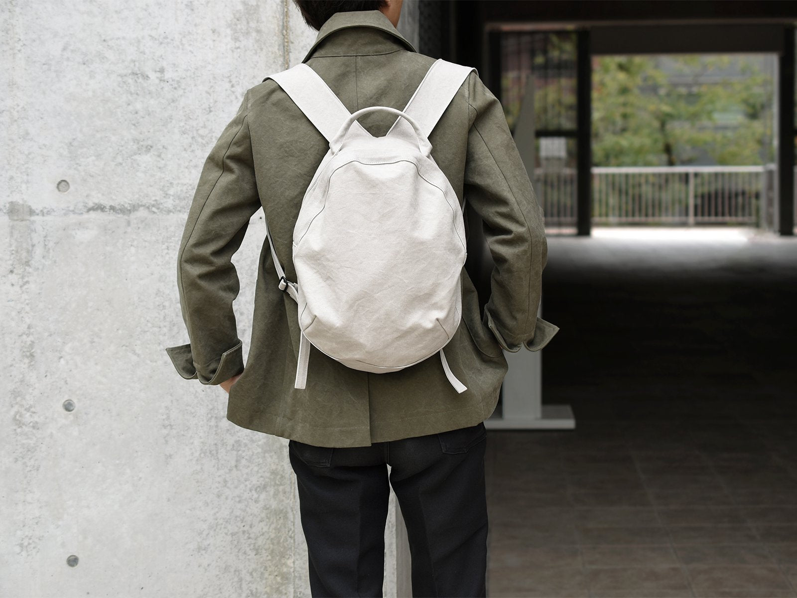 This daypack is made of original French military cotton material. inspired by the fabric of the French Army rider coats of the 1920s. It is named Cocoon because it looks like a rounded cocoon. The simple design has been stripped of all unnecessary elements. and details have been added with stitches and tucks to create a three-dimensional form that makes the most of the texture of the material.