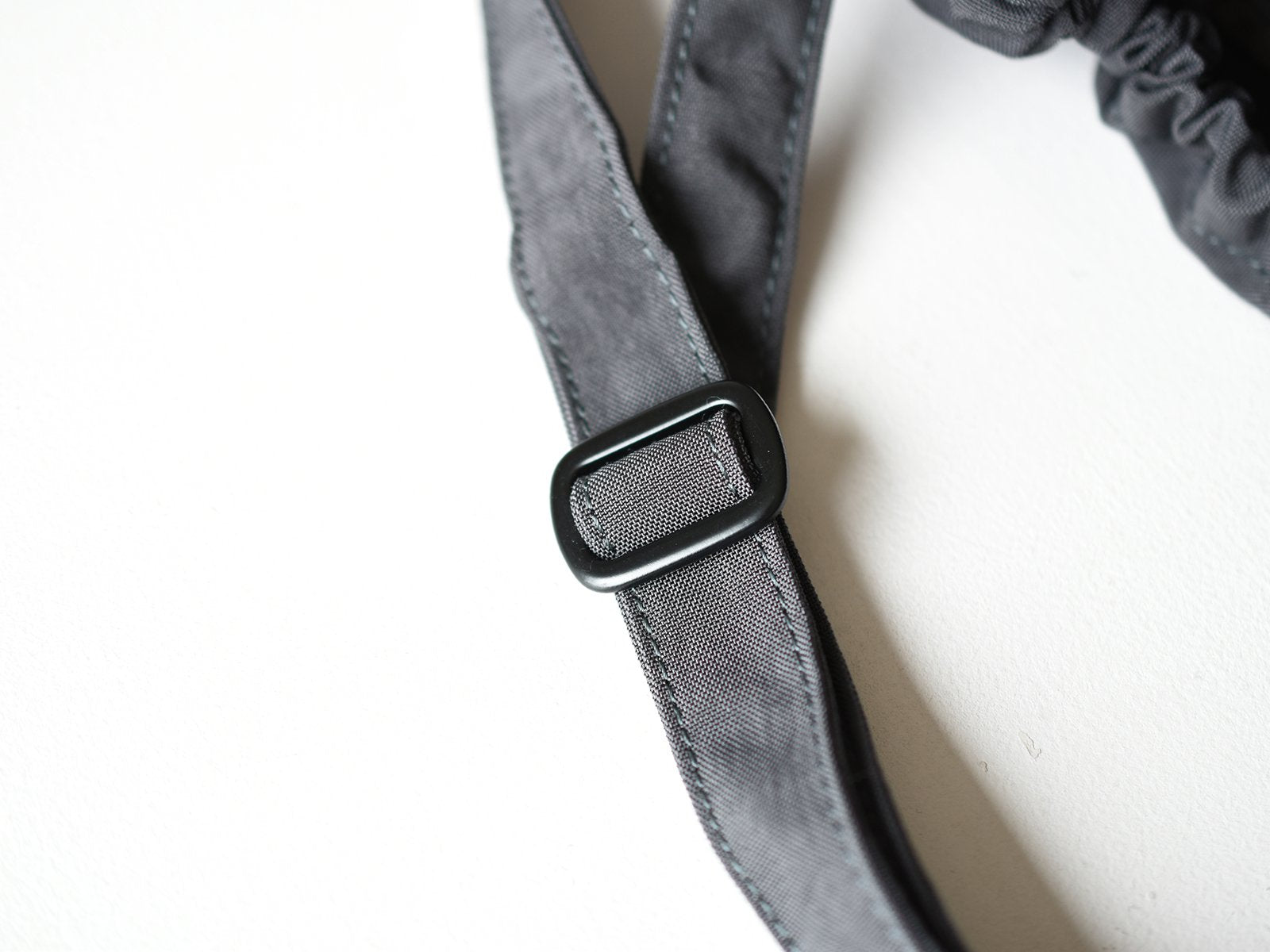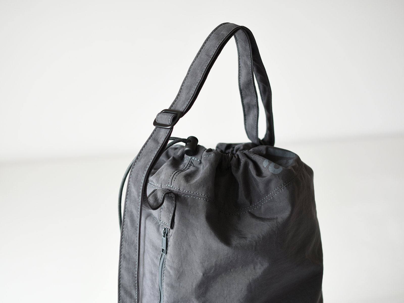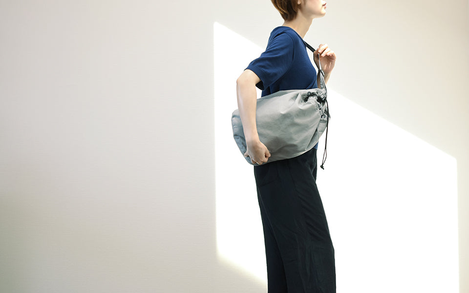 This lightweight shoulder bag is made of nylon material. It is a cylindrical boxer type bag that can be worn slung over the shoulder or carried by hand. The rounded form of the bag. with quilted cotton sandwiched between the bottom and pockets. resembles a float floating on the surface of the water. hence the name "Float.