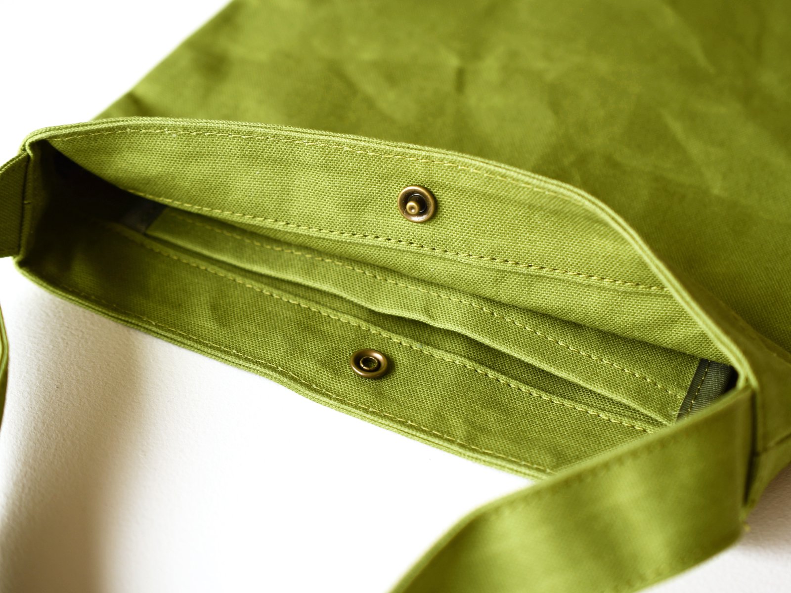 This is a flat type one-shoulder bag without a gusset made of No.10 canvas. The size allows it to be used for casual outings or as a bag-in-bag. It has a hook and loop closure and an inside hanging pocket.
