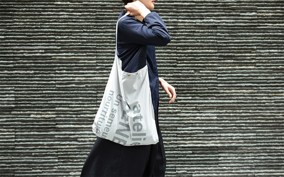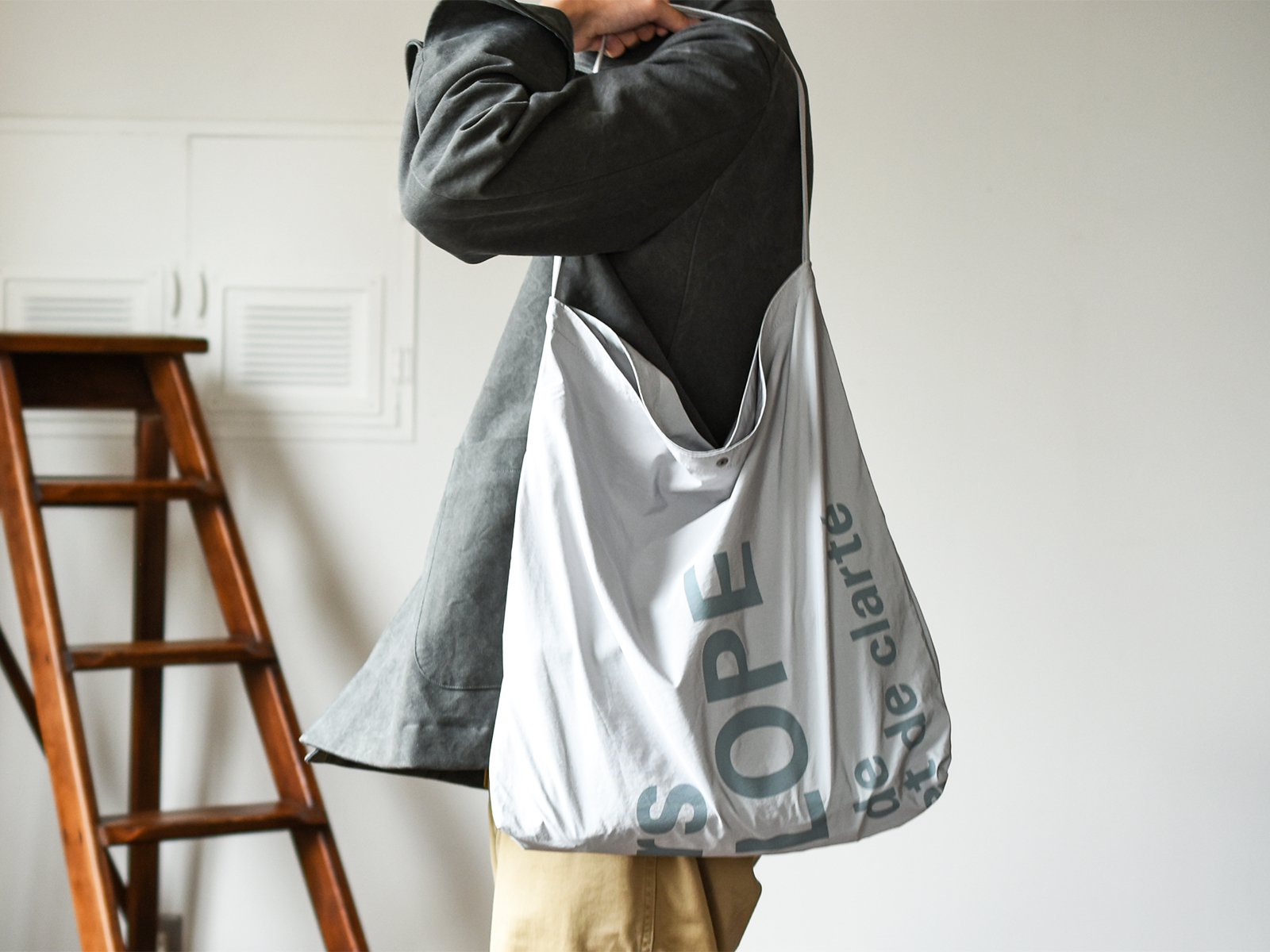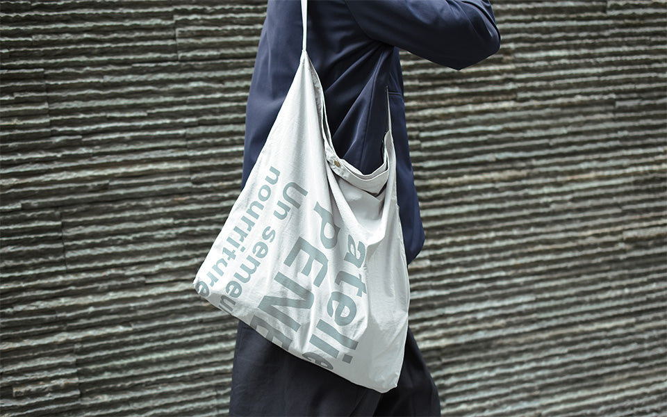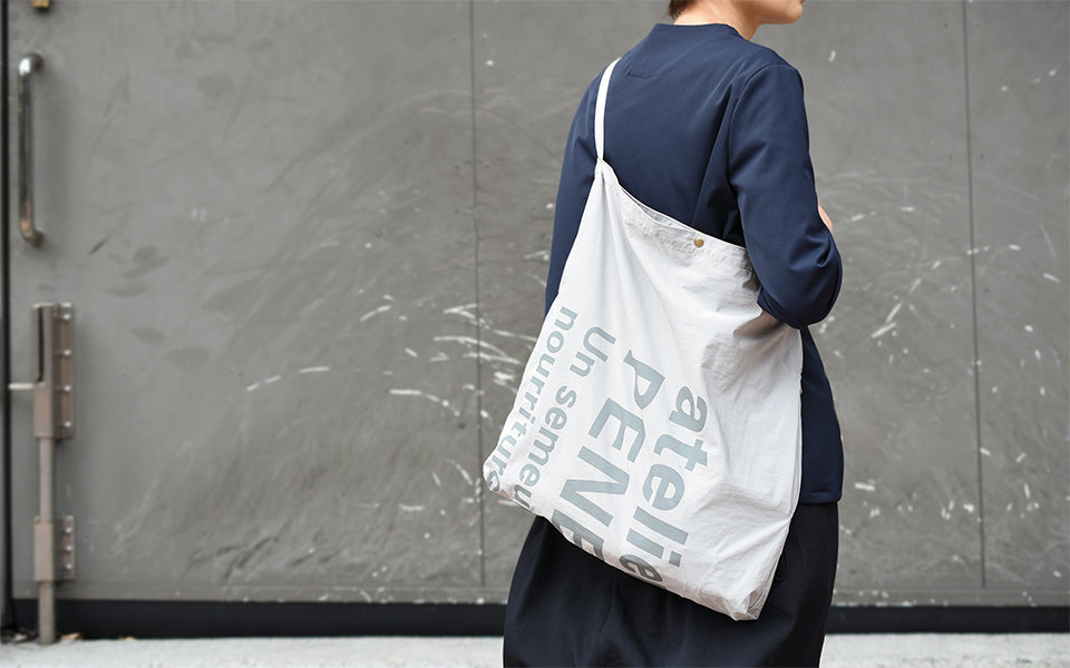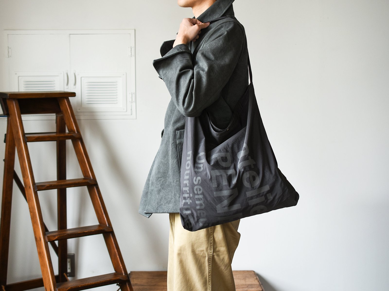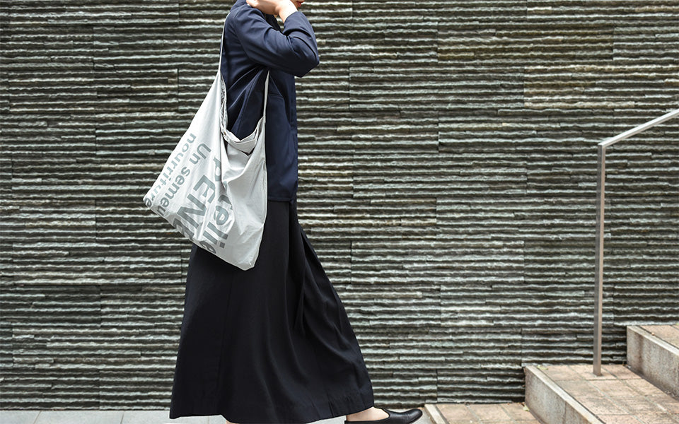 The classic one-shoulder bag is finished with a soft. supple mini-rip taffeta that feels moist to the touch. The material has moderate stretch and water repellency. making it lightweight and wrinkle-resistant. making it ideal for everyday use as well as a shopping bag. It is convenient to carry if you fold the main body and store it in the pouch pocket on the side.