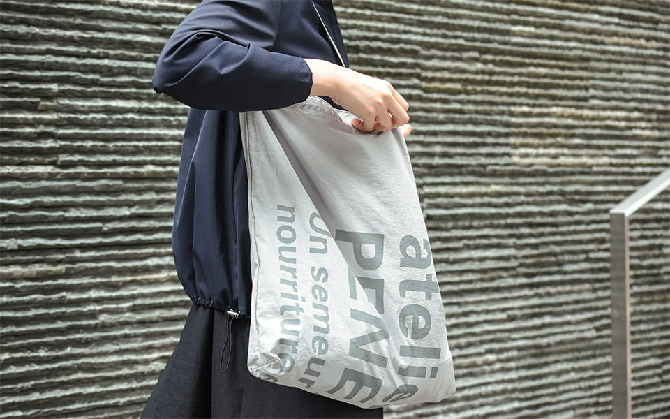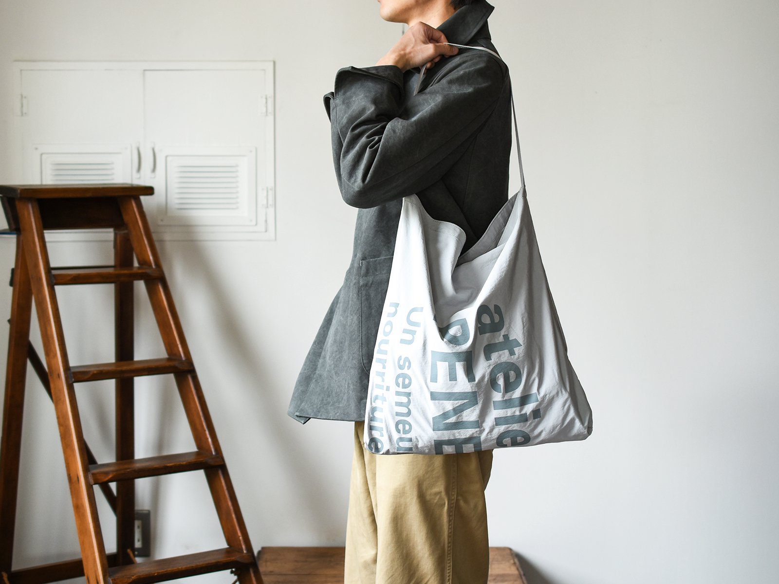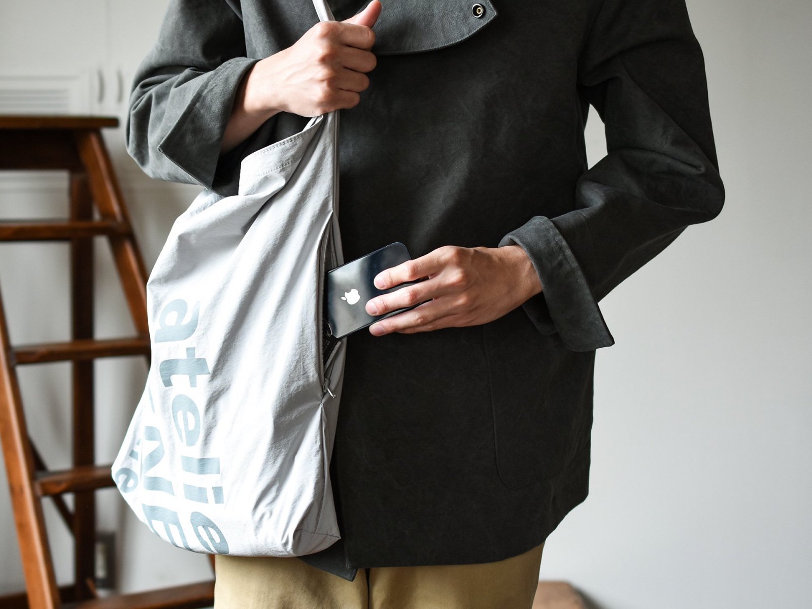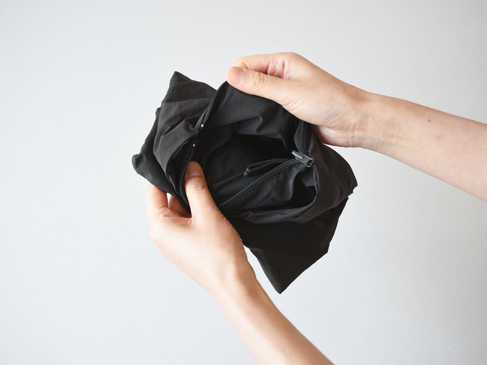 The classic one-shoulder bag is finished with a soft. supple mini-rip taffeta that feels moist to the touch. The material has moderate stretch and water repellency. making it lightweight and wrinkle-resistant. making it ideal for everyday use as well as a shopping bag. It is convenient to carry if you fold the main body and store it in the pouch pocket on the side.