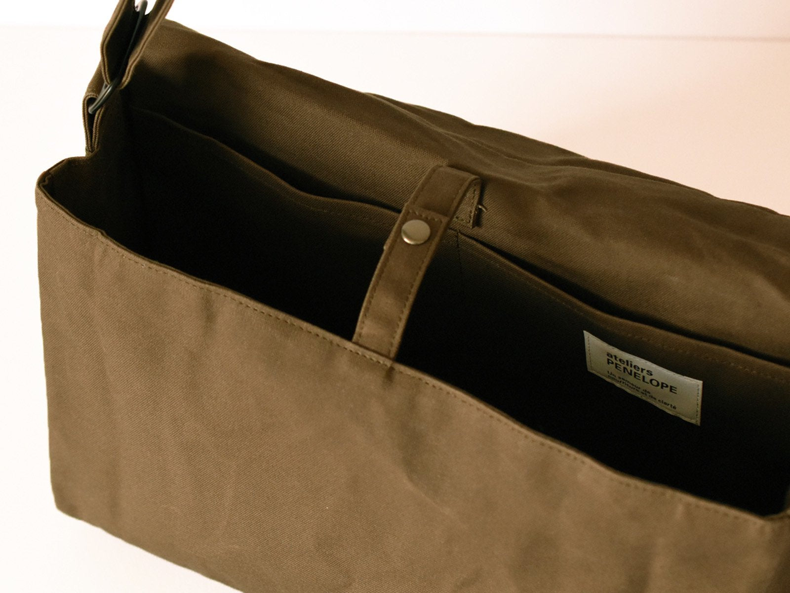 This horizontal shoulder bag fits an A4 size with an adjustable shoulder lid. The bottom is filled with urethane to provide cushioning. It has an inside pocket and a hook at the mouth to stop it from opening. and a zipper pocket on the outside back.