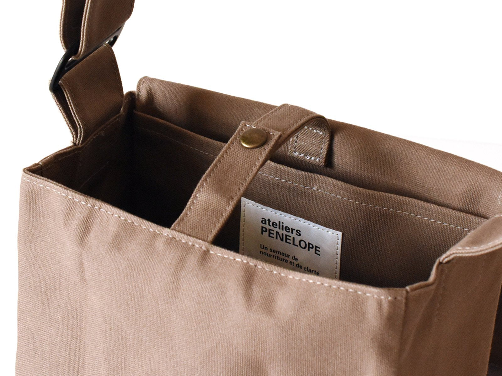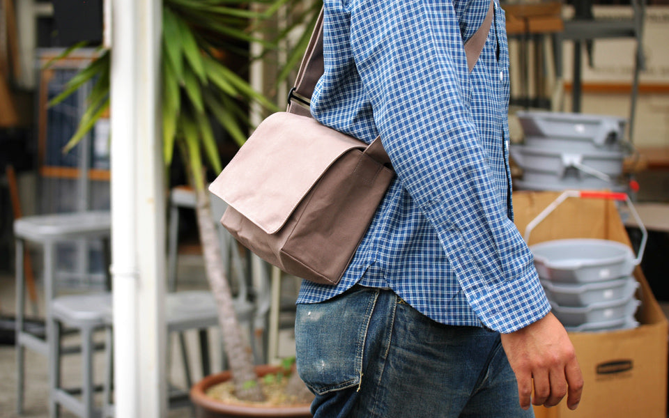 Small shoulder with adjustable lid. The bottom is filled with urethane to provide cushioning. It has an interior pocket and a hook at the mouth to stop it from opening. and a zipper pocket on the exterior back.