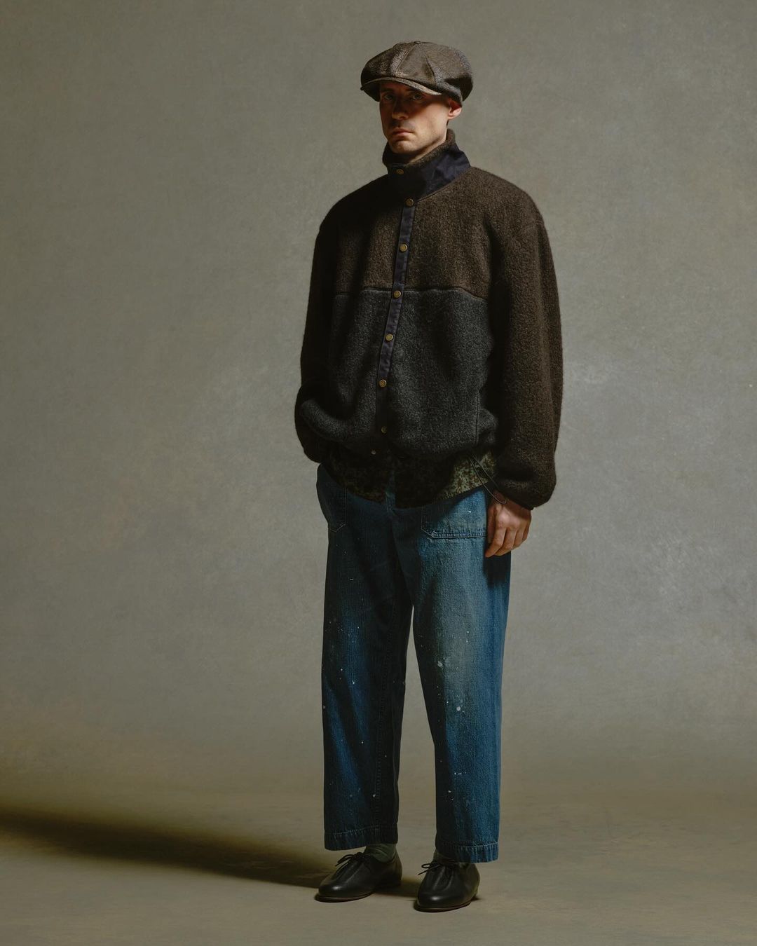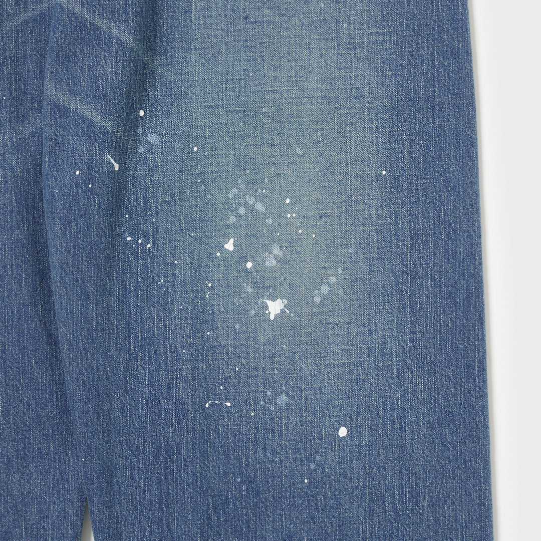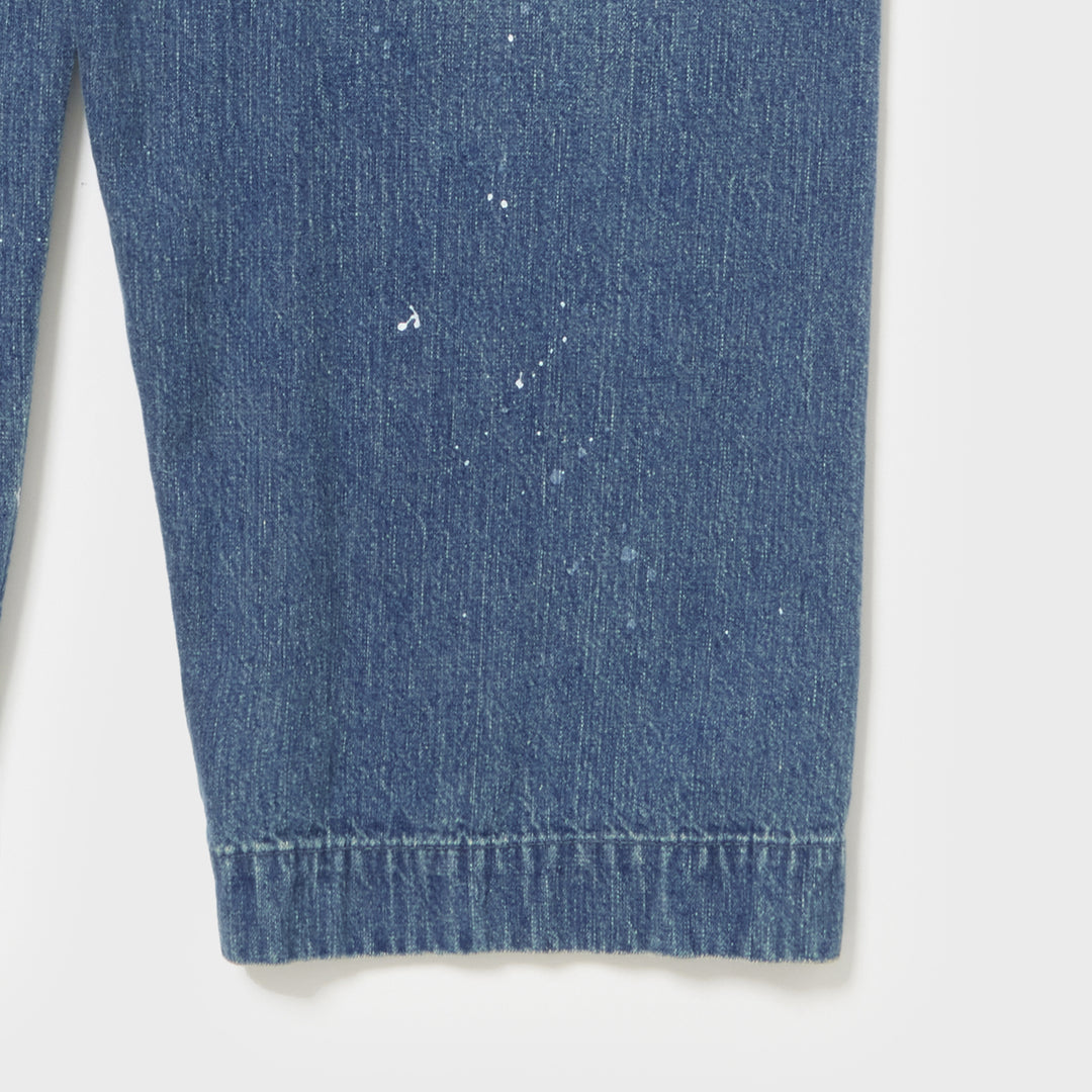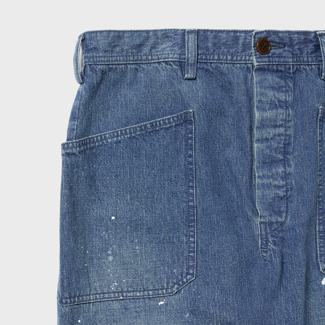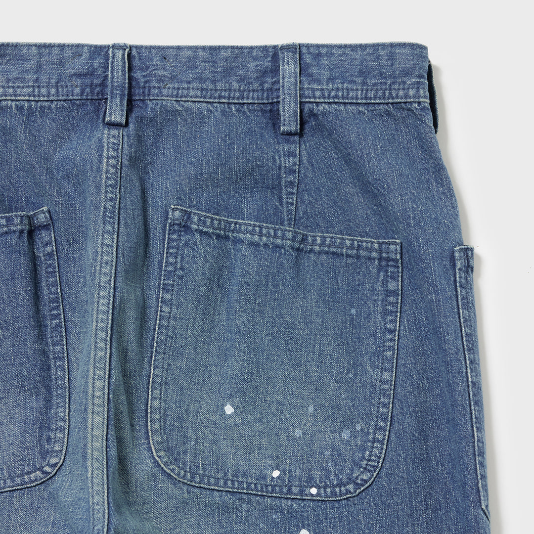 Design: Based on the deck work trousers. commonly known as "wrapped pants". which are legendary denim pants of the US NAVY in the 1940s. The Italian Navy also has famous pants with no side seams. but I would like to ask the people involved while they are still alive why the Navy is so particular about side seams. If the waist is a drawstring and it is like a one-size overpants. I think there is an advantage in maximizing the fabric width. but the Navy basically likes tight fitting. so I have no idea what the advantage of no side seams is. If it is effective. I think it would be good for the ARMY to adopt it as well. This time. I washed these wrapped pants with a target of the used feel of my 1930s overalls. and lightly splashed paint on them. In order to increase the artistic level of this paint. the same white is divided into several stages. the concentration of the cracking material is changed. and the splashing and washing process is done in several stages. This creates a sense of the passage of time on the surface.