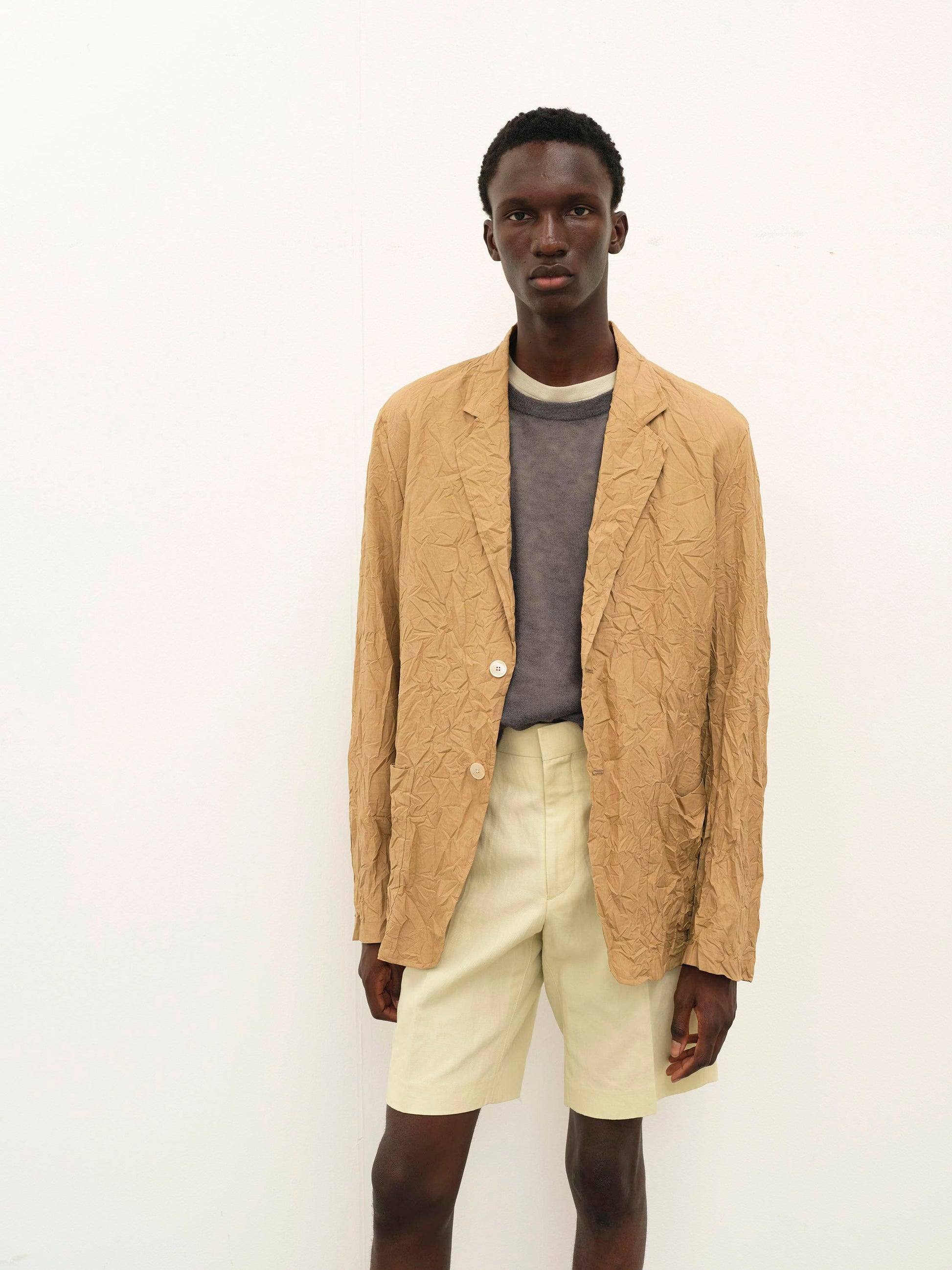 This season we take our classic standard shirting material of Egyptian Finx Twill cotton and add a uniquen twist. Each piece is meticulously treated with a wrinkle process and woven at high density before undergoing a washing treatment. The fabric retains its smooth and silky touch while showcasing a unique textured appearance with distinctive wrinkles.