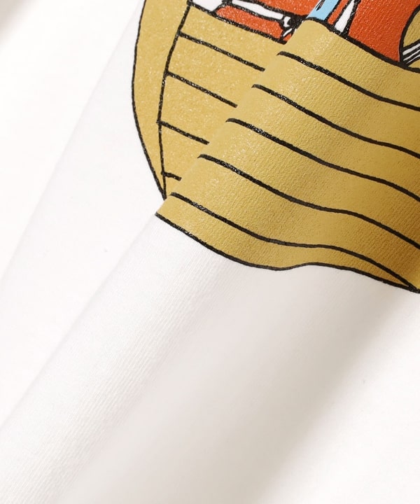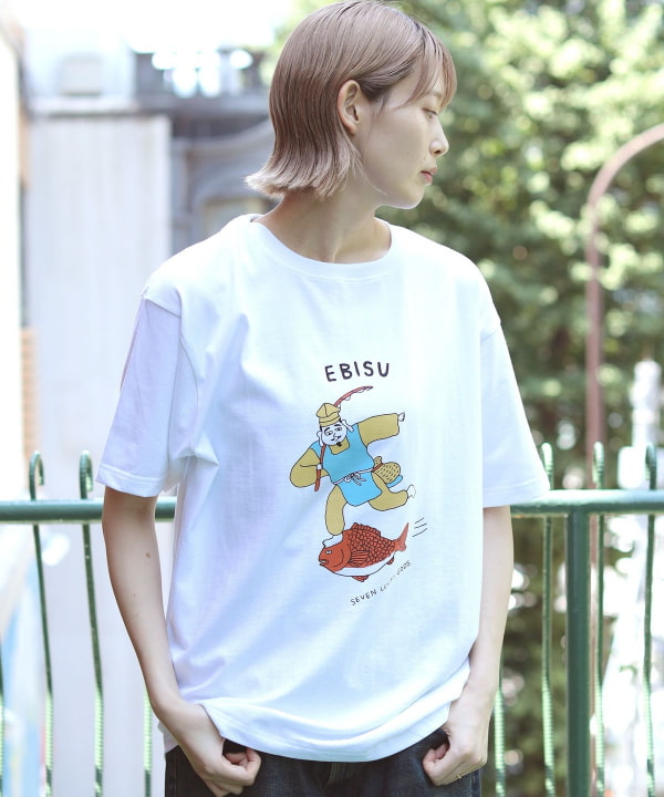 A special lucky charm T-shirt made by BEAMS JAPAN featuring the Seven Lucky Gods. who are worshipped in Japan as gods of good fortune. Illustrator HONGAMA has created a surreal and humorous illustration with a unique perspective. depicting the Seven Lucky Gods riding on a treasure ship. Daikokuten riding on military provisions. and Ebisu riding on a sea bream. The T-shirt uses a round body made of American cotton spun in the United States and knitted in 16/1 jersey. giving it a moderately dense and plump volume. It is a unique yet good design that can be incorporated as a fashion item.