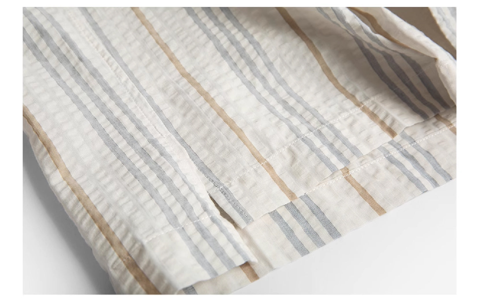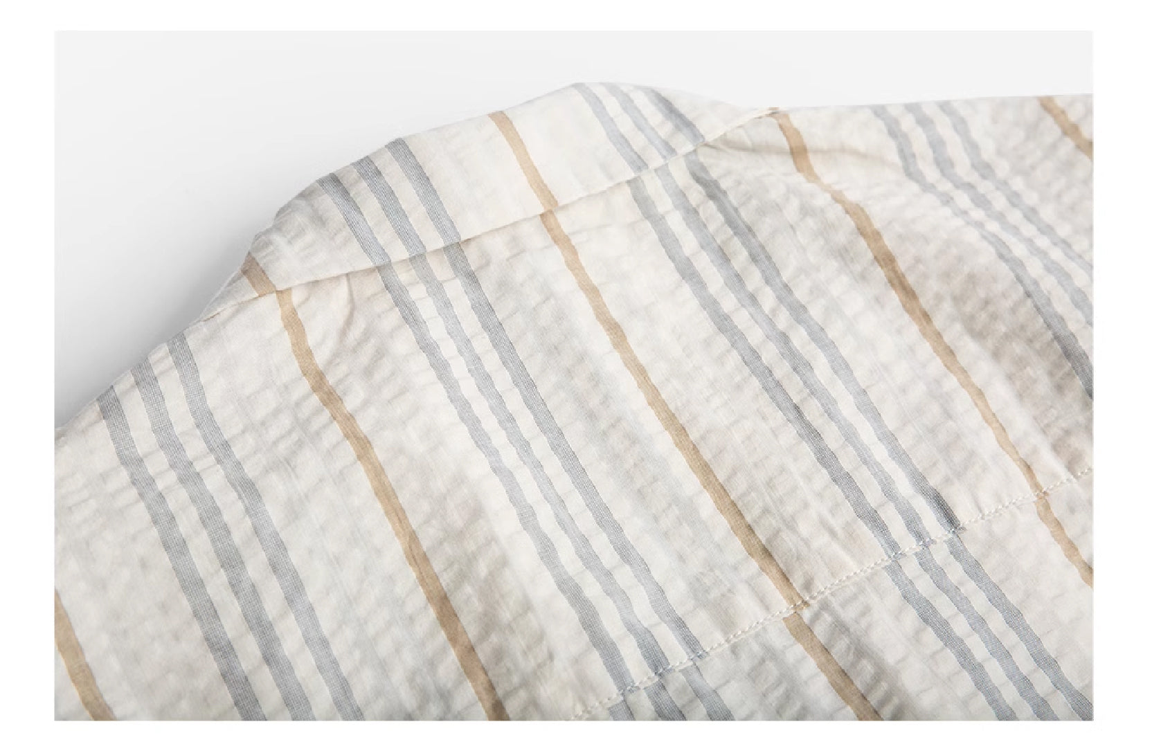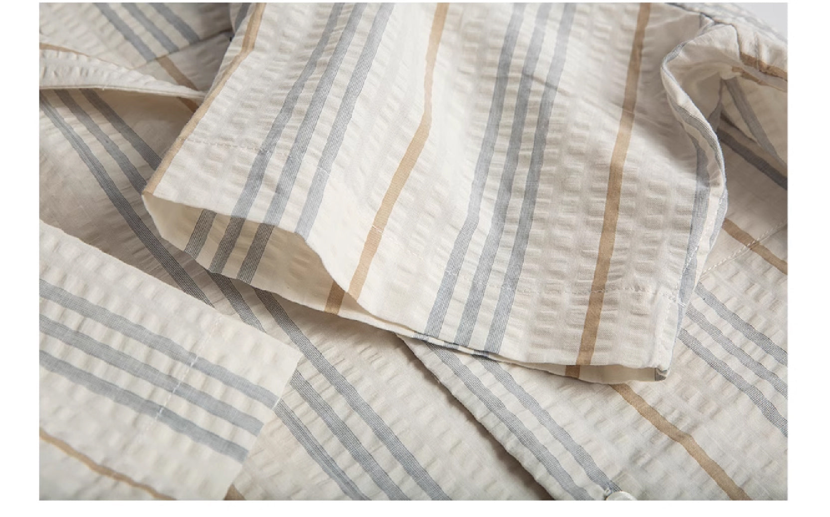 The seersucker striped shirt combines comfort. coolness. and elegance. making it an indispensable item in the summer wardrobe.