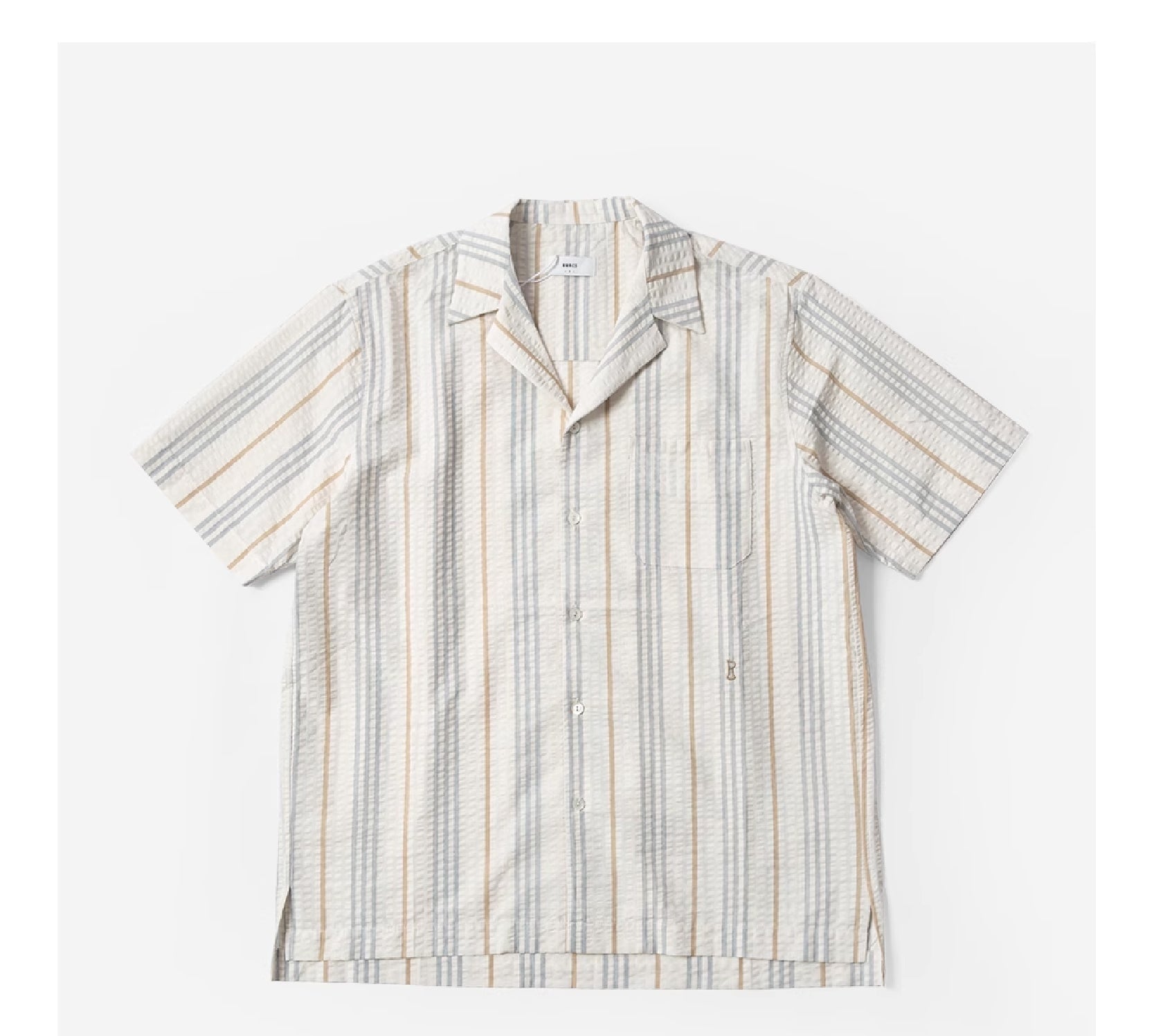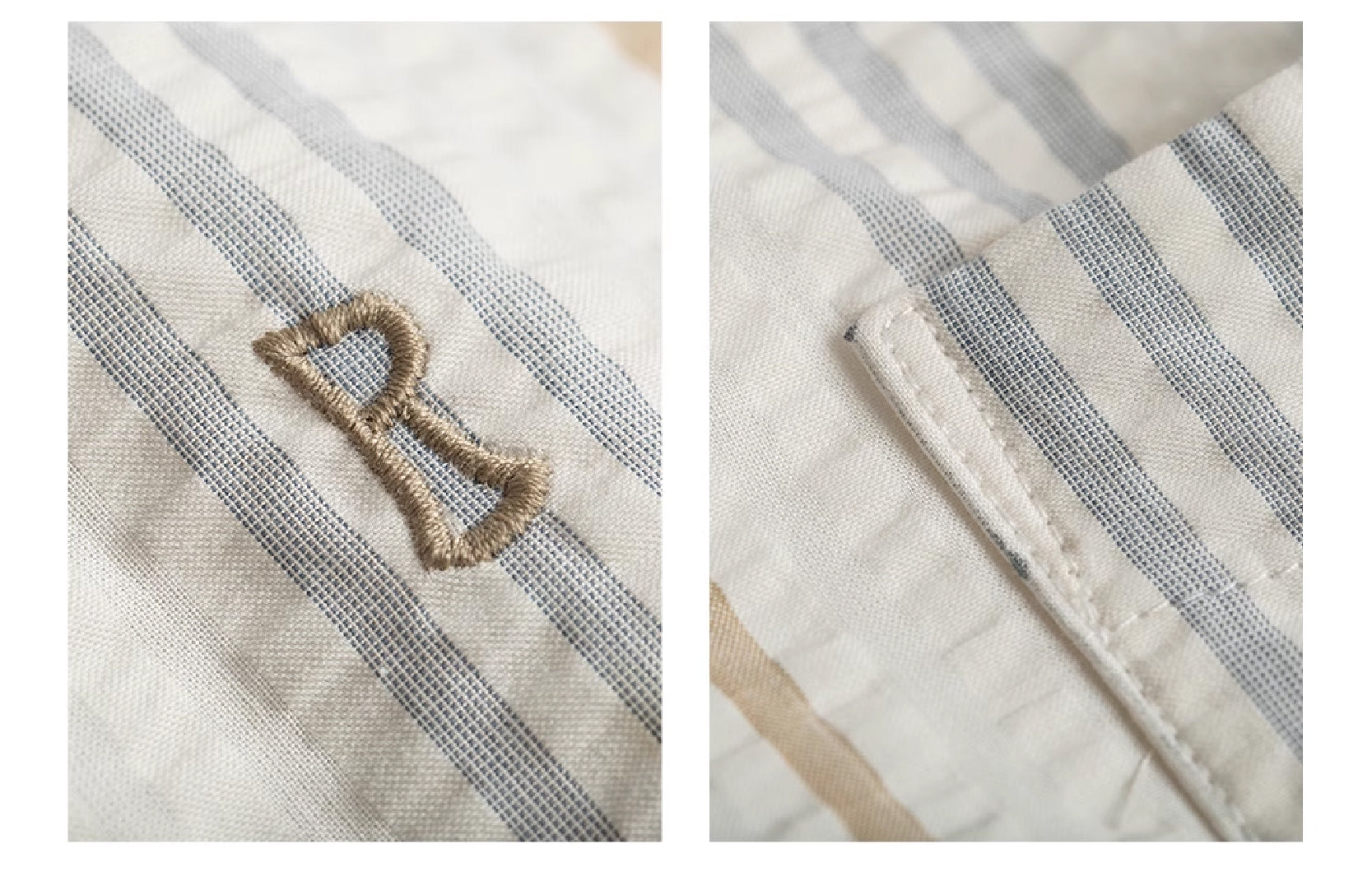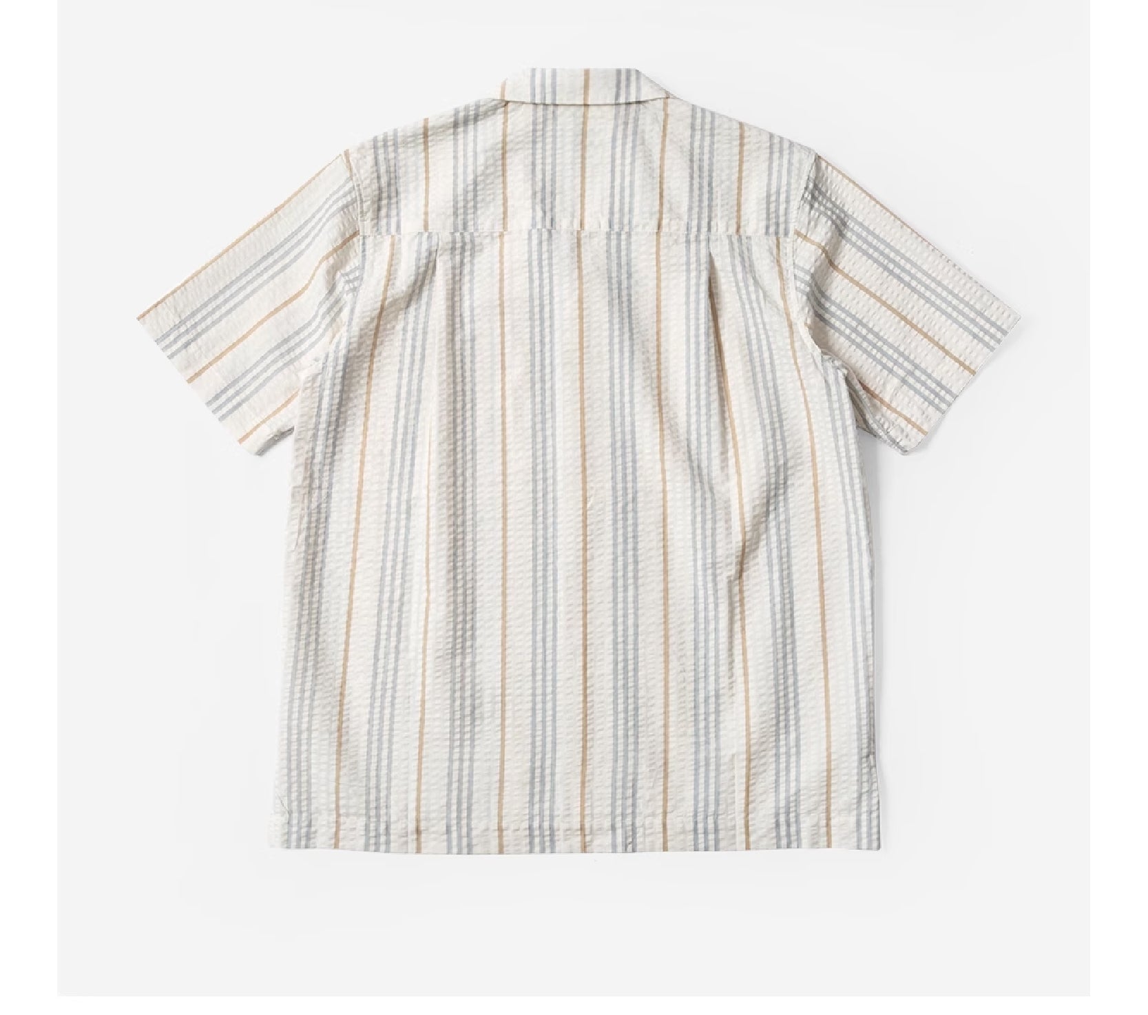 The seersucker striped shirt combines comfort. coolness. and elegance. making it an indispensable item in the summer wardrobe.