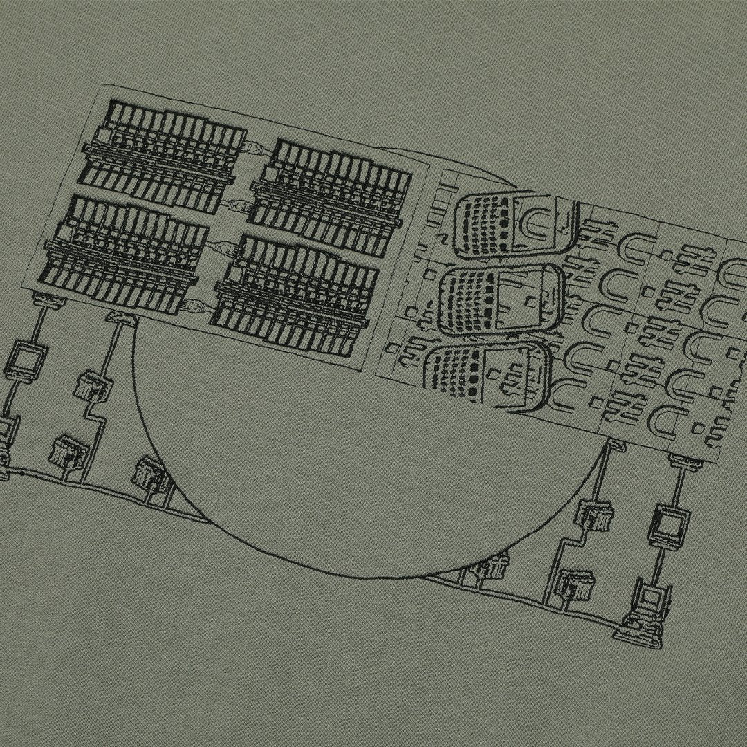 100% cotton. Sweat fabric. Crew neck. Pullover. Set-in sleeves. Embroidered graphic on front body. Fabric patches on front and back of back body. Reflector print on front back body. Silicon patch on upper left sleeve. Fabric switching under sleeves and at sides. Wide silhouette. Washed finish. Made in Japan.