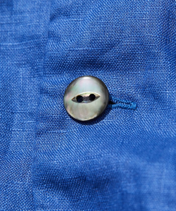 "I made this summer open-collar shirt out of 100% linen. I think this material is perfect for Japan's humid summer. At least in May. it has been keeping the shirt dry even in situations where you sweat. and it's excellent. Linen is a natural functional material that can be used all year round. with heat retention. durability. heat dissipation. and moisture absorption/quick drying properties. It keeps the body warm in winter and releases excess heat in summer. and absorbs water even when it gets wet from sweat and dries quickly. The 14-count smooth linen thread is used. so it is fine-grained. firm. and resilient. and even if you sweat. it has a dry surface and is always refreshing to wear." (AH)