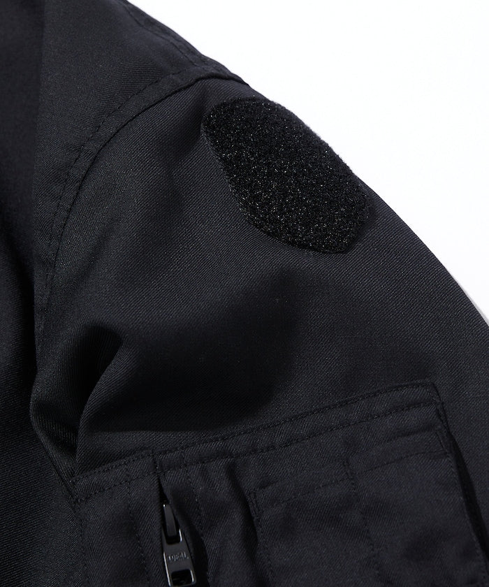 Based on the design of the helicopter crew Jacket adopted in the late 80's. we changed it to a big silhouette. The fabric is TW twill. a twill weave fabric of 70% polyester and 30% wool. It is characterized by being wrinkle-resistant and has just the right amount of fall. The material is easy to use and keeps you cool in the summer and warm in the winter. There is a chin strap on the back of the collar. and the front zipper is a size 8 double zip that gives a strong impression. The pocket on the back of the table can store a 13-inch PC. A removable CAHLUMN logo reflector patch is attached to the left chest.