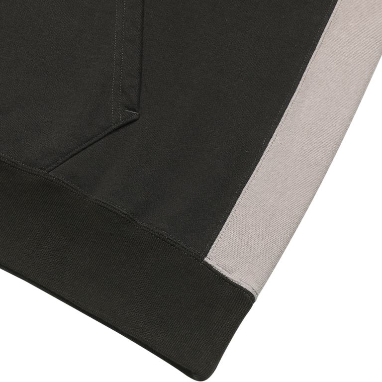 cotton 100%. sweat fabric. pullover. Set-in sleeve. Graphic on front. Cloth patch on front and back of back body. Reflector print on back body. Silicon patch on upper left sleeve. Muff pocket on front. Drawstring at hood. Colors and fabrics can be changed on the sleeves. sides. and hood. Wide silhouette. Wash processing. made in Japan.