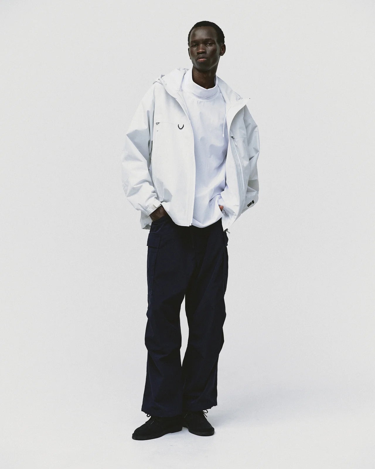 This shell parka incorporates military details. While simple. it features a new design with a waterproof zipper to prevent water from entering. The forward-flared sleeves. a military detail. add a design accent. Action pleats have been added to allow for greater arm movement.