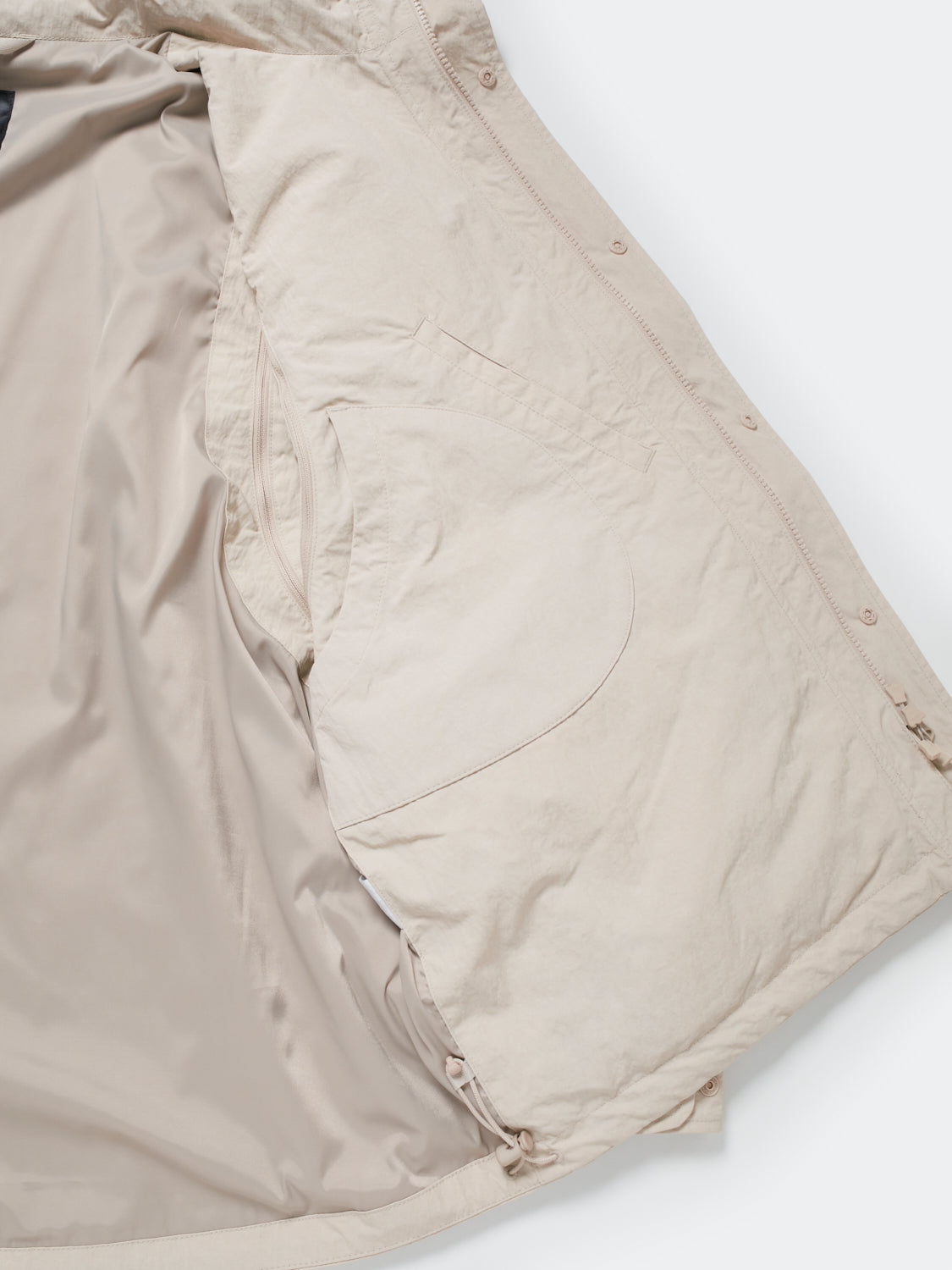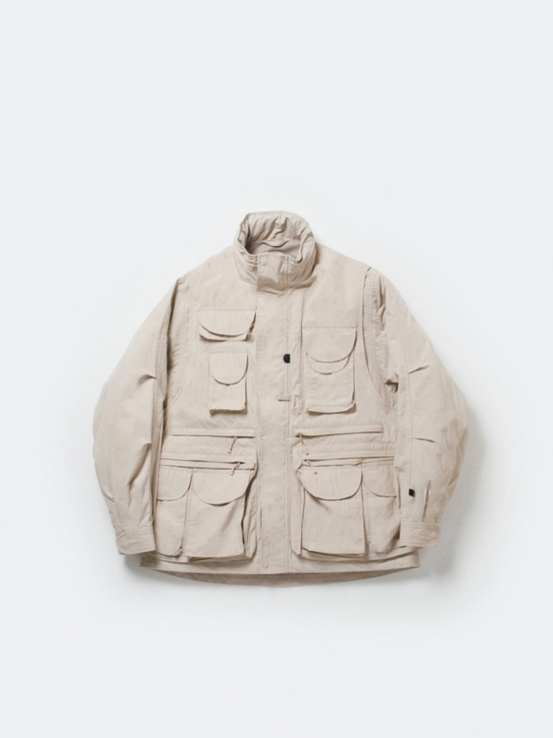 A simple hood is stored inside the stand-up collar. making it functional even when it rains lightly. The front sleeves. which are also military details. have design accents. action pleats. and the cuffs are designed to be adjustable. Design work that expands the range of motion during fishing and eliminates sagging cuffs.