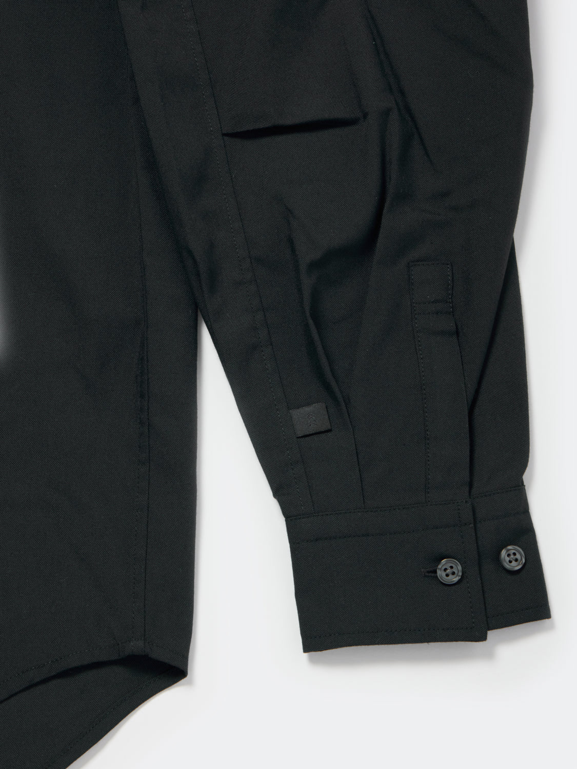 The action pleats on the sleeves. a characteristic of military wear. are a detail that does not hinder active arm movement.