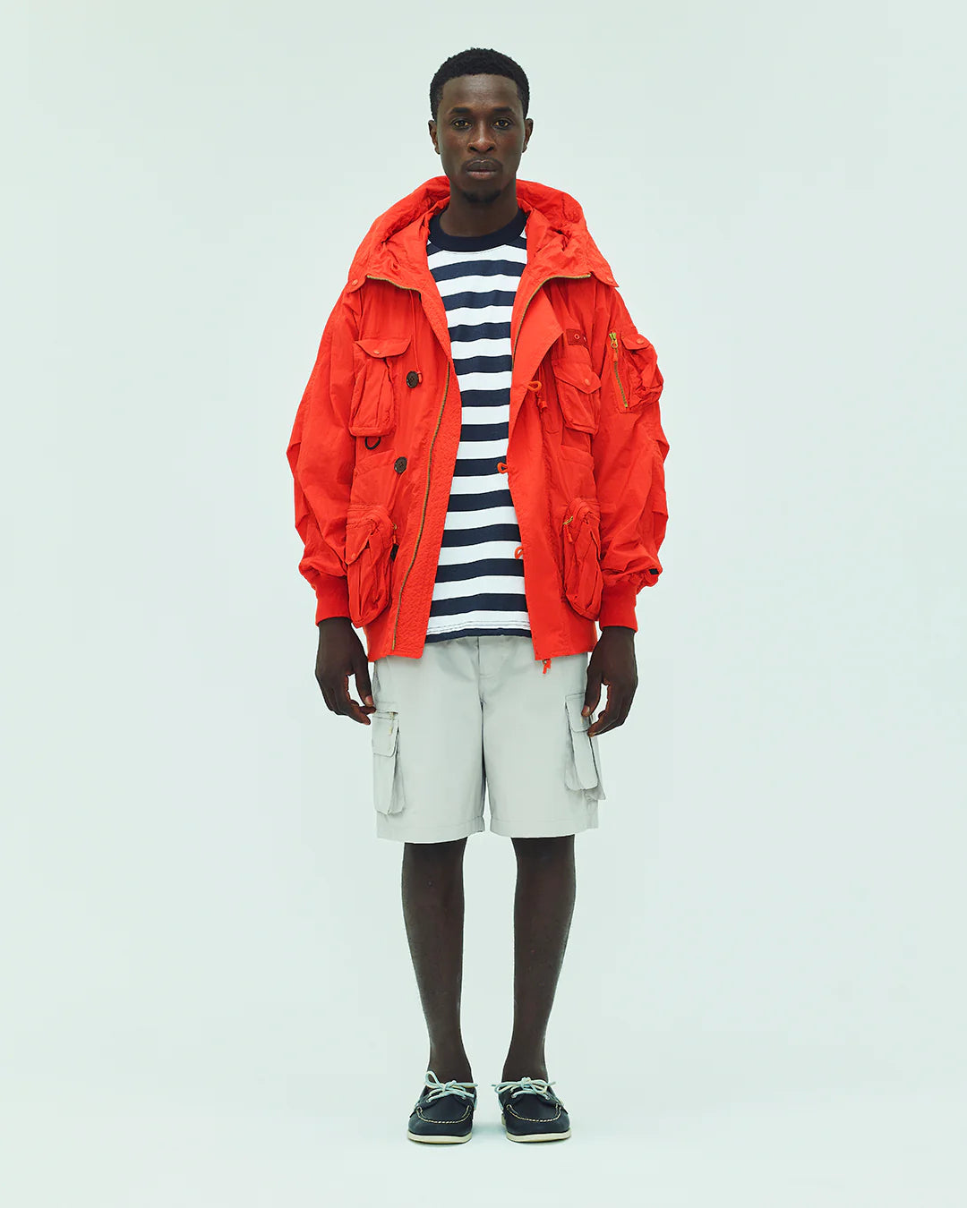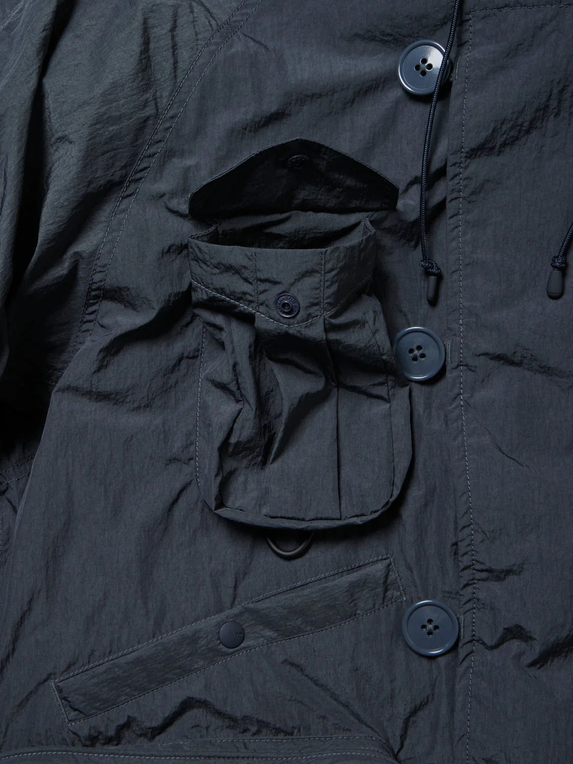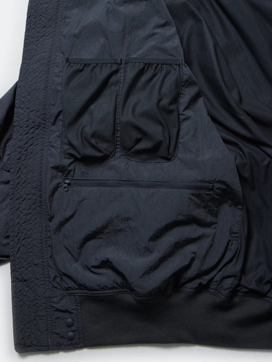 Fishing pocket work of various sizes has been added to the placket details and hood design of the N-2B flight jacket. In addition. the inside is designed with pockets of various sizes to store tackle cases. lure cases. mobile phones. etc. This blouson has more storage capacity than it looks.
