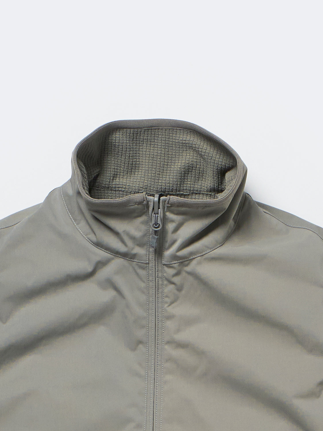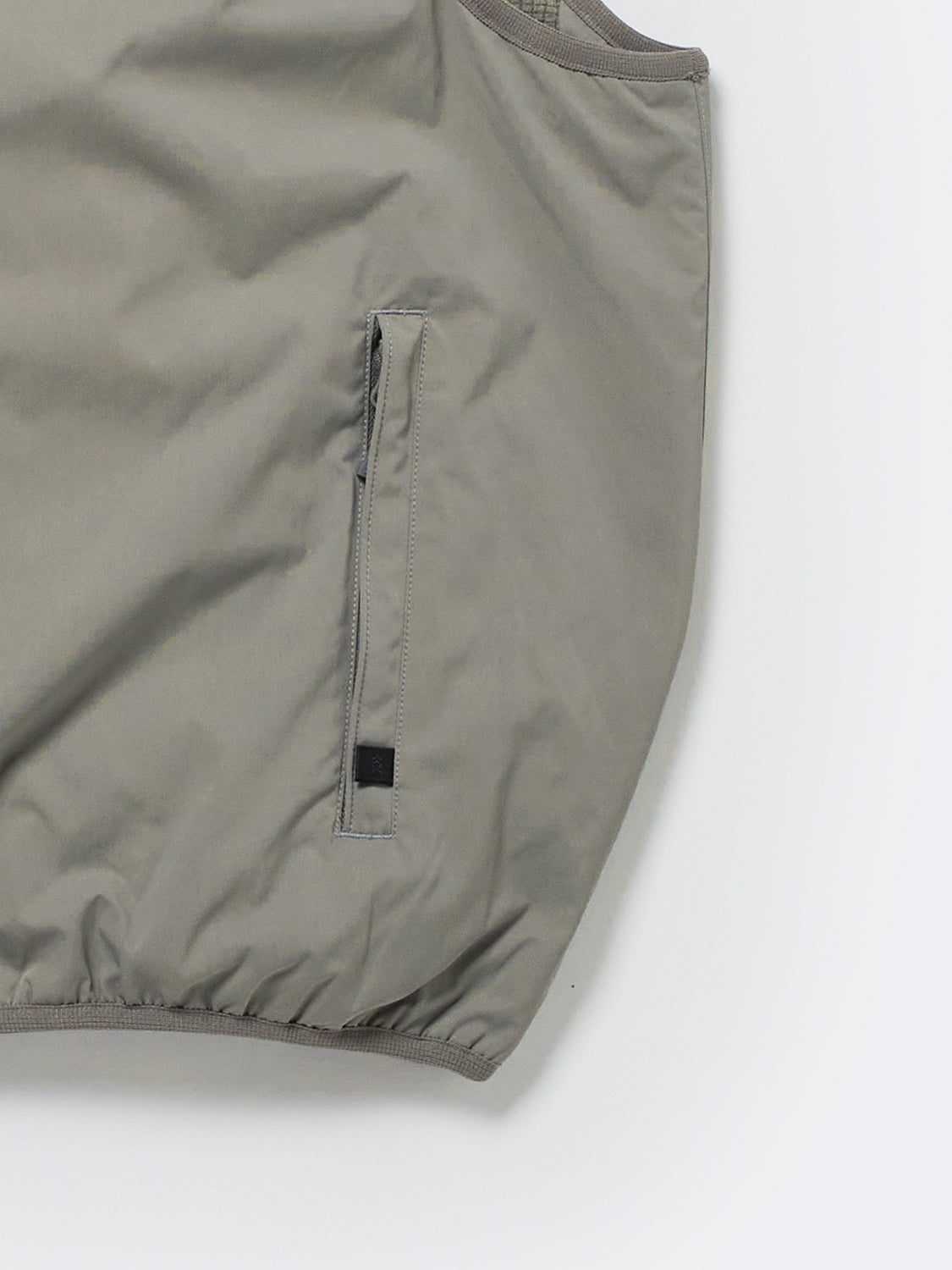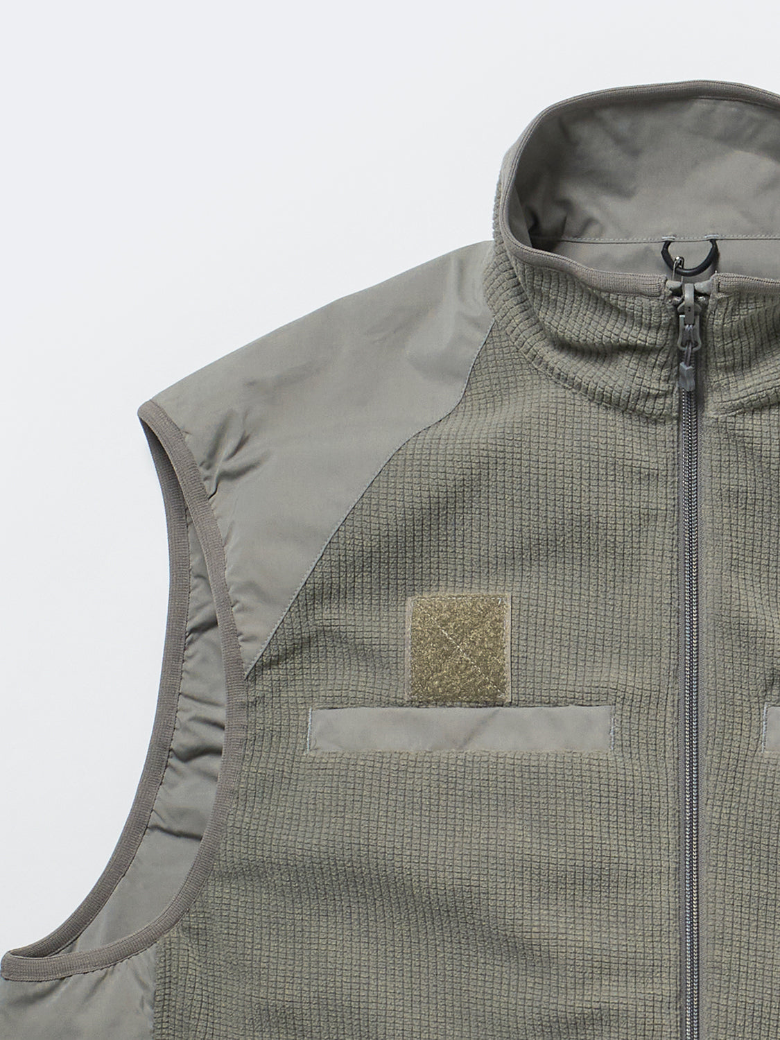 Recycled polyester yarn is used for the warp to create a soft. high-quality powder-touch texture. The high-density weaving creates an elegant material. A stand-up collar vest inspired by the U.S. military's ECWCS layering system. Although it incorporates a military design. by using a combination fabric of block fleece and nylon taffeta. you can wear it with a completely different look on the front and back.