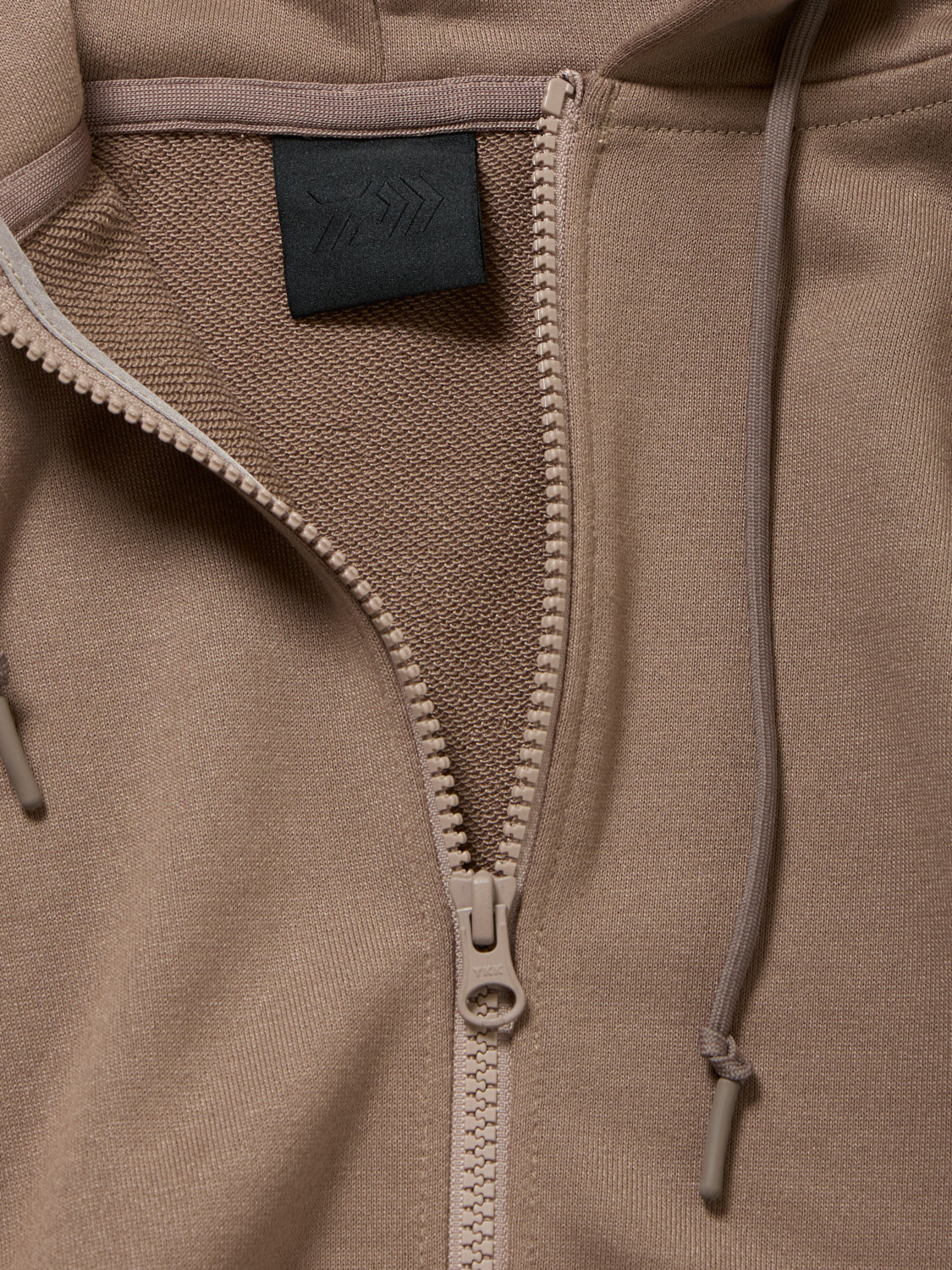 Freedom sleeve zip sweat hoodie with stretchy milling fabric on the sides.