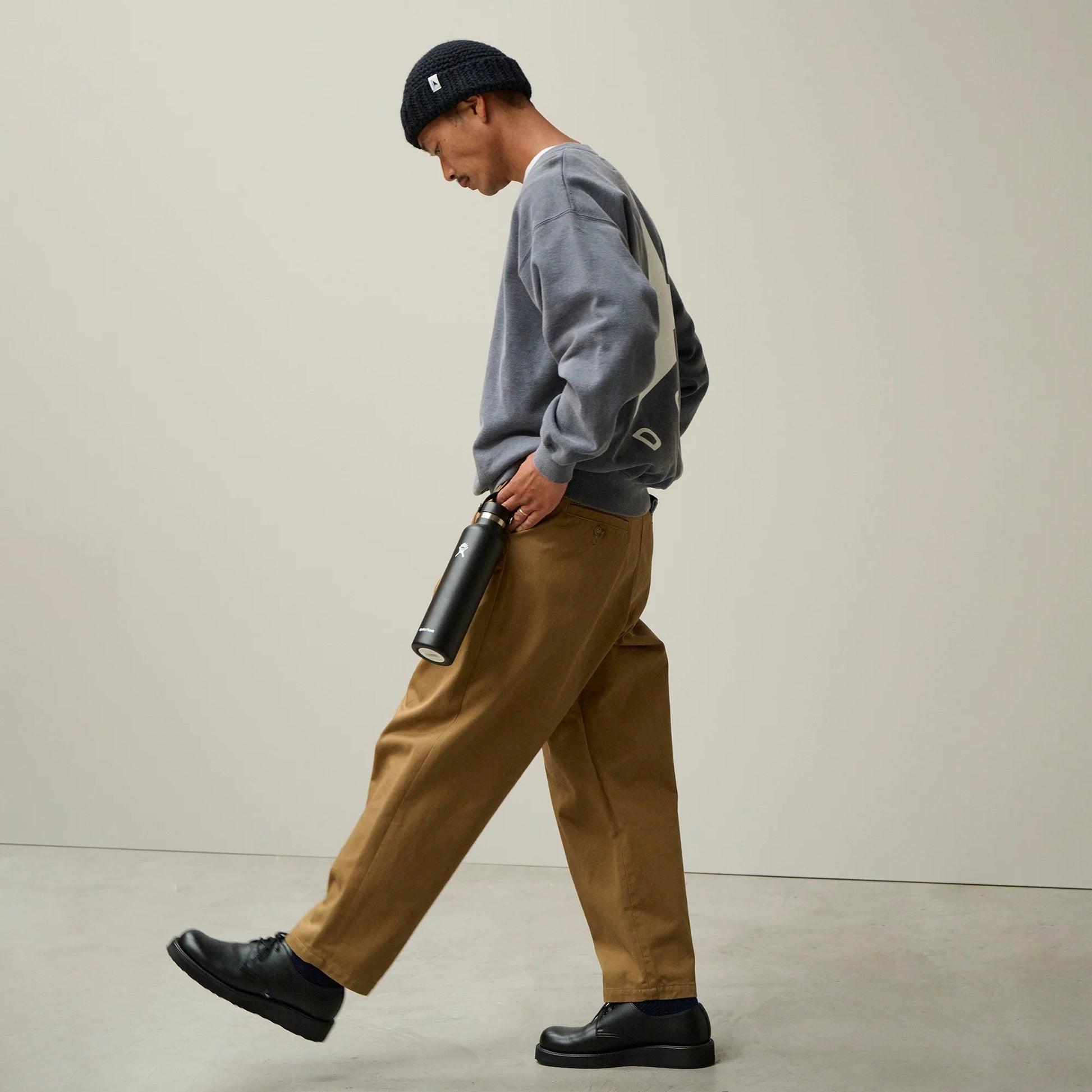 This crew neck sweatshirt is made from thick cotton fleece and features a diagonal CETUS graphic printed on the back. It comes in two pigment-dyed colors: navy and orange. It has a relaxed fit with a tapered hem. The neckline seam is piped with original tape. A woven CETUS label with the size displayed is attached to the right front hem.