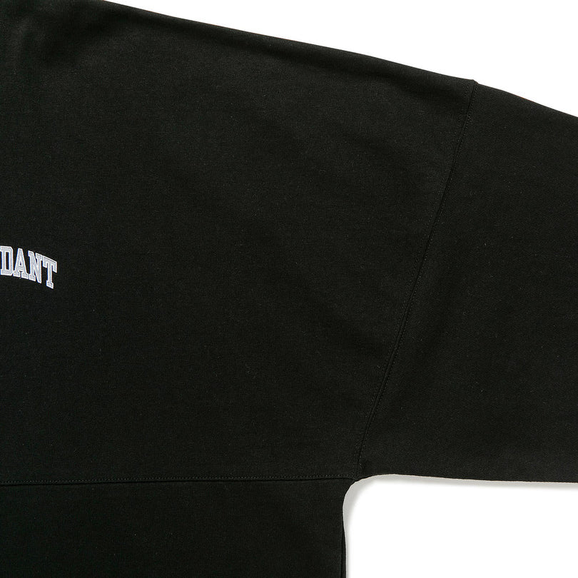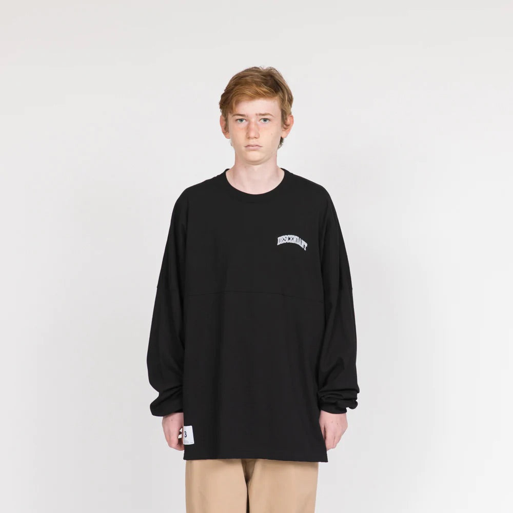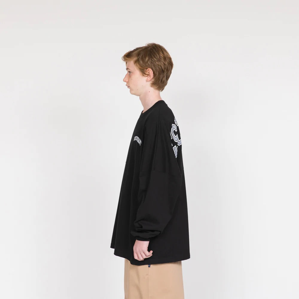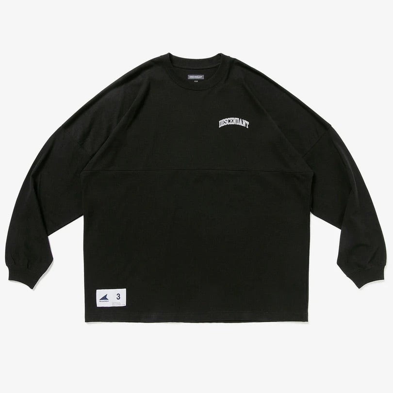 Cut-and-sew using cotton/recycled polyester blended knit jersey that switches the yoke's upper and lower body panels. A unique design that integrates the upper body with the sleeves. The TEAM logo is printed on the left chest and back. and an athletic label attached on the bottom right.