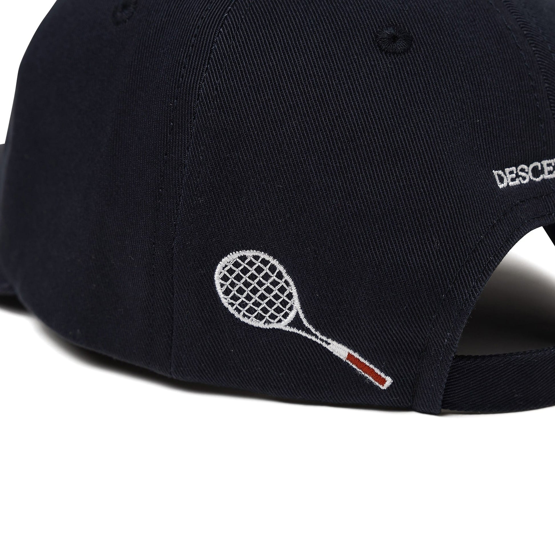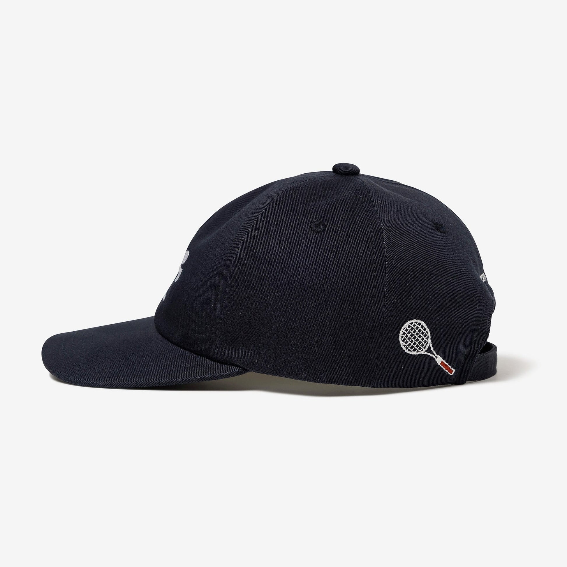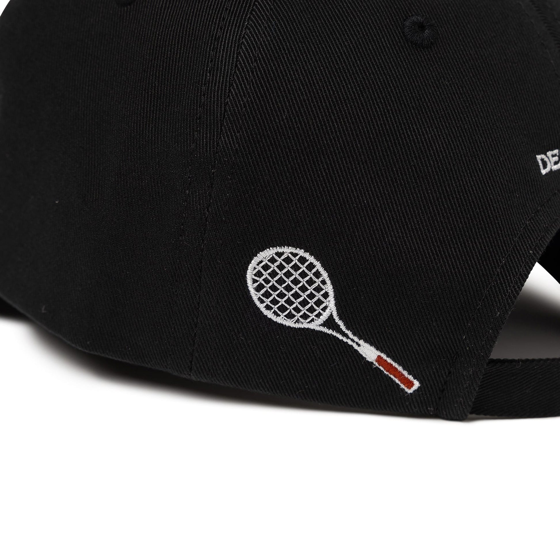 A 6-panel cap made from organic cotton cutlet. Embroidered DCDT crest on front panel. The back has an embroidered tennis racket and an adjuster strap in the same fabric.