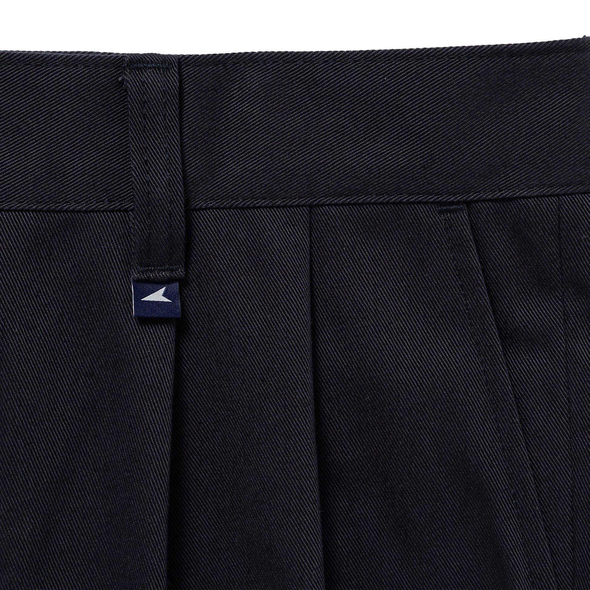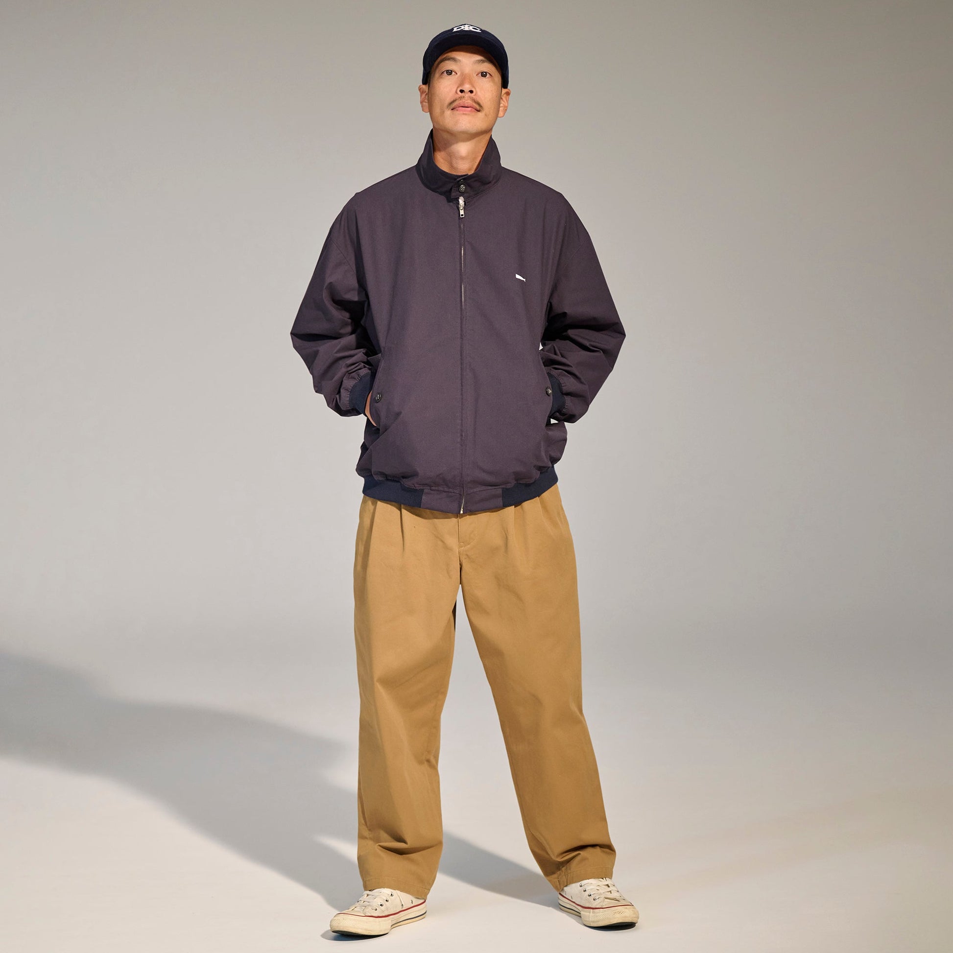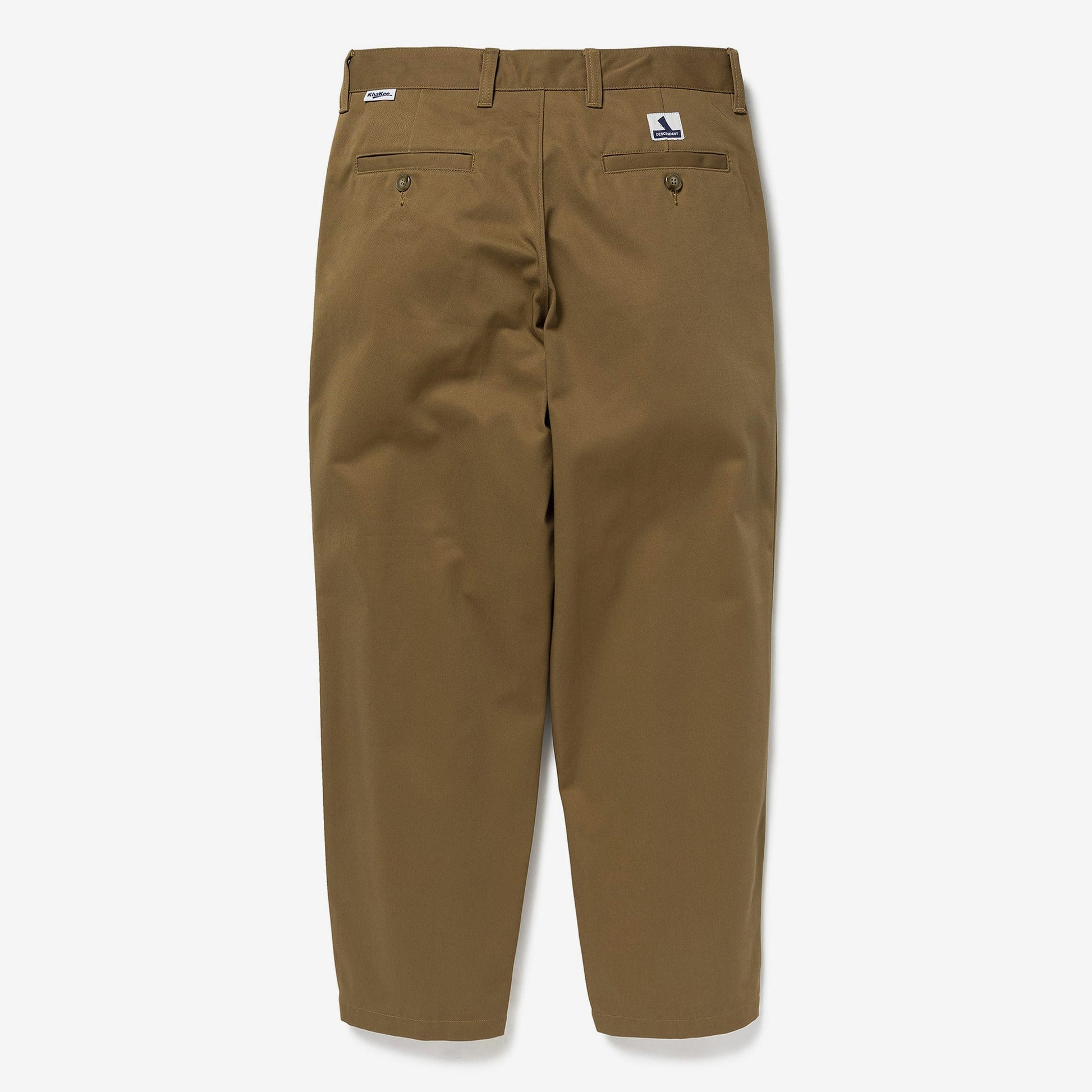 DC-3 twill trousers made from organic cotton twill with a tight weave. They have a loose tapered silhouette from the two-pleat waist to the hem. diagonal side pockets and single-welt hip pockets. and a SPYHOP patch on the back.