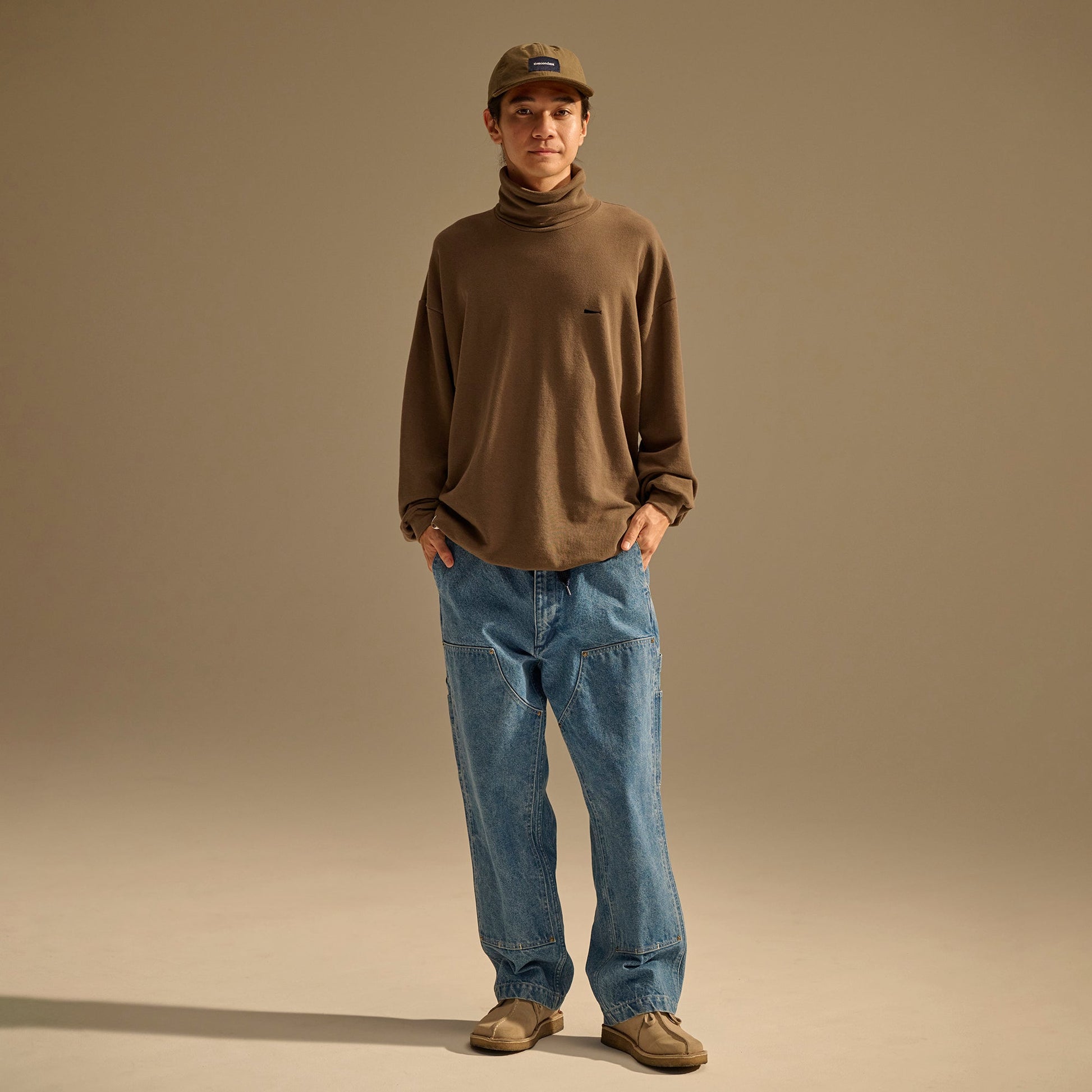 DWU series painter pants made of 14.5 oz cotton denim with bio-wash processing to express the aged look. A loose silhouette with hammer loop. tool pocket. and double knee with reinforced front. DWU woven name and box logo patch on the back.