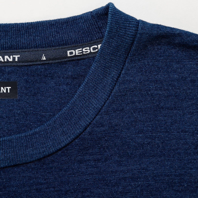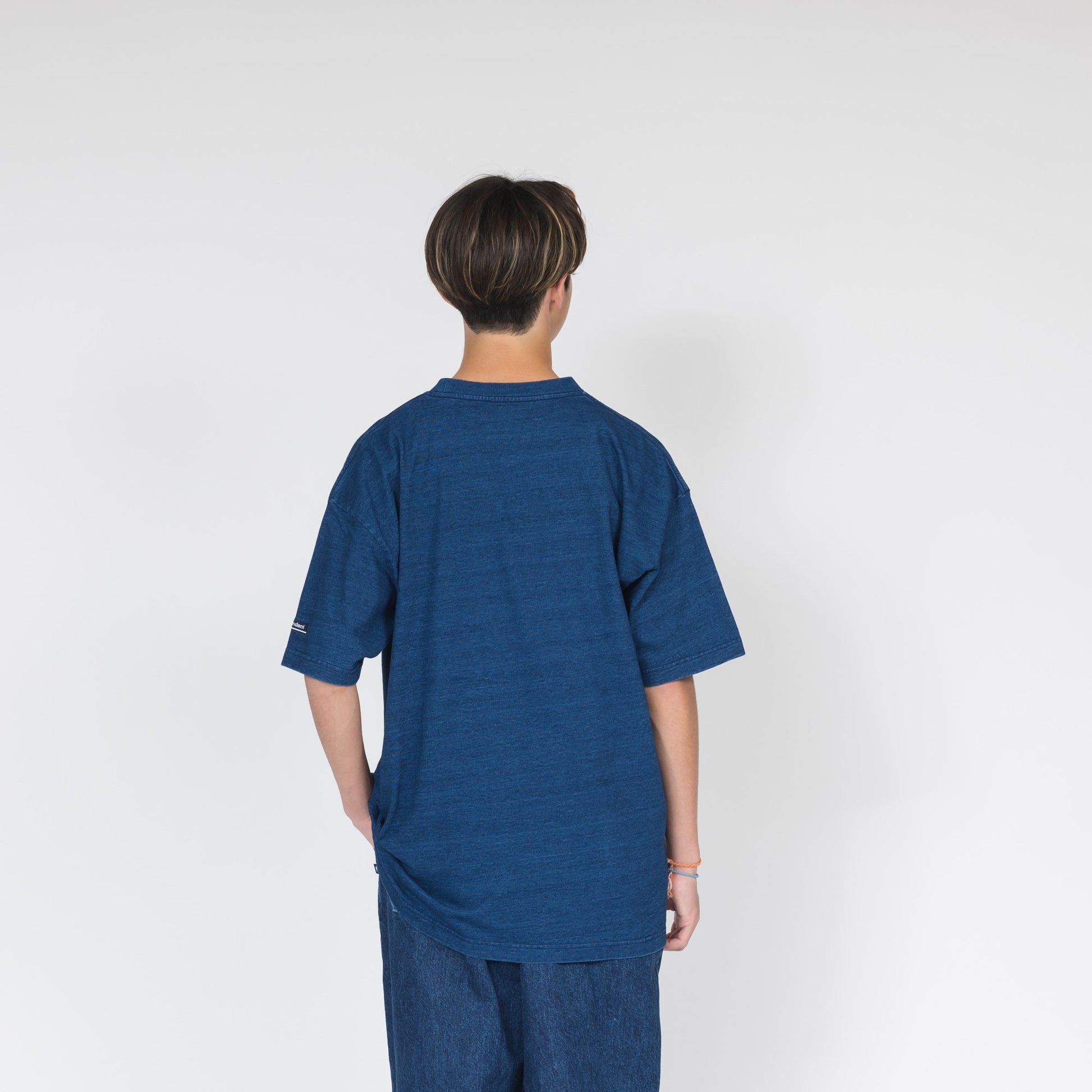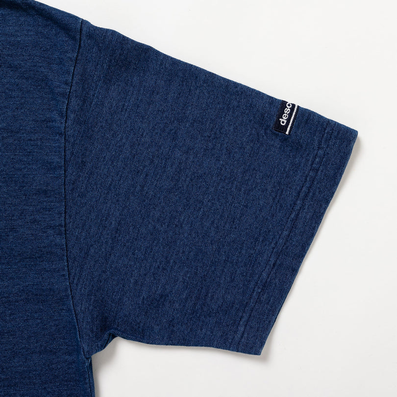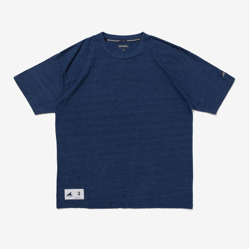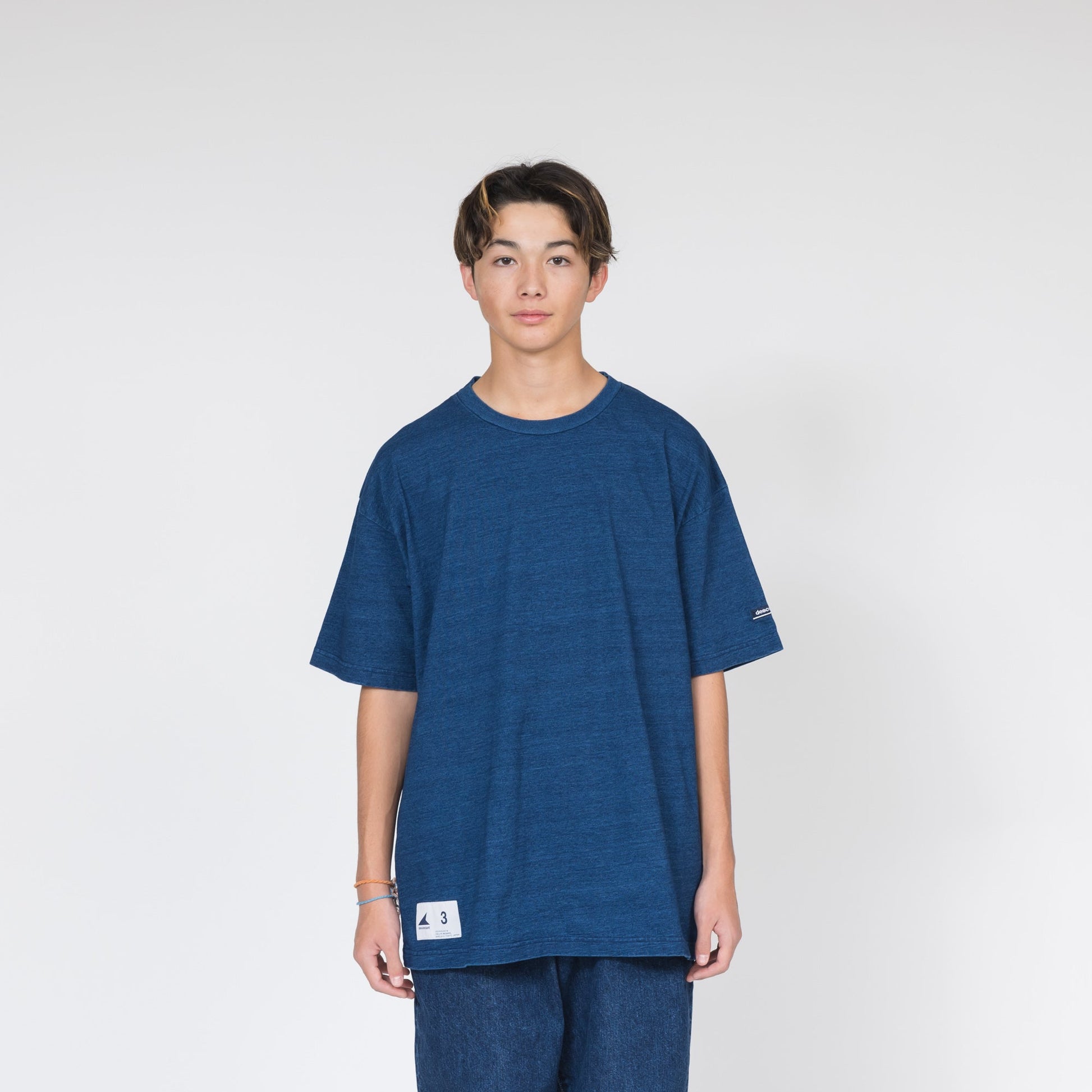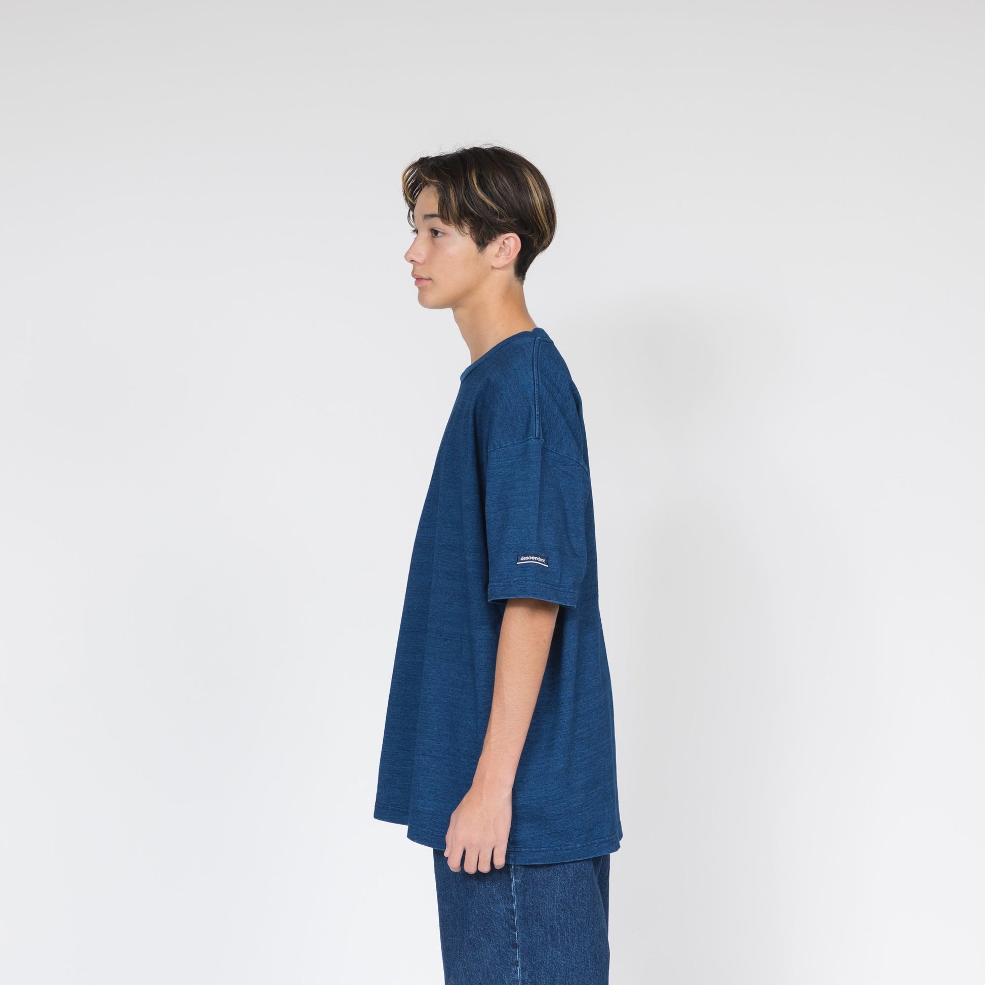 Indigo blank T-shirt made of yarn-dyed cotton jersey. Loose. wide-bodied silhouette. ribbed crew neck. HORIZON colour embroidery on upper left arm.