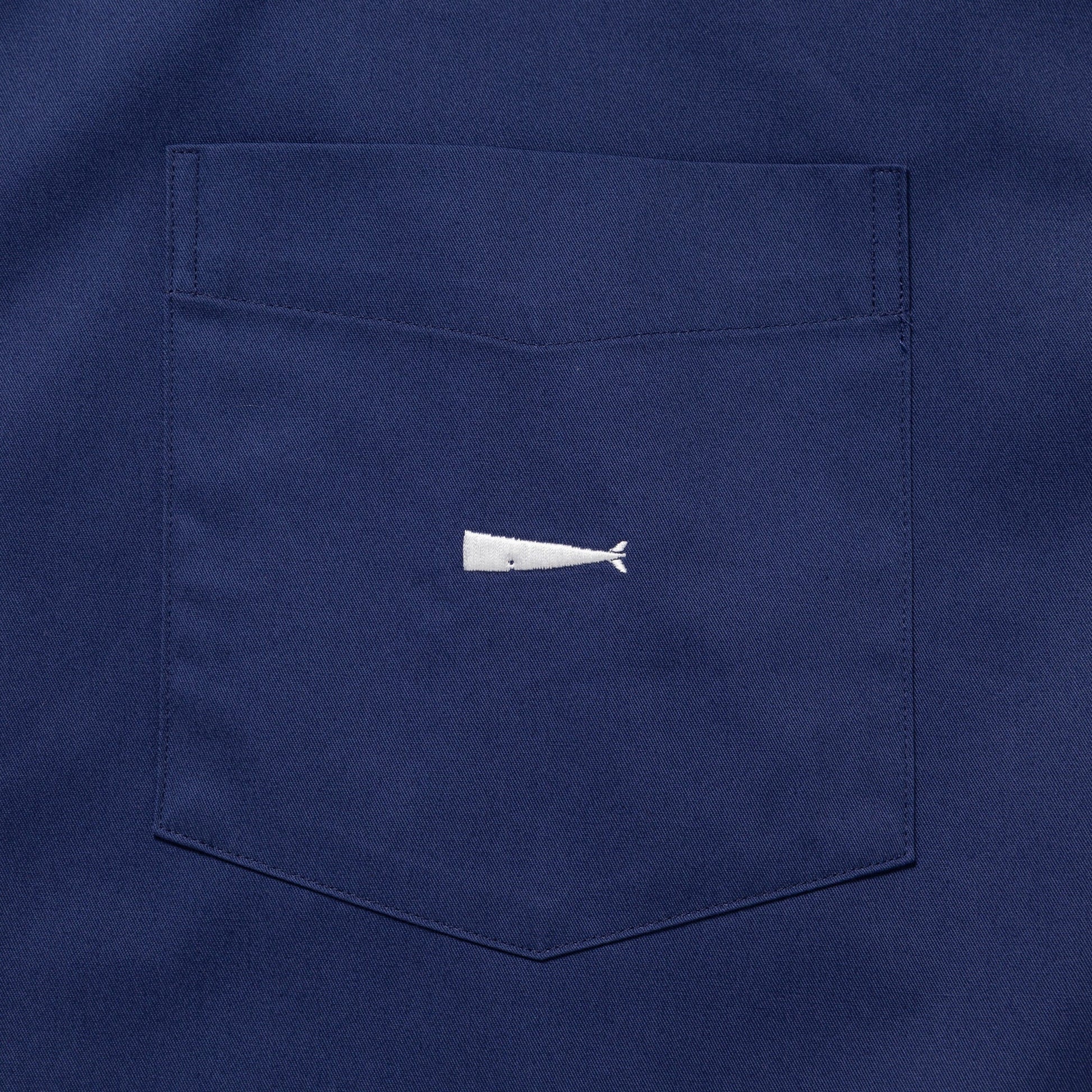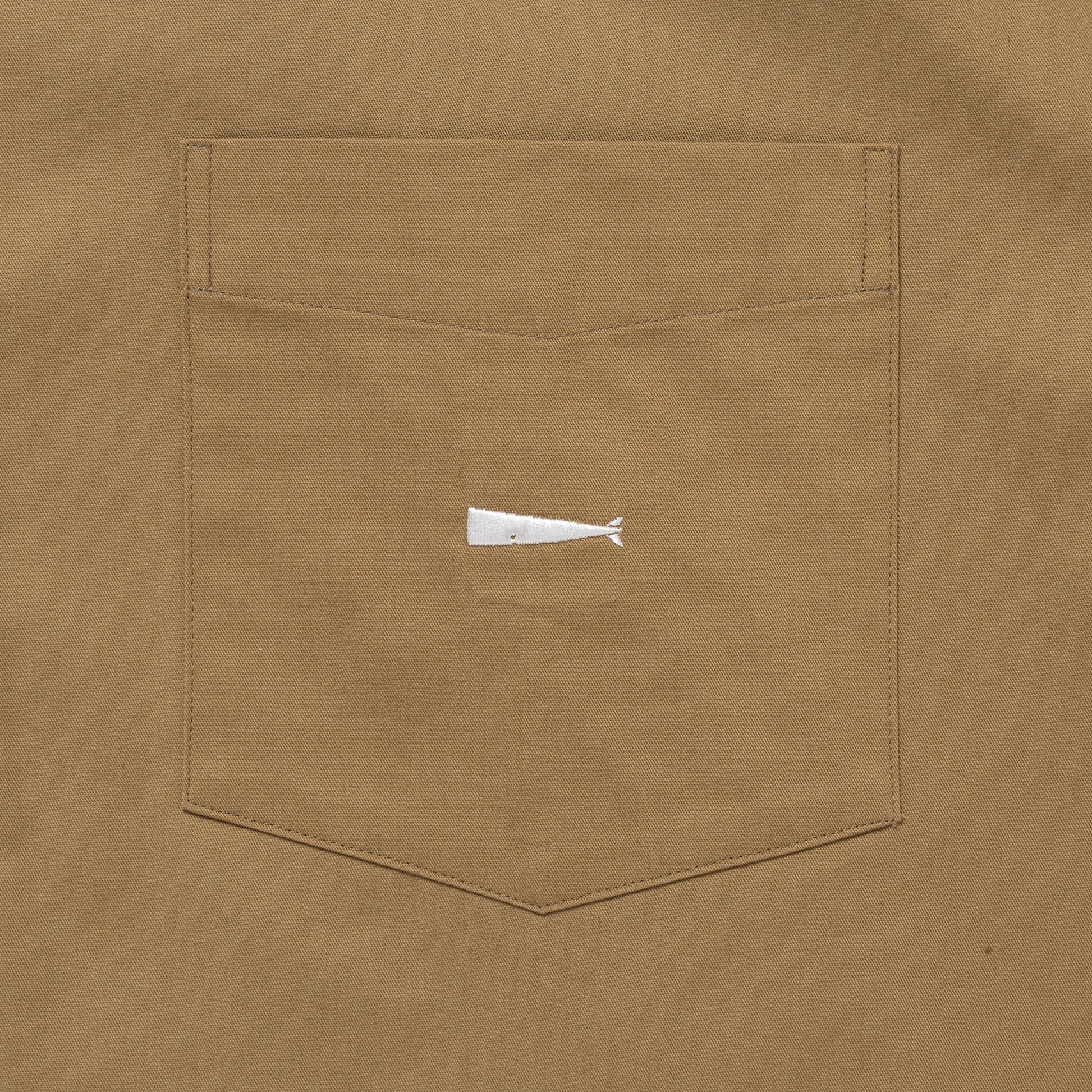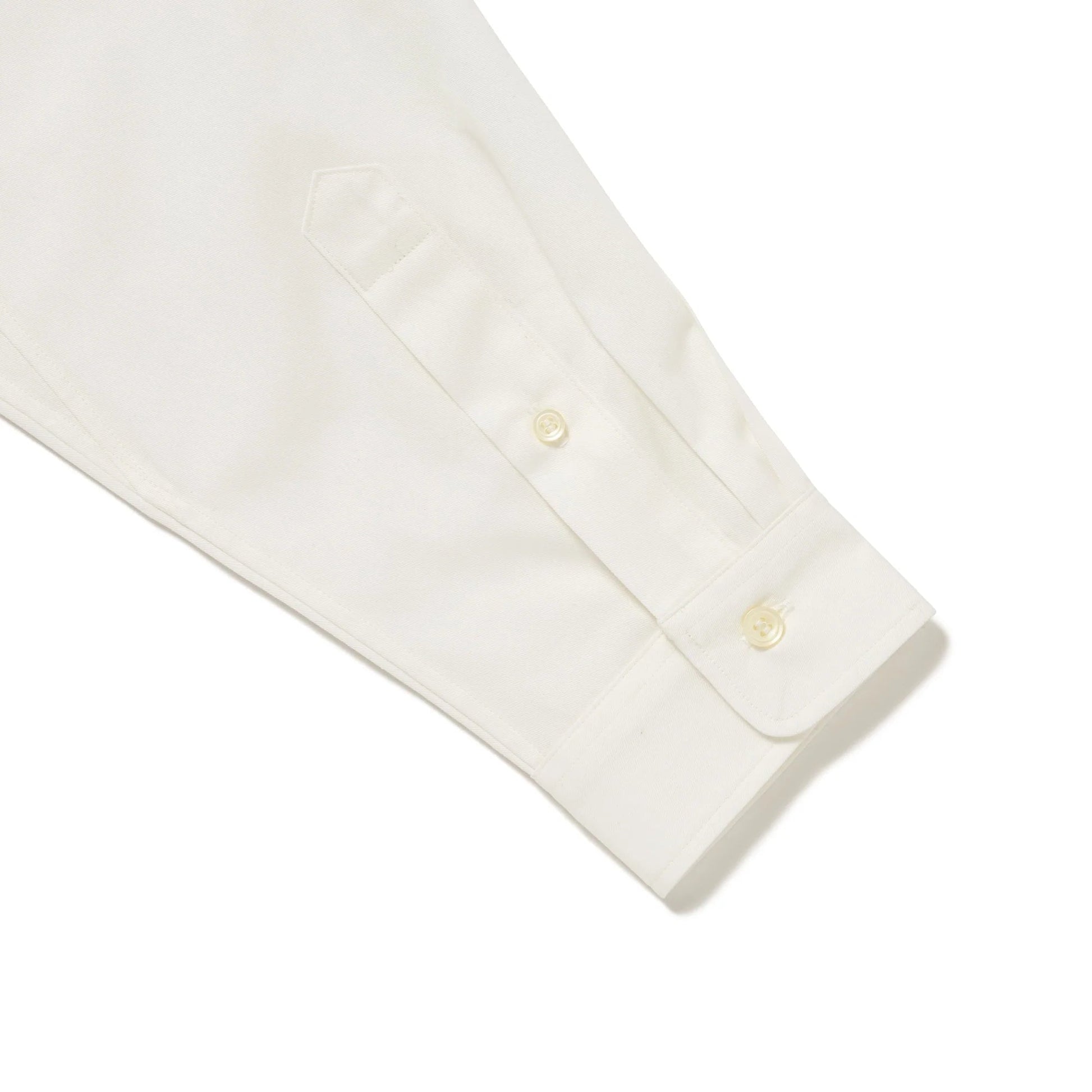 This button-down shirt is crafted from lustrous. crisp cotton twill. It features a relaxed silhouette. a B.D. collar. a center box pleat with a loop. and a sword-like boro design with gauntlet button closure. The CACHALOT logo is embroidered on the left chest pocket.