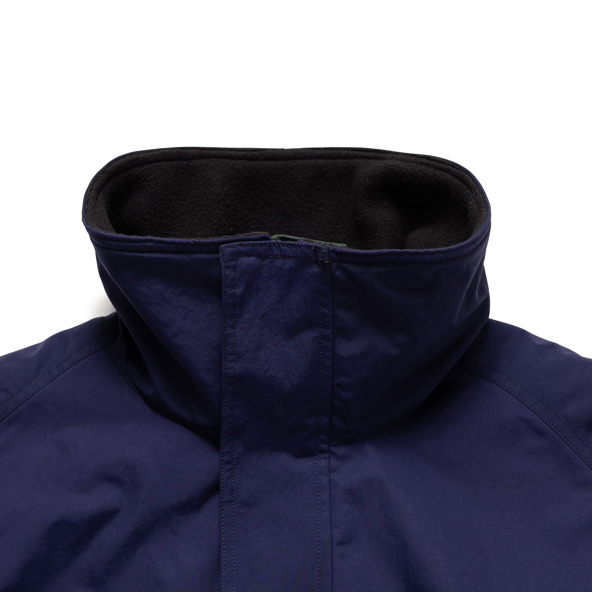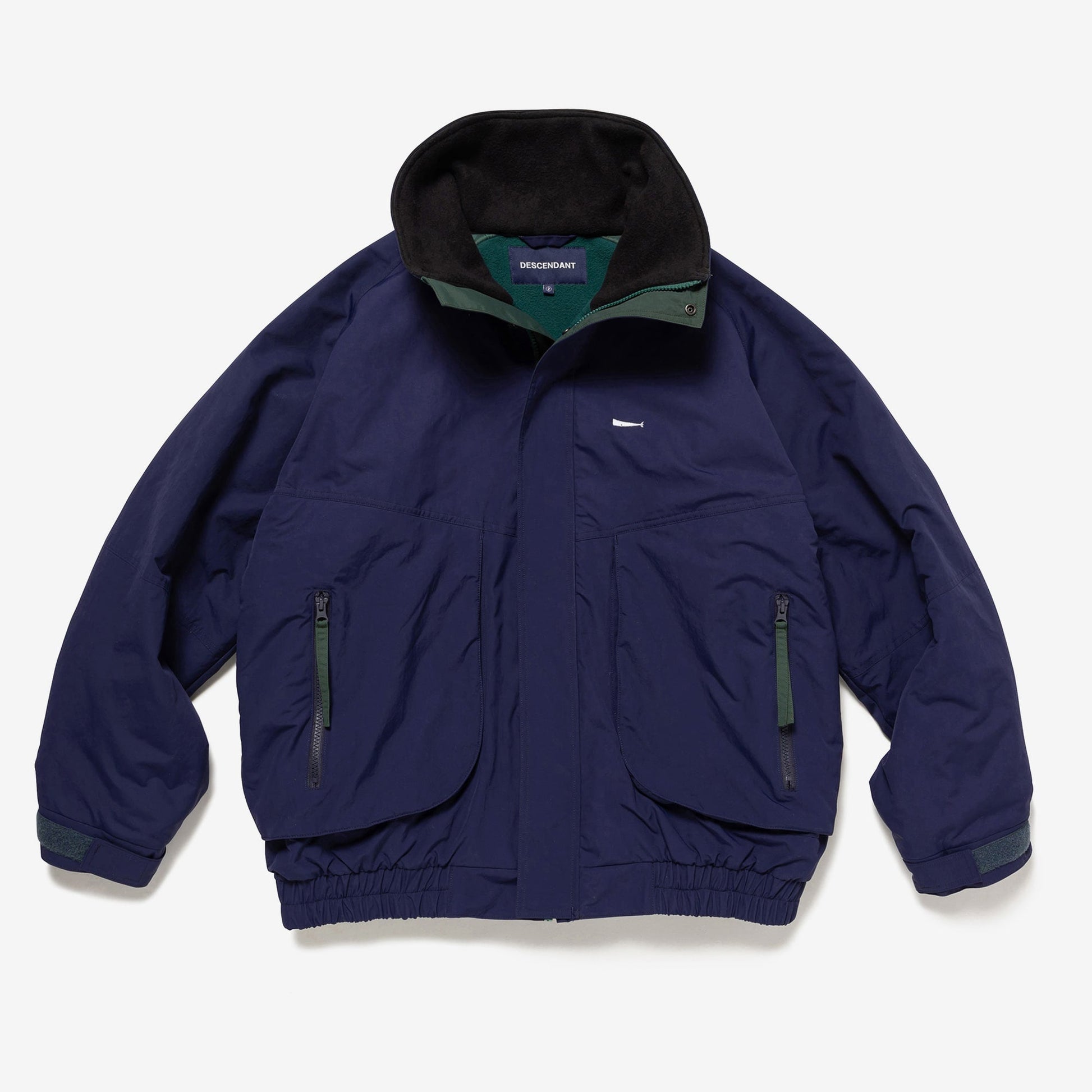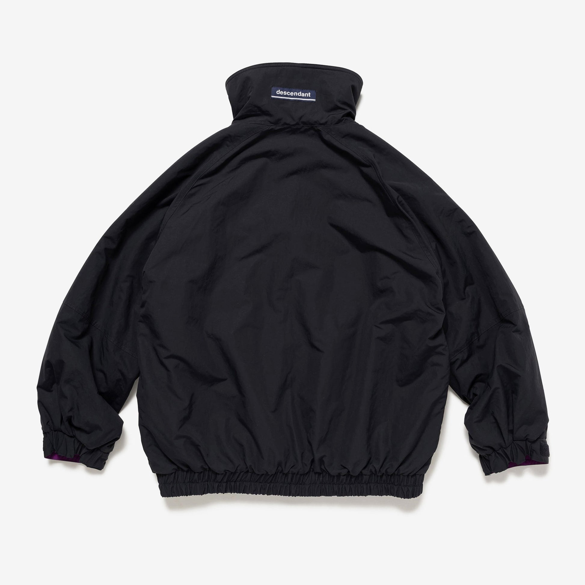 A nylon jacket with raglan sleeves. made of color-coordinated nylon taffeta and lined with fleece. It has hand warmers with gussets on both sides of the front. CACHALOT embroidery on the left chest. and a HORIZON logo on the back of the collar.