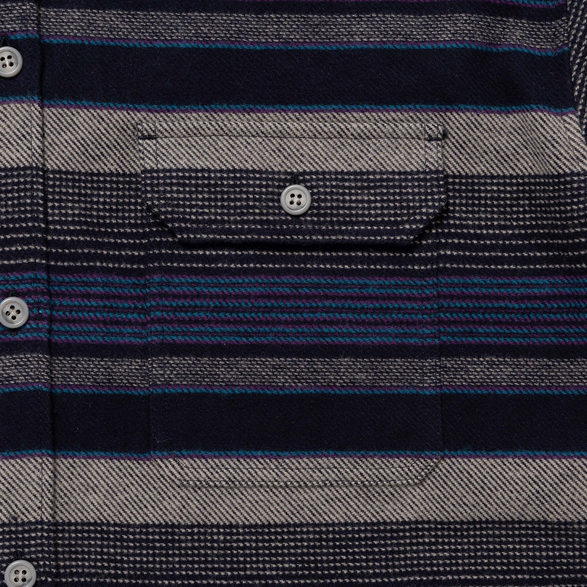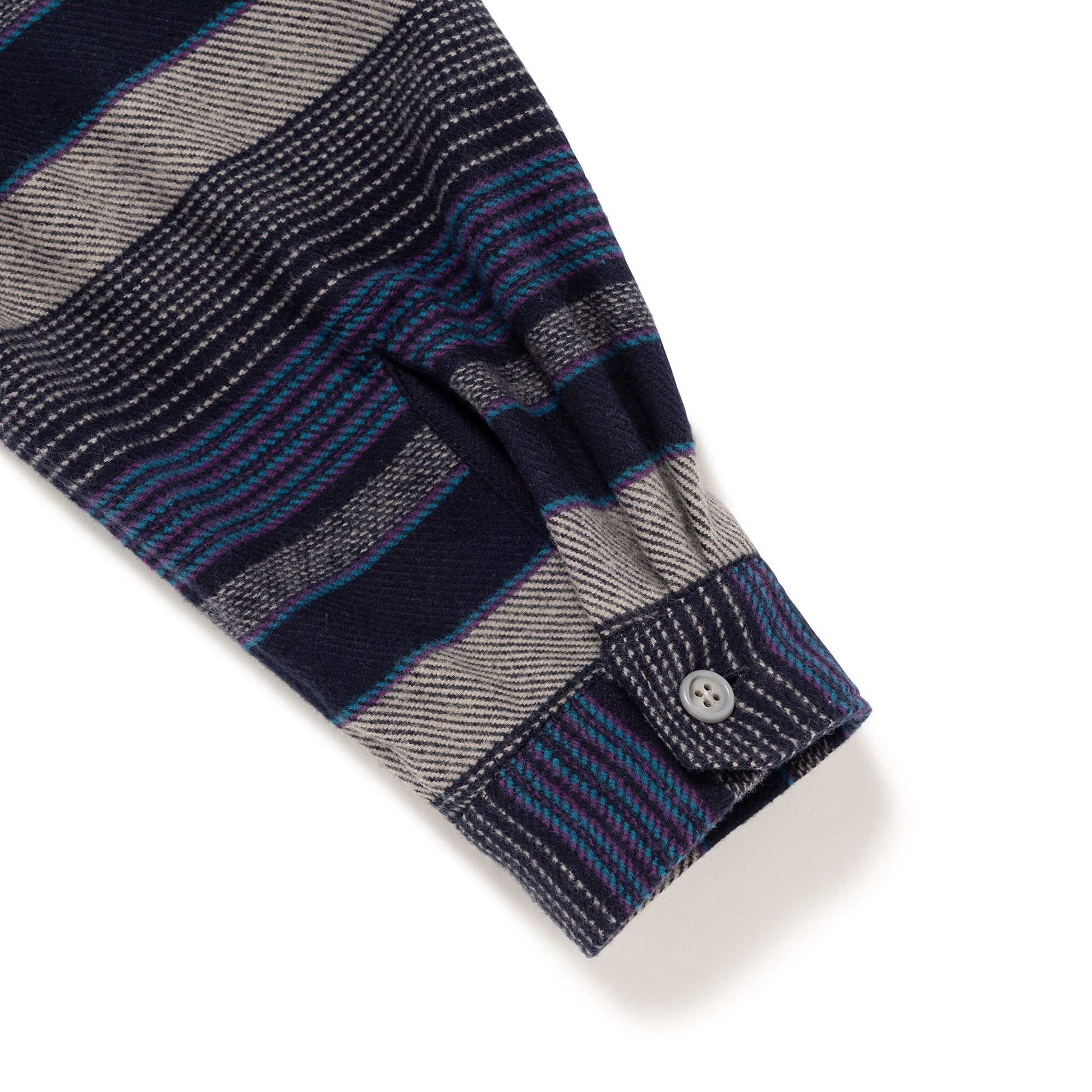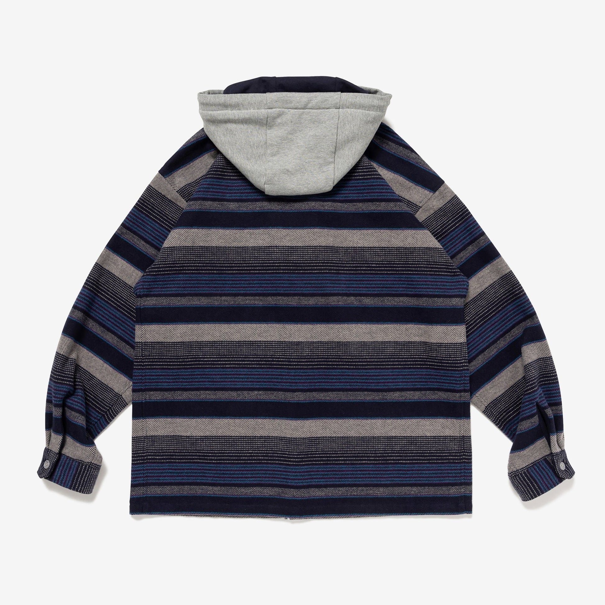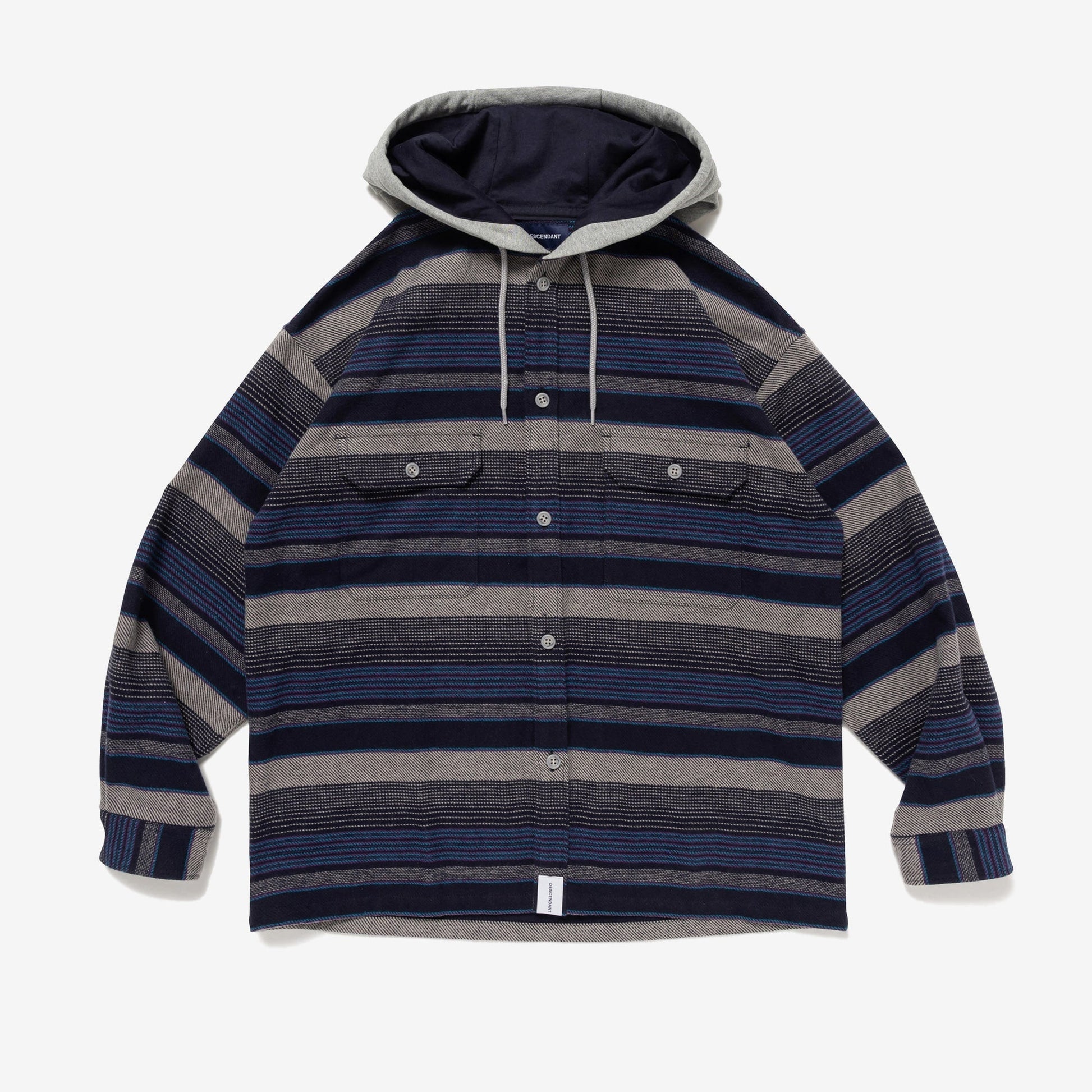 A hooded shirt made from an original striped yarn-dyed cotton fabric. The cotton fleece hood is two-tone. It has a loose box silhouette and flap pockets on both sides of the front.