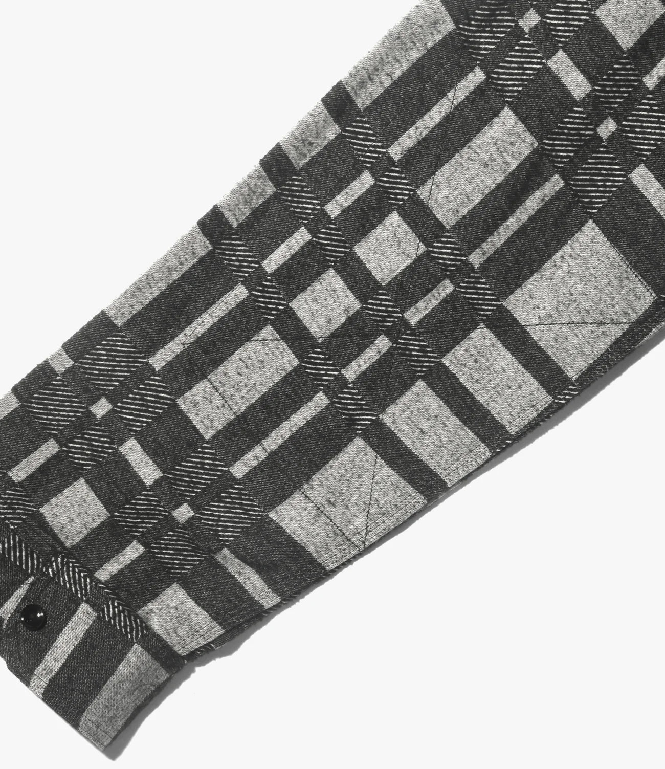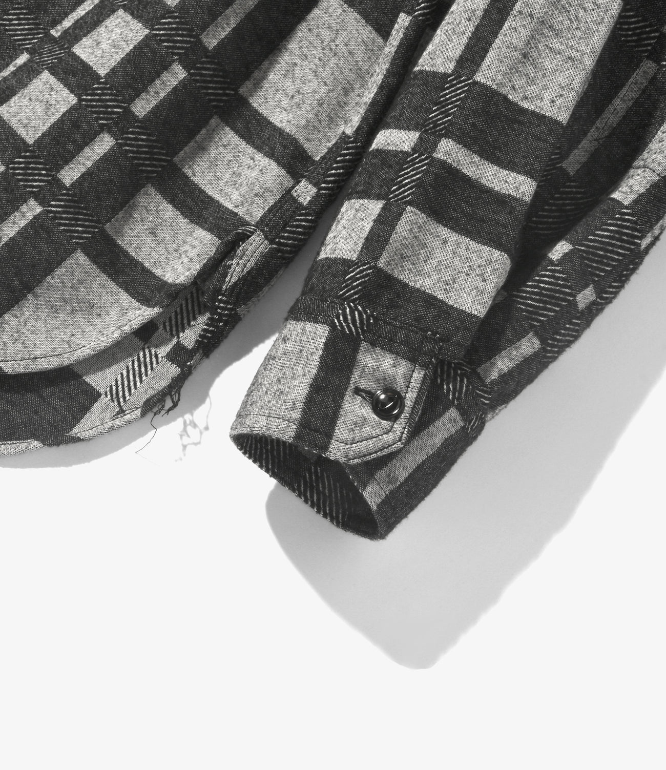 The "ENGINEERED GARMENTS" work shirt is a classic shirt and a popular choice every season. It features asymmetrical breast pockets with a mountain-shaped pocket and pen holder. reinforced fabric on the elbows. cat-eye buttons. and other details found on vintage shirts. Single. double. and triple stitches are skillfully used in different parts. and the attention to detail can be seen in this gem. The fabric has a unique check pattern with a soft feel and expression.