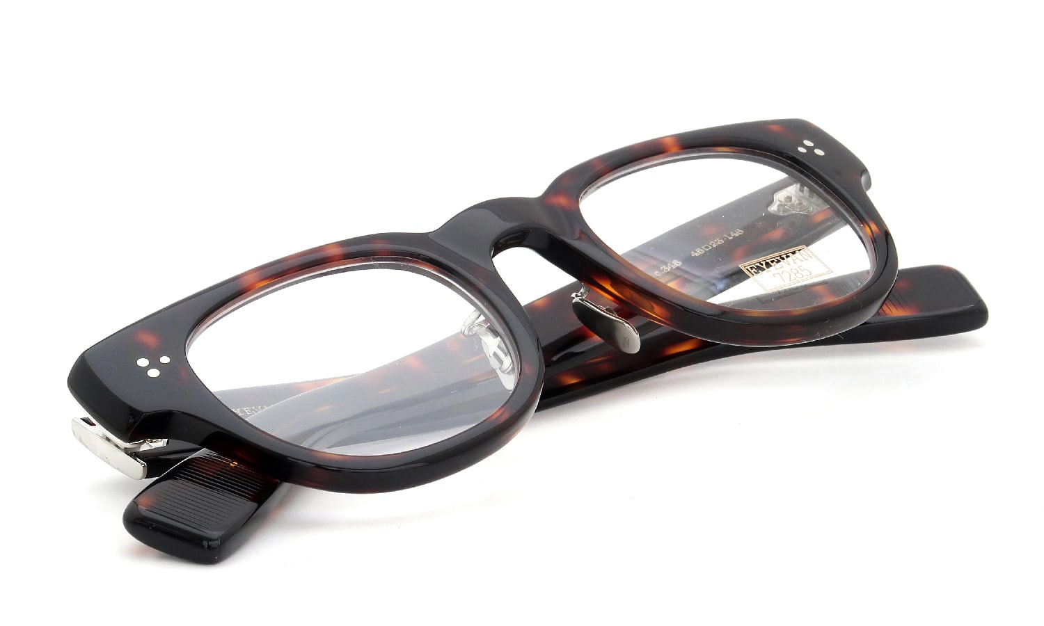 The finely detailed hinge on the back contrasts with the thick. relaxed acetate front.