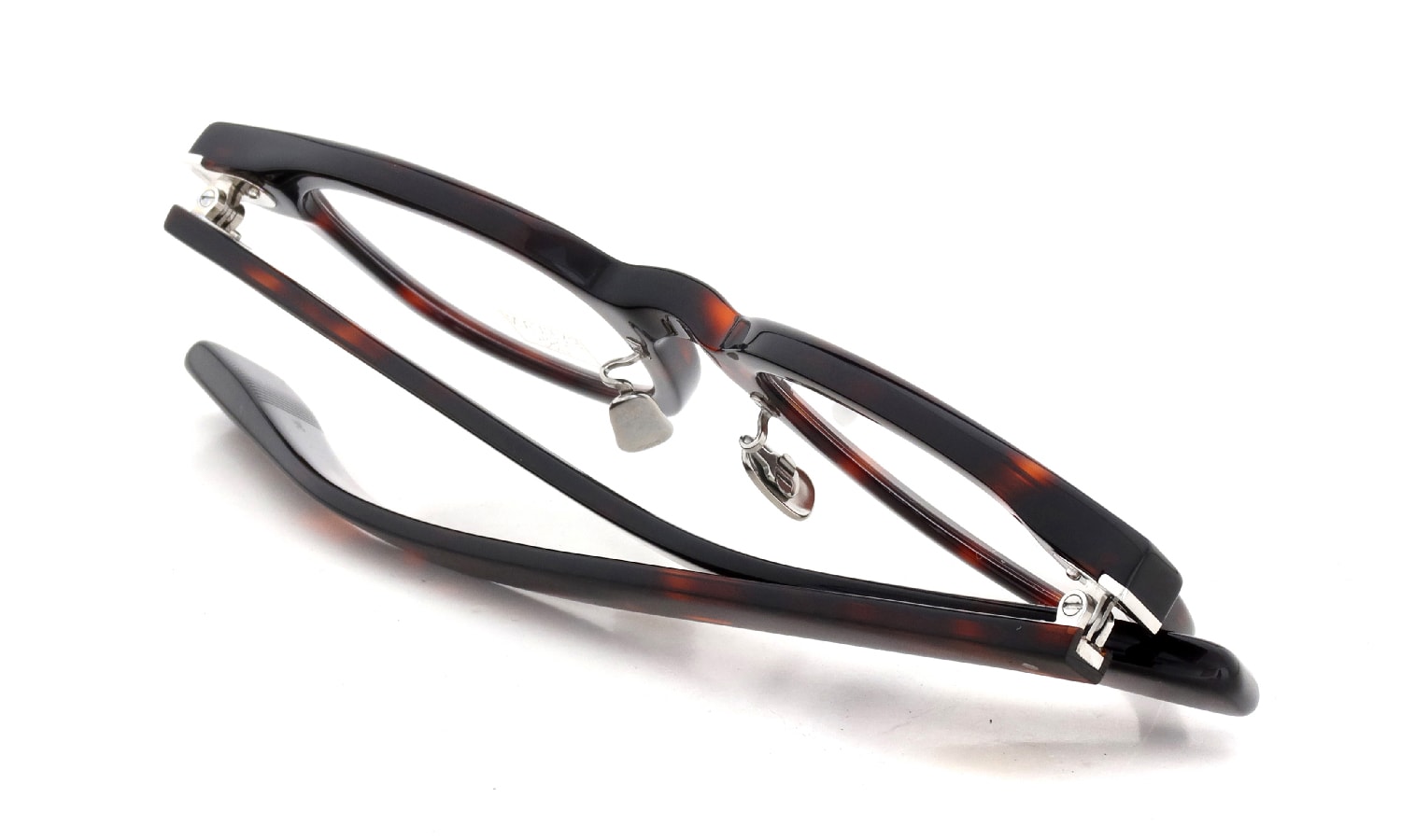The hinge connecting the front and temple parts is accented with a single-pin rivet. Additionally. a hidden embedded component reinforces the structure. securing the hinge on two axes for enhanced durability.