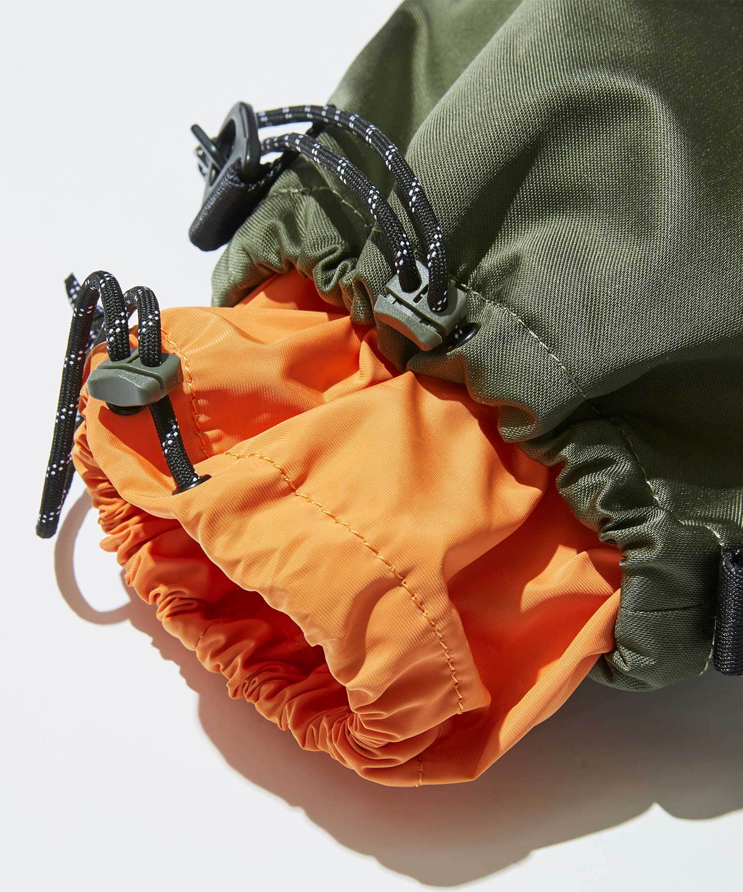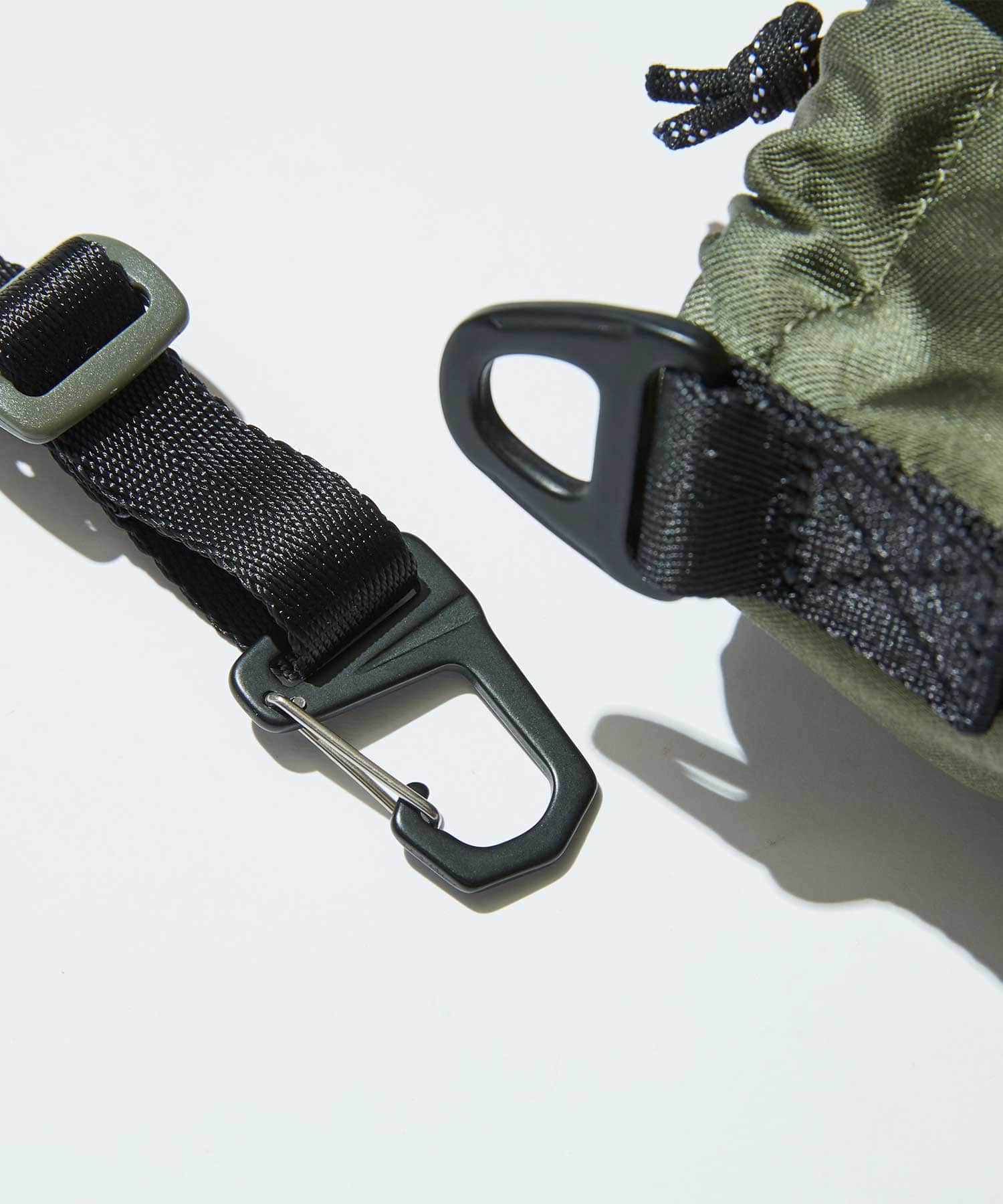 The DRAWSTRING BAG is based on a chalk bag with a round bottom and comes with a shoulder strap.