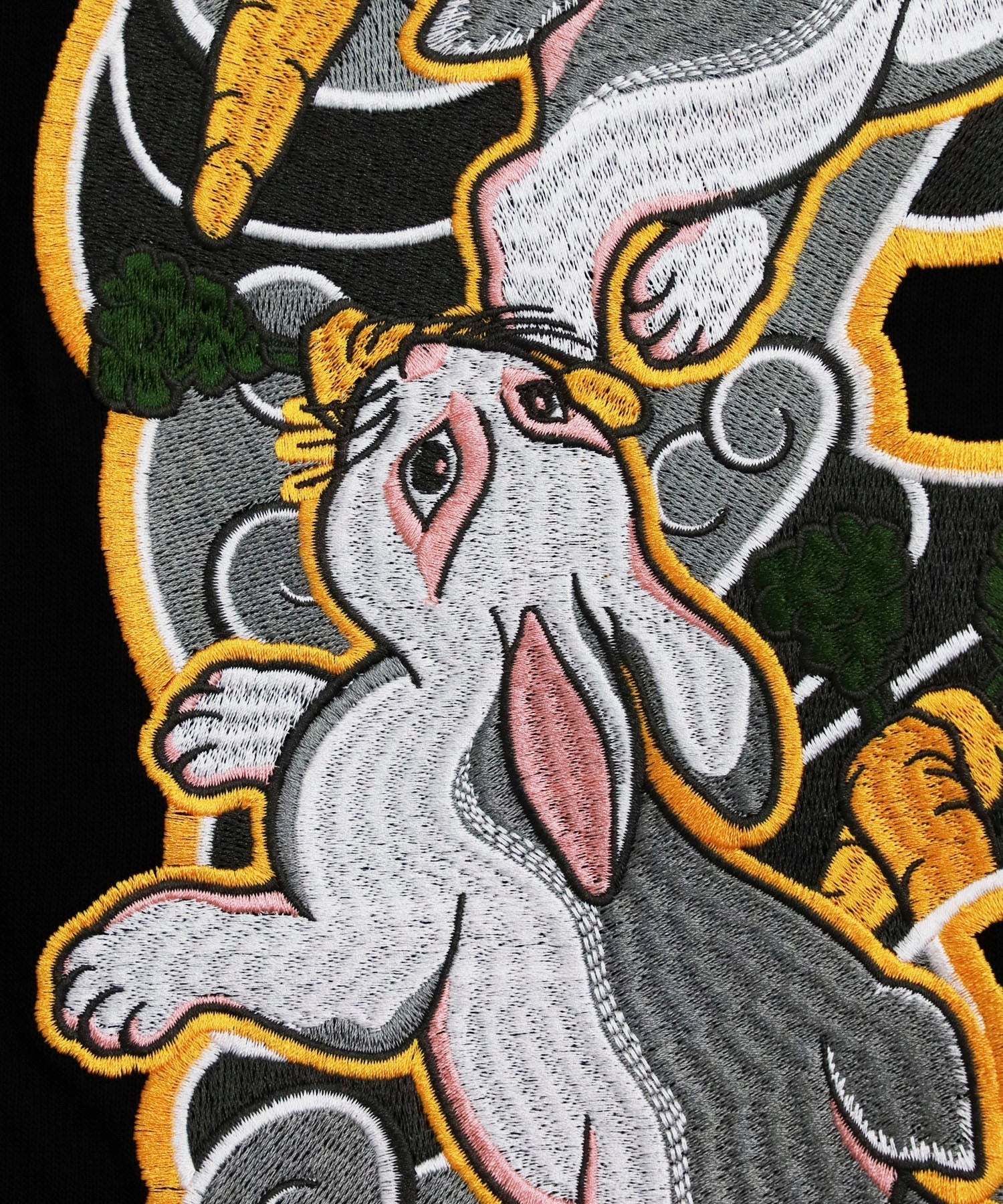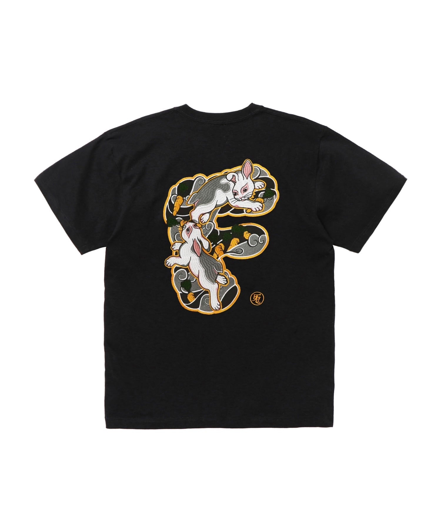 A T-shirt with a Japanese-style rabbit graphic embroidered on the back and the initial letter F. The logo is embroidered on the front.