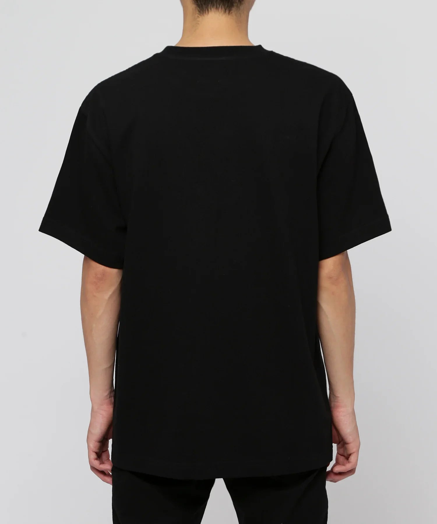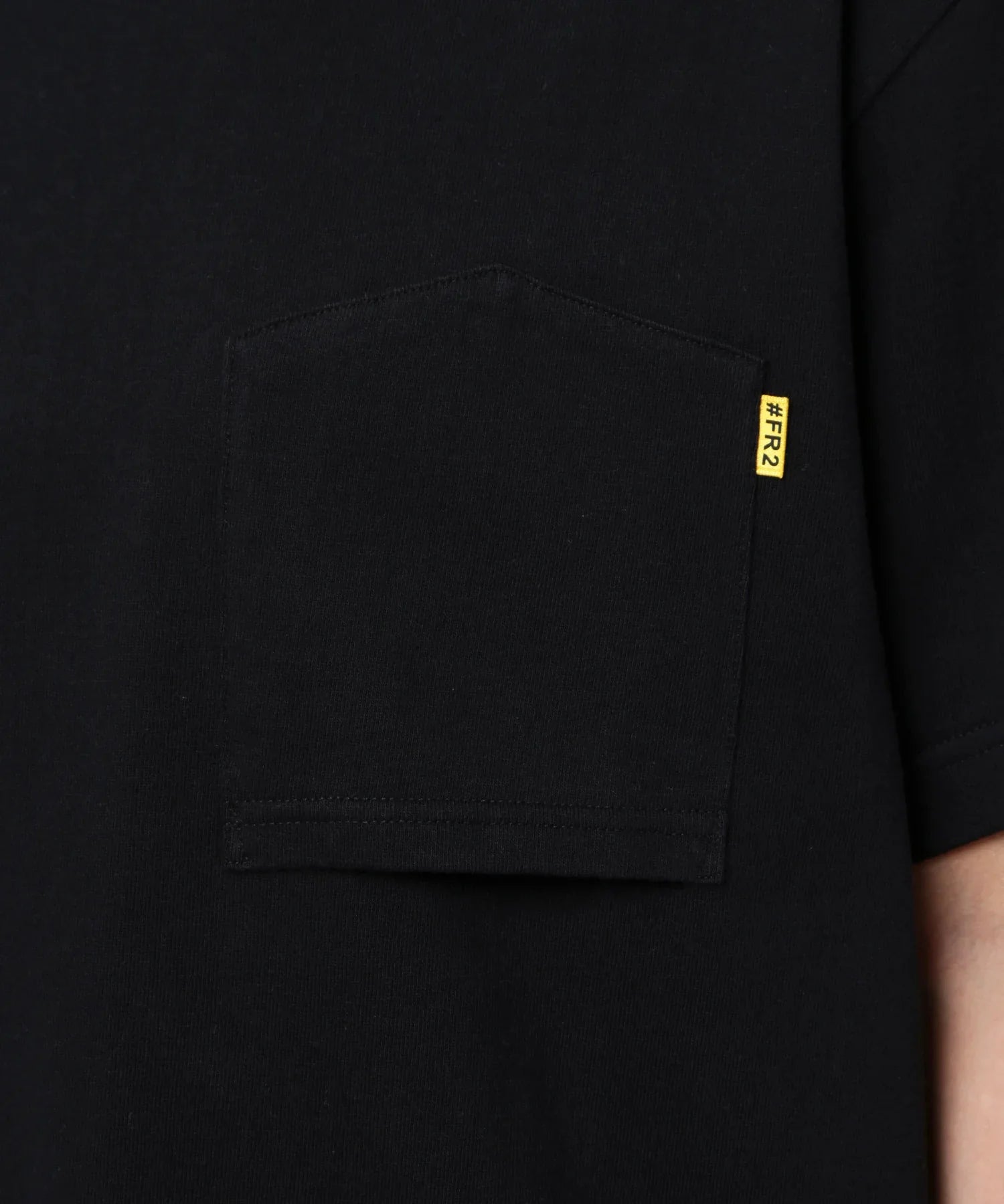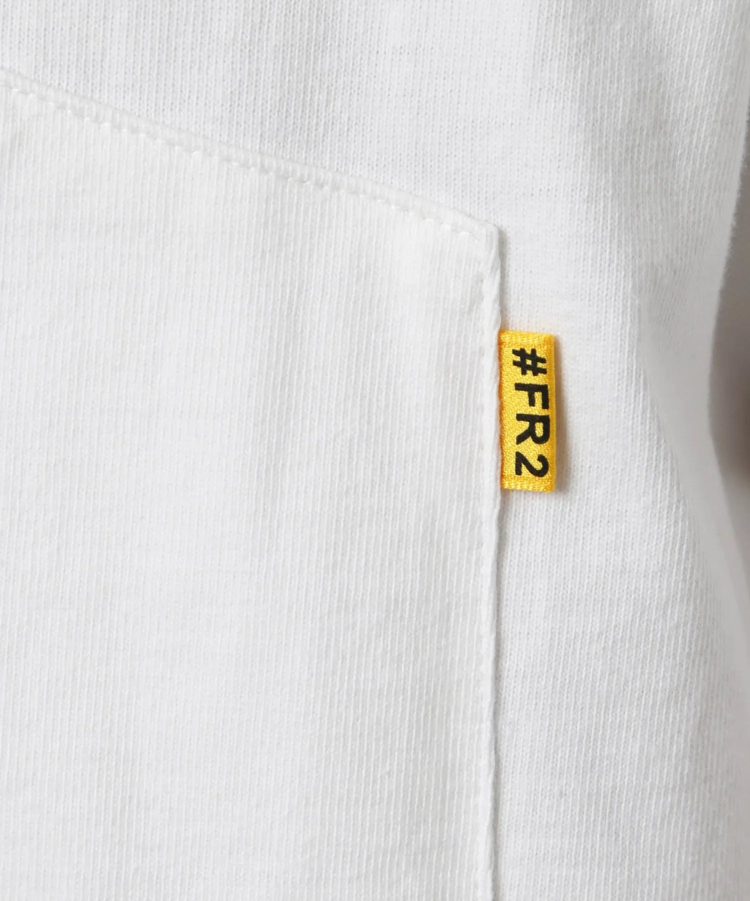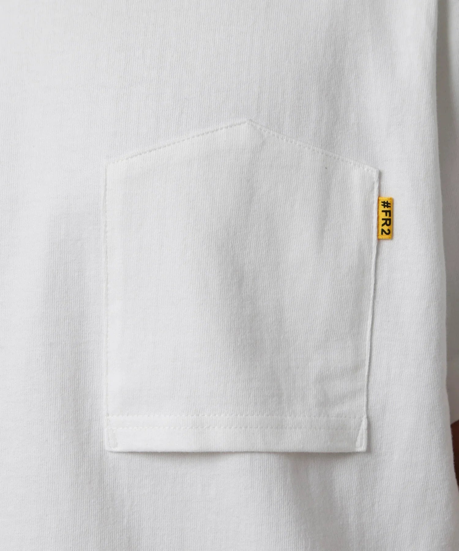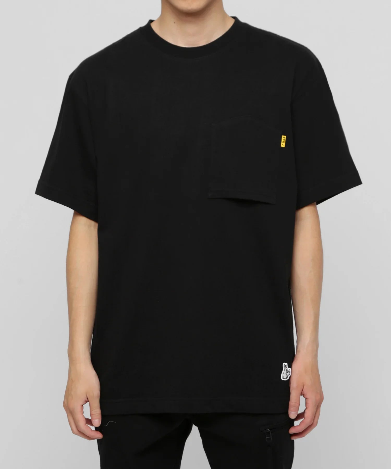 A T-shirt with a pocket of the same color as the main body attached to the left chest. The pocket is attached upside down. making it a simple yet playful # FR2 item. You can wear it as a single piece. or even use it as an inner for all seasons. The reverse pocket is a casual accent.