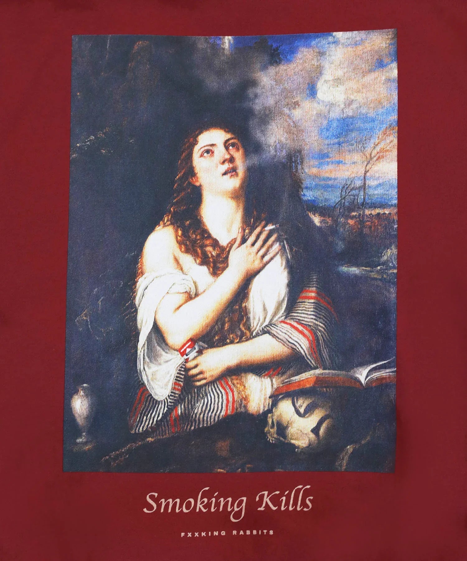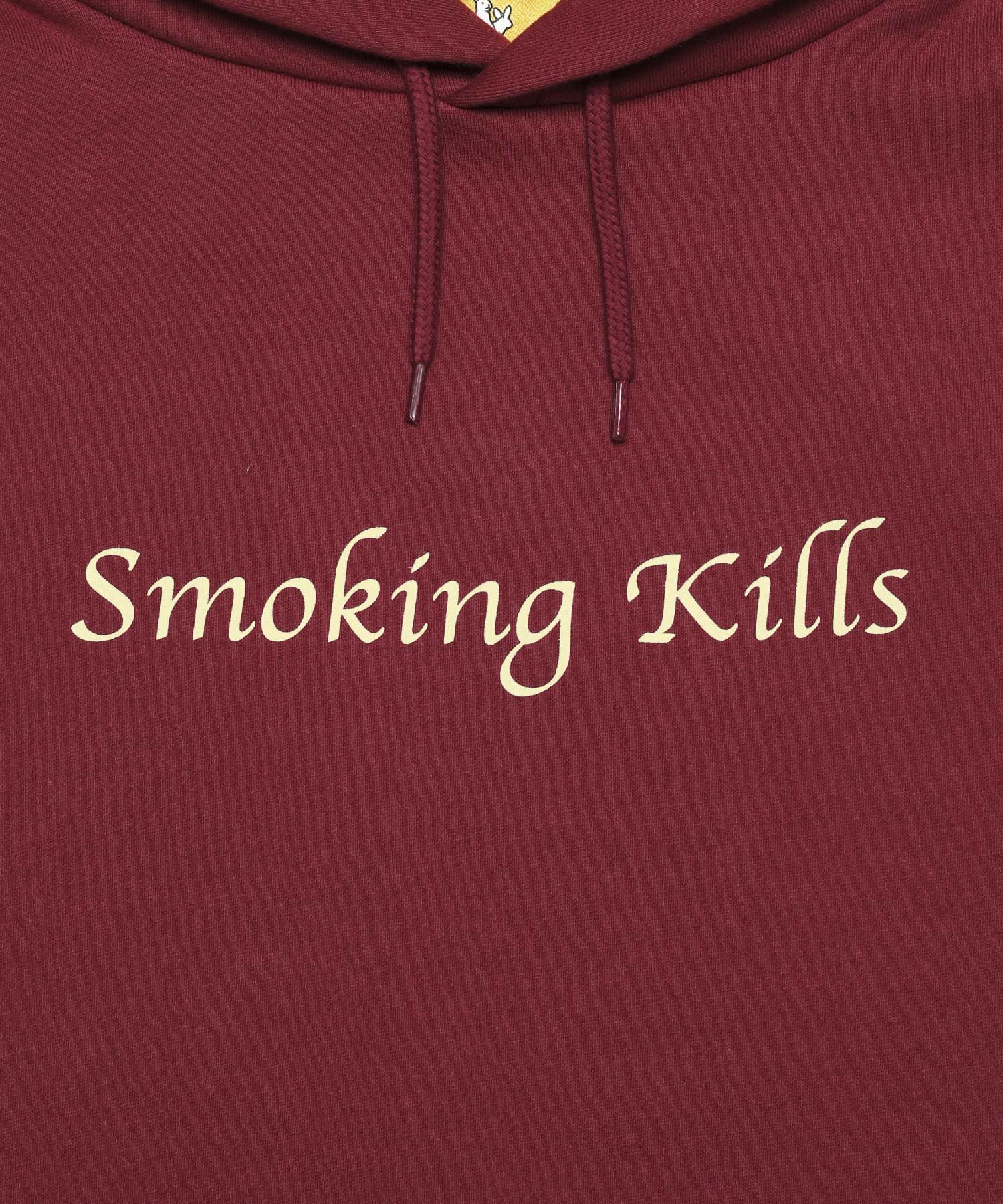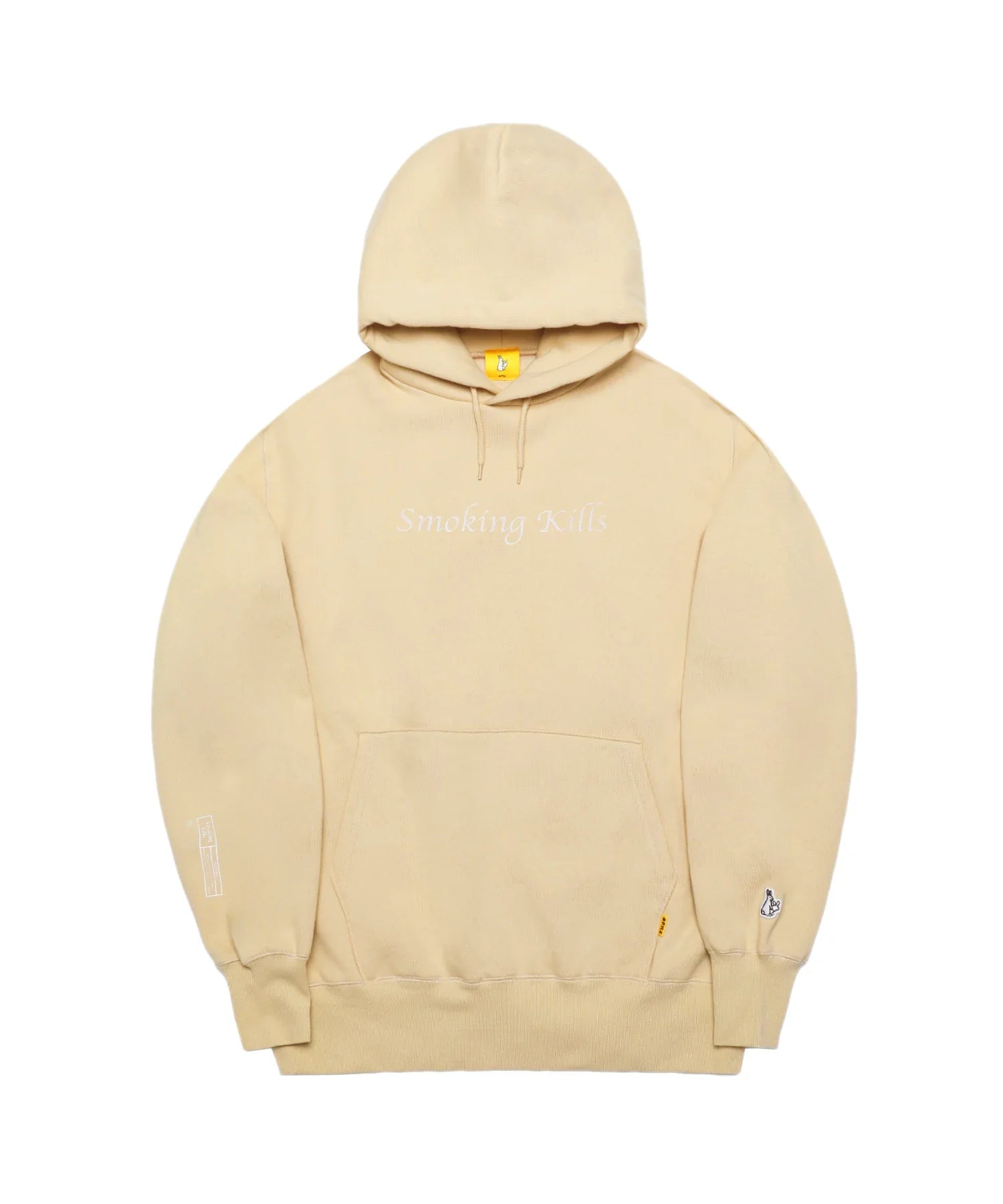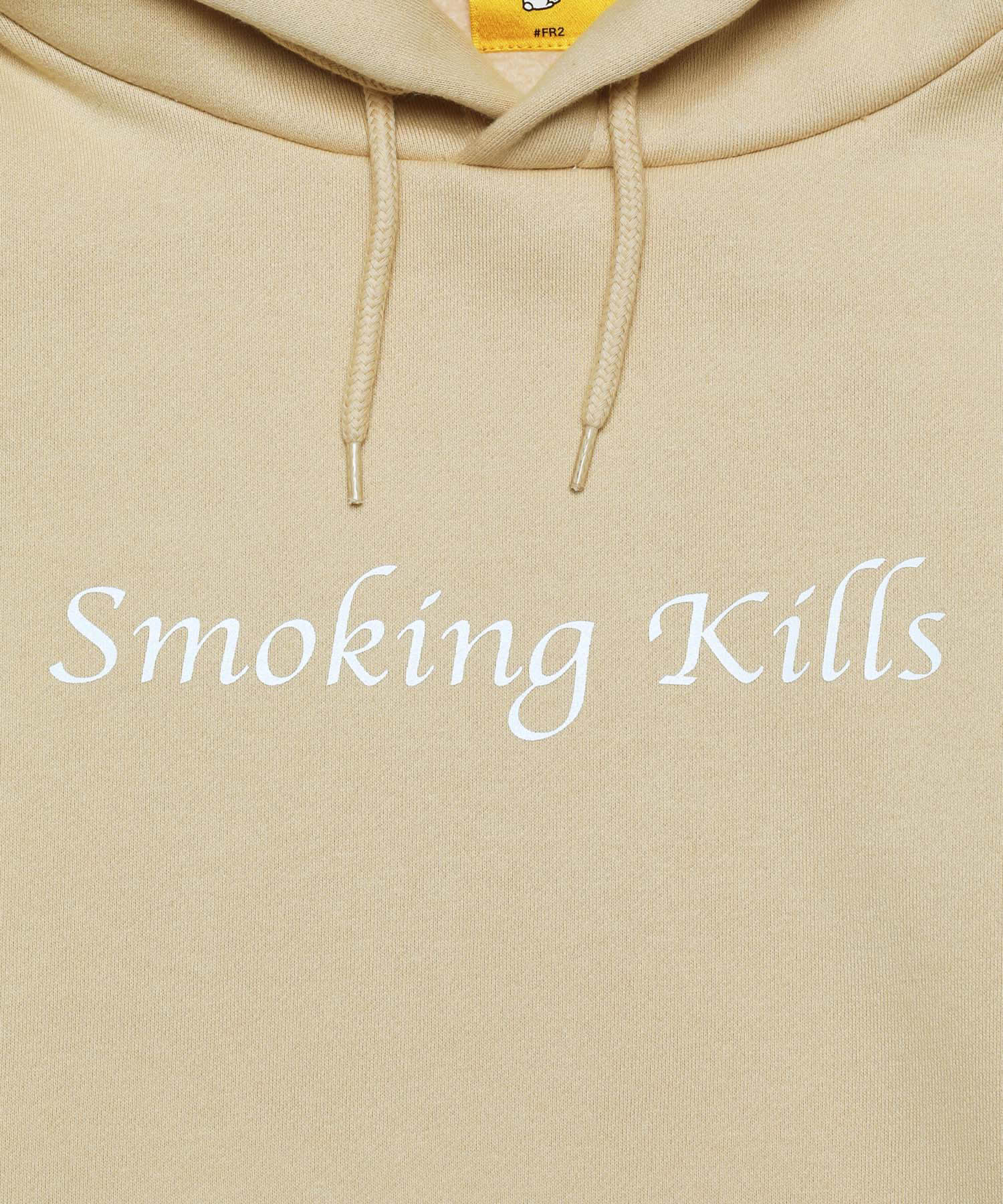 A Hoodie with a large print on the back that looks like a painting. The "Smoking kills" logo is also placed on the front. and it is a piece full of messages like # FR2.